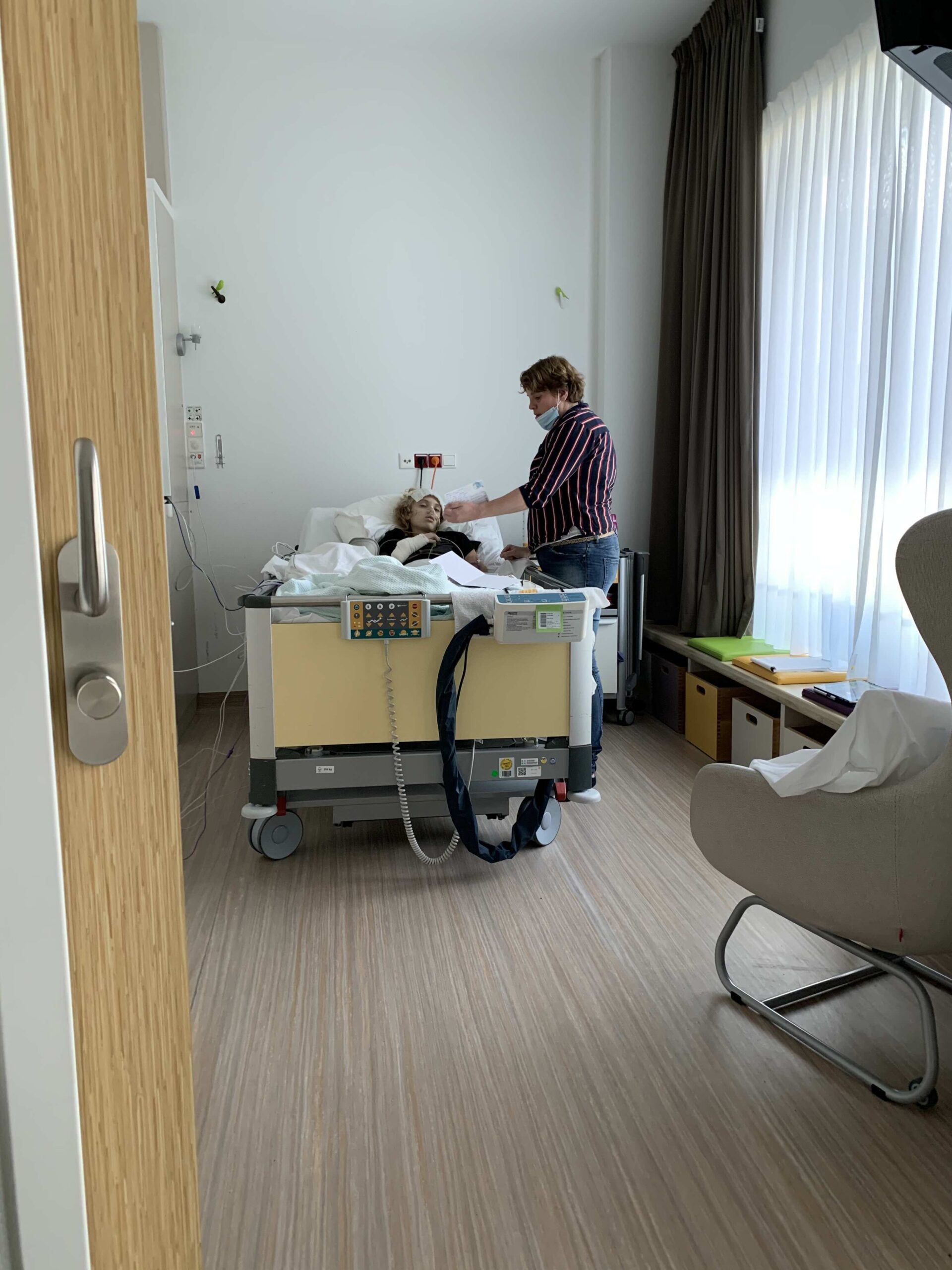 • fysio; ademhalingsoefeningen en bewegen in en uit bed omdat bewegen nog steeds erg pijnlijk en moeilijk is waarvoor Anne nauwelijks energie heeft.