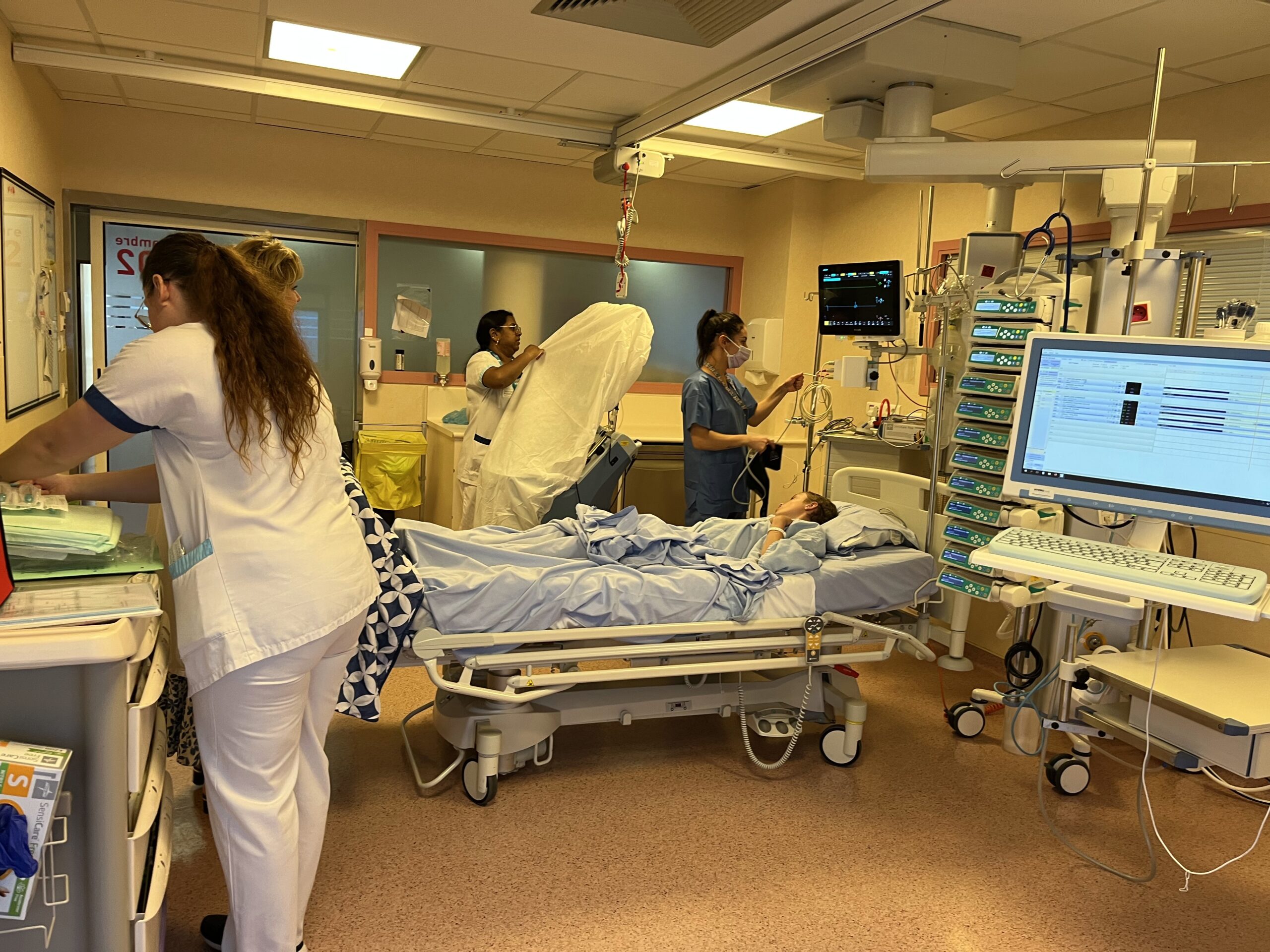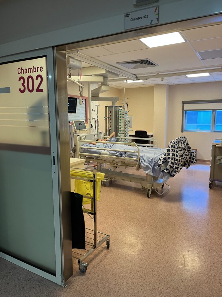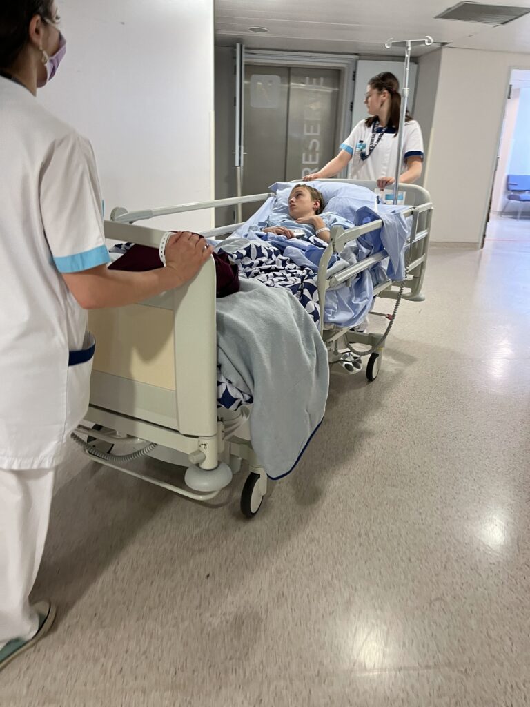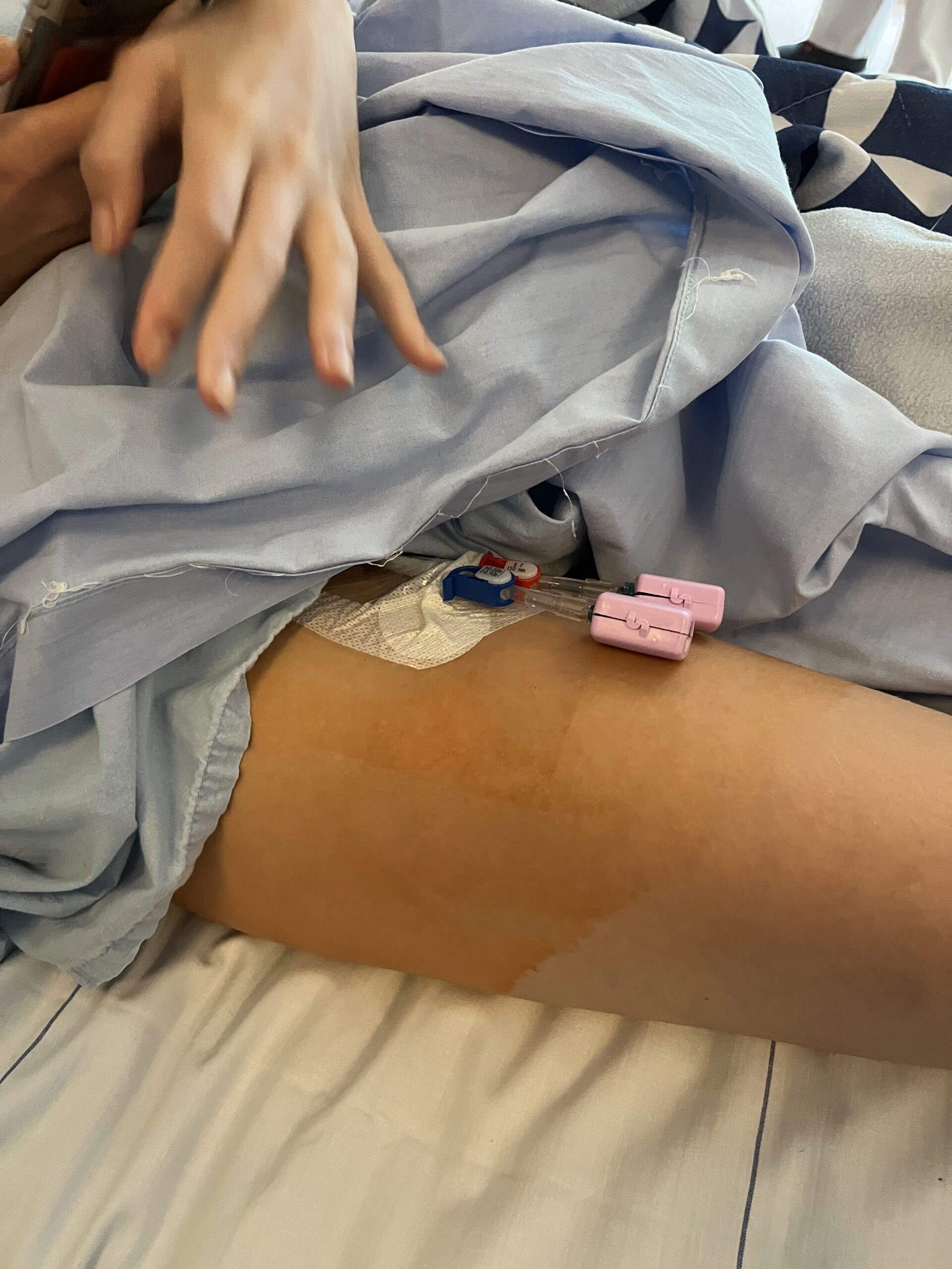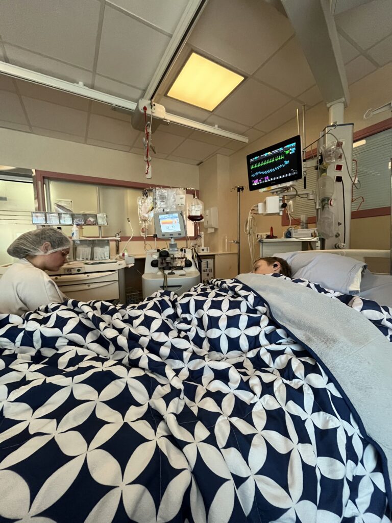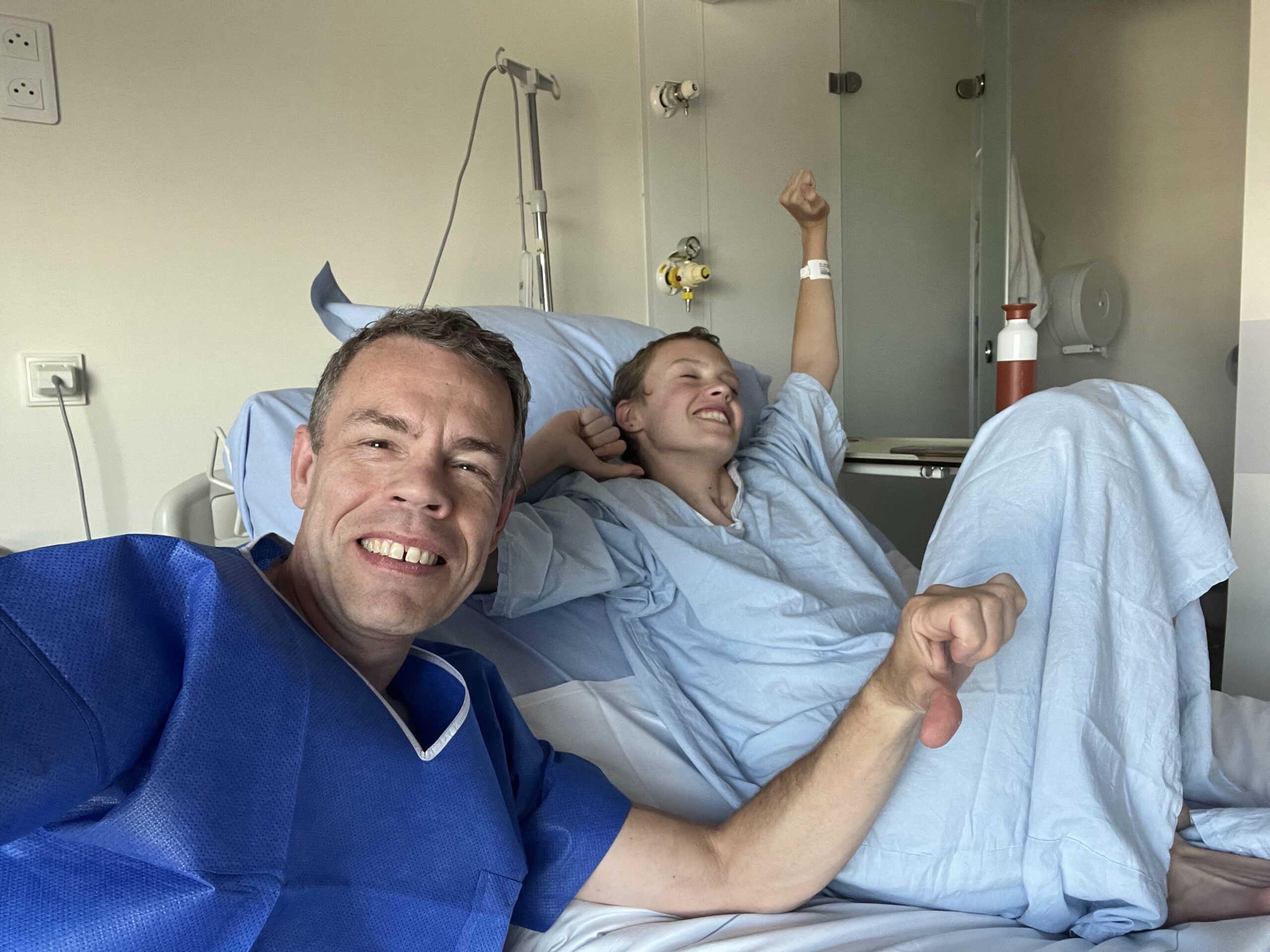 Na een nacht best wel goed slapen werden we vanochtend om 7:15 uur wakker gemaakt. We moesten ons douchen en klaarmaken voor OK en aferese op de IC. We moesten opnieuw onze mooie blauwe pakjes aan. Het is niet meteen charmant maar we zijn er inmiddels mee bekend en zien de lol er wel van in. We werden exact om 8:45 uur opgehaald maar moesten daarna nog eventjes wachten in wachtkamer van de OK. Anne maakte zich zorgen over de chirurg, vorige keer was een nare ervaring maar deze keer was gelukkig beter. Ik mocht deze keer zelfs blijven en de chirurg was een aardige man en zijn assistente was ook aardig. Op verzoek van Anne werd er vrolijke muziek opgezet waar de chirurg al meezingend (en half meedansend) zijn werk ging doen. De katheter werd onder plaatselijke verdoving geplaatst. Bij vlagen was het wel pijnlijk maar al met al verliep het vlotjes en soepeltjes.