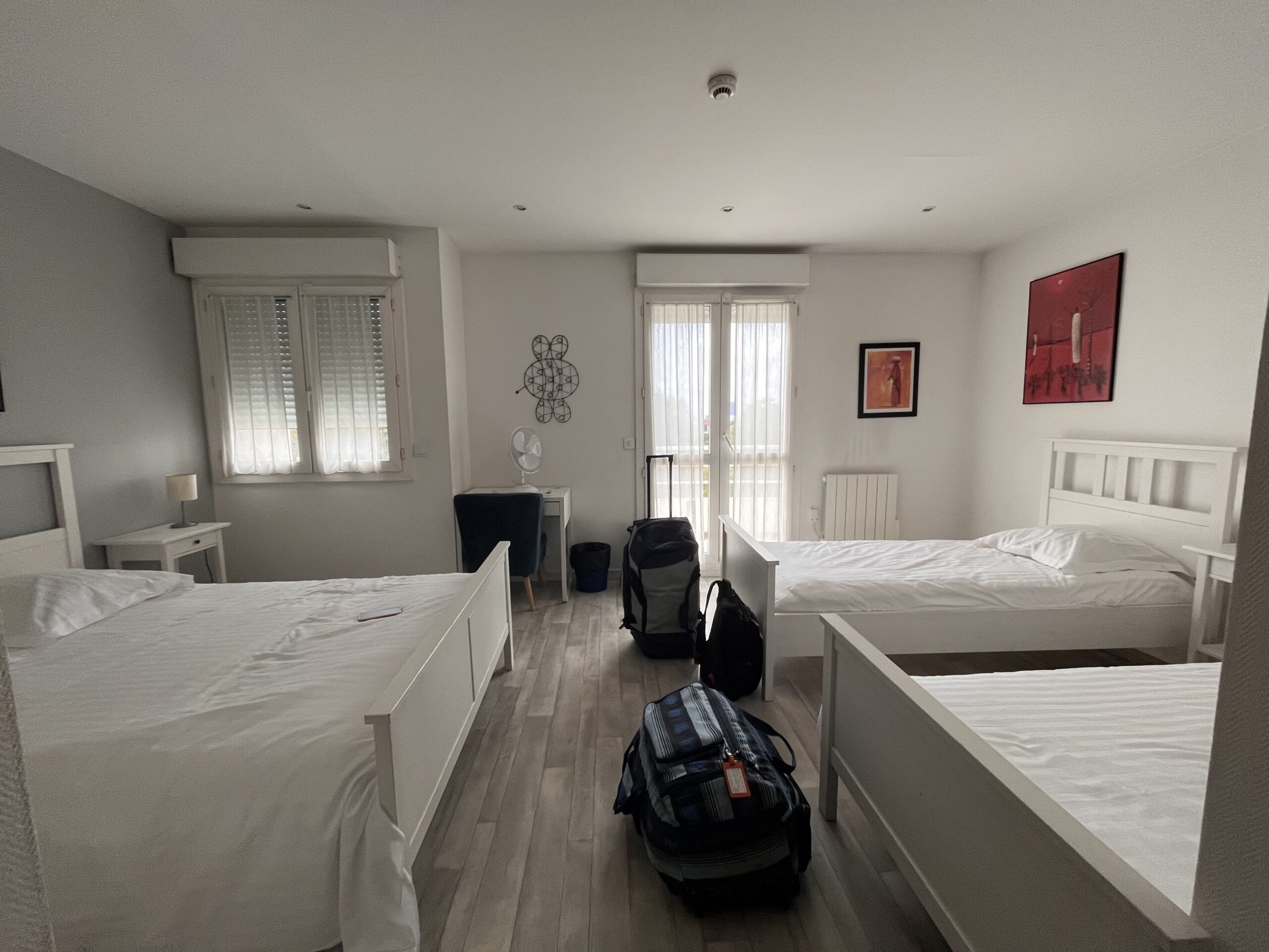 Rond 16:45 uur komen we aan op Gare Du Nord en stappen we zo snel mogelijk uit om op tijd bij onze taxi te zijn. Anne dacht in de app te kunnen zien waar de taxi stond geparkeerd en liep zelfverzekerd die kant op. Leek mij niet helemaal goed gaan dus de taxi chauffeur gebeld en die bleek pal voor de uitgang van het station te staan en dat hadden wij dus even gemist. Gelukkig sprak hij een beetje Engels dus we hadden elkaar snel gevonden. Zo’n 50 minuten later kwamen we aan bij het Ronald McDonald huis dat naast het terrein van het ziekenhuis staat. Daar worden we begroet door Marion die heel goed Engels spreekt en moeten we eerst een rits documenten invullen en ondertekenen. Na de eerste aanbetaling gedaan te hebben krijgen we een rondleiding door het huis. Het is een heel mooi huis; Er is een bioscoopkamer, een bibliotheek, een stilte/werkkamer een hele grote mooie keuken, een inloopkoelkast, een wasserette en zelfs een fitnessruimte. Onze kamer ligt op de 2e verdieping en vandaar kunnen in de verte zelfs de Eiffeltoren zien. Wij krijgen kamer 20 met de naam Achille Talon. Een mooie grote kamer met twee 1-persoonsbedden en een 2-persoonsbed. Het is er wel warm (het is vandaag 35 graden in Parijs) en helaas is er geen airco dus krijgen we van Marion een kleine ventilator. Het doet niet veel maar het is iets.