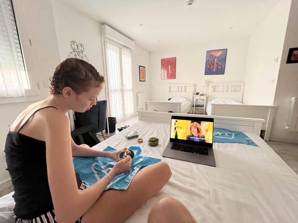 Vanochtend had Anita thuis pasta pesto voor ons gemaakt dus dat hebben we in onze kamer opgegeten terwijl we naar een aflevering van onze spannende serie hebben gekeken. Daarna nog even videobellen met Anita en Stan. Nu is Anne nog even aan het lezen maar we gaan wel op tijd slapen want onze wekker staat op 6 uur omdat morgen om 7:30 uur al in het ziekenhuis moeten zijn voor de MRI-scan.