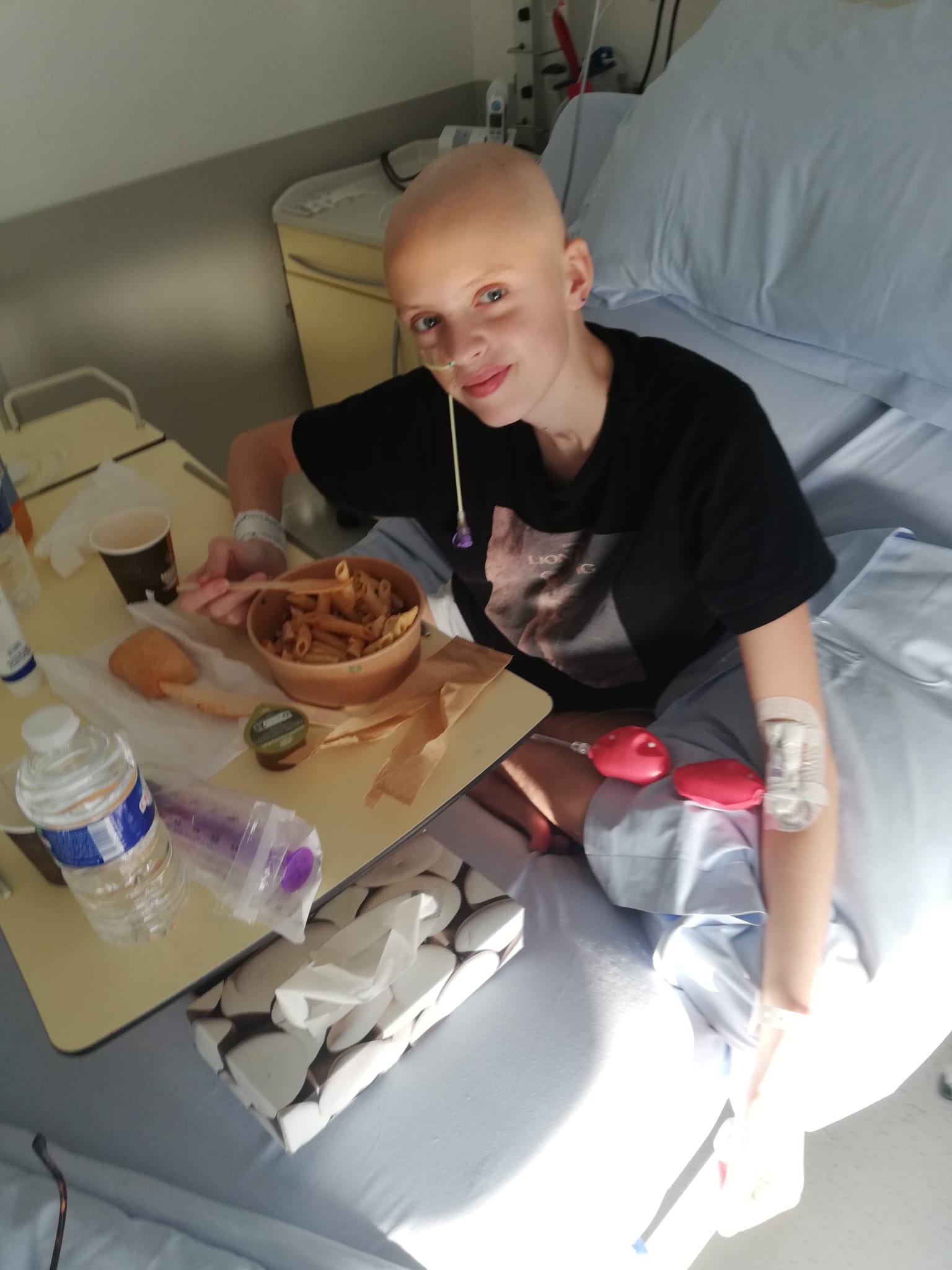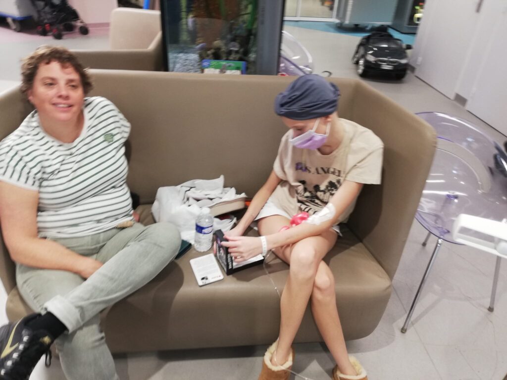 We hadden aan de dokter gevraagd of Anne over de gang mocht lopen om er even “uit” te zijn. Toen dat goedgekeurd werd, gingen we op weg naar de speelkamer waar een lekkere stoel staat. Maar helaas de kamer was vol met kinderen die aan het knutselen waren. Toen maar een bankje op de gang opgezocht en een kaart Black Story gespeeld.