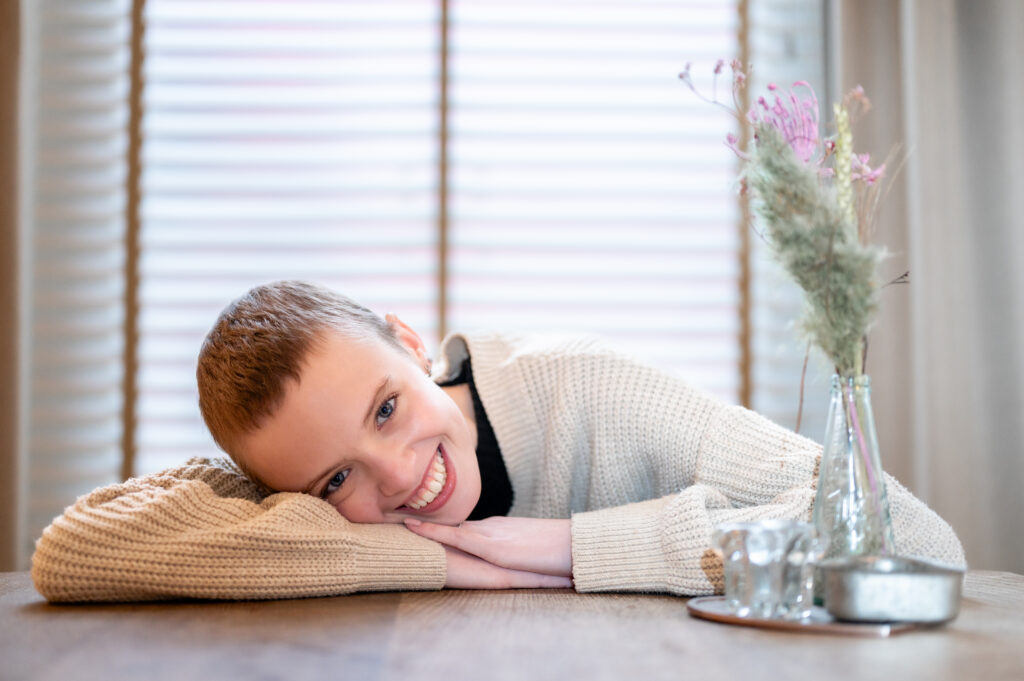 De foto voor de kaart is heel snel gekozen. Het moest sowieso een foto vanuit de fotoshoot met Ilva worden. We begonnen met een staande foto die ik ook in het dagboek heb gebruikt. Een prachtige foto maar de foto die we uiteindelijk hebben gekozen vertelt eigenlijk nog veel meer. Dit was een houding die Anne vaak aannam, zeker als ze moe was en/of pijn had. Dan lag ze zo met haar armen op de tafel en ja, ondanks de moeheid en de pijn had ze dan alsnog die stralende lach en het sprankelende gezicht. Er straalt zoveel moois, zoveel kracht en zoveel liefde uit dat de keuze heel snel was gemaakt. Te horen aan de enorme hoeveelheid reacties op deze foto denk ik te kunnen stellen dat iedereen het erover eens is dat dit een schitterende foto is die in 1 oogopslag laat zien hoe mooi Anne is.