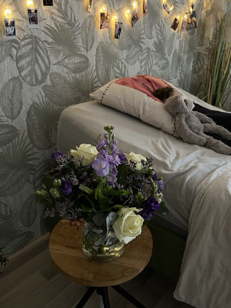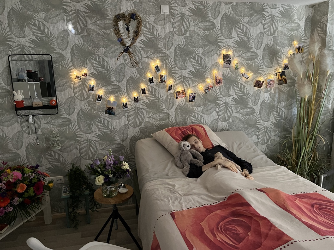 De kamer van Anne was dinsdagochtend nog een beetje kaal. We waren eigenlijk nog midden in een opknapbeurt van haar kamer. Er waren 2 muren opnieuw behangen maar daardoor dus nog wel kaal en voor de andere 2 muren hadden we net vorige week samen met Anne nieuw behang gekocht. Vanaf dinsdagochtend hebben we iedere dag de kamer wat mooier gemaakt door een spiegel op te hangen, wat plantjes neer te zetten maar vooral door heel veel foto’s op te hangen. Boven het bed achter Anne hebben we een verlichte slinger opgehangen met allemaal kleine en wat grotere foto’s op te hangen die door Anne werden gekoesterd en door ons zijn gevonden in haar bureaulades. Een prachtige collage van foto’s voor haar ziek zijn met vrienden tot aan het laatste moment met familie en vrienden. In deze week hebben we heel veel prachtige bloemen en boeketten gekregen. Zoveel dat de kamer van Anne al heel snel echt een hele mooie warme uitstraling kreeg. De rest van de bloemen hebben we beneden in de hal en in de kamers gezet zodat we ons ook daar omringd voelen door jullie liefde en meeleven.