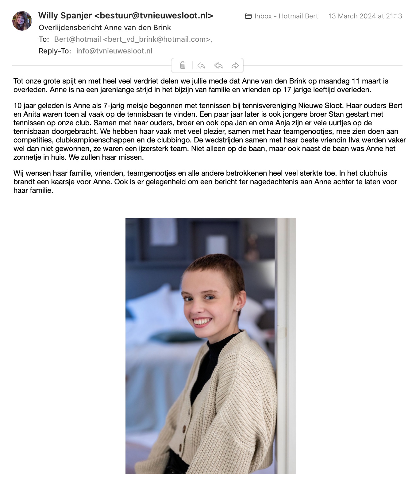 Ook vanuit de tennisvereniging krijgen we vanuit alle hoeken heel veel medeleven. Gelukkig niet alleen voor ons maar ook voor Stan. In eerste instantie weet Stan zich daar niet goed raad mee maar inmiddels kan hij het erg waarderen dat zijn vrienden er voor hem willen zijn en ook dinsdag naar de uitvaart van Anne komen om er te zijn voor Stan. In de tennishal is een hoekje ingericht om Anne te herinneren en naar alle leden is een prachtige persoonlijke mail verzonden. Heel fijn, het is toch al weer ruim 3 jaar geleden dat Anne actief aan het tennissen was maar ze is nooit vergeten. Nu ik dit opschrijf voel ik meteen weer pijn en verdriet dat dit alles niet meer is en nooit meer zal komen. Wat heeft Anne (en wij ook) mooie tijden beleefd bij de tennis. Het fantastische groepje waarmee Anne trainde en competitie speelde. Op de zondagen met de ouders (iedereen was er altijd) langs de zijlijn. Anne en Ilva die elkaar daar hebben leren kennen als vriendinnen. Dierbare herinneringen waar we met heel veel plezier op terugkijken.