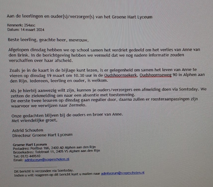 In afgelopen dagen hebben we een aantal keren contact gehad met school. Wat zijn die mensen toch fantastisch! Er is meteen een lokaal ingericht als stilteruimte en herdenkingsruimte waar alle leerlingen iets mogen achterlaten voor Anne. Dinsdag het 4e uur hebben ze in iedere klas dezelfde tekst voorgelezen, hebben ze een brief naar alle leerlingen en ouders verzonden en hebben ze een hele mooie persoonlijke advertentie in het Algemeen Dagblad van zaterdag 16 maart gezet (zie foto’s hieronder). Vrijdagmiddag kwamen Esther (afdelingsleider), Wendy (ondersteuningscoördinator) en Lydia (mentor) bij ons thuis om afscheid te nemen van Anne. Met deze drie mensen hebben we afgelopen periode intensief contact gehad en ze hebben er echt alles aan gedaan om het voor Anne zo goed en comfortabel mogelijk te maken. Dat heeft Anne en ons heel veel rust gegeven en daar zullen we ze altijd dankbaar voor blijven. Vrijdagmiddag kwamen er ook 6 vriendinnen van school om afscheid te nemen van Anne. Ze hadden o.a. een prachtige vaas bloemen meegenomen met aan de bloemen persoonlijke kaartjes van de leerlingen. Wat een prachtige school, wat een prachtige mensen, wat een prachtig gebaar. Heel dankbaar voor!