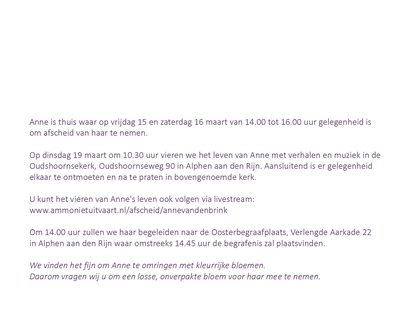 Als de catalogus met rouwauto’s op tafel ligt worden wij daar niet blij van. De enige auto waar we een beetje op aanslaan is een oude VW-bus. Als deze in hippie-kleuren was geweest dan was de keuze makkelijk maar de bus was donkergrijs en was het daardoor ook niet. Esther kijkt naar ons en zegt “ik denk Anne inmiddels al aardig te kennen door jullie verhalen, de enorme lading aan bloemen en kaarten en vooral de stralende foto’s van Anne. Ik denk dat ik een veel beter idee heb en qua kosten is dat gewoon precies hetzelfde als een auto”. Ze laat een filmpje zien van vervoer per boot. Dit heeft ze onlangs zelf bedacht in samenwerking met Boats&Bites en dit filmpje van een gesimuleerde uitvaart was ook opgenomen vanaf de Oudshoornse kerk. Anita en ik werden meteen geraakt, wat mooi, dit is nu typisch Anne. We hadden dit nooit zelf kunnen bedenken, wisten niet eens dat het kon maar we weten zeker dat Anne het hier 100% mee eens zou zijn. Dit gaan we doen. Met boot vanaf de kerk helemaal naar de begraafplaats, wat een goed idee. Nu maar hopen dat het weer ook gaat meewerken.
