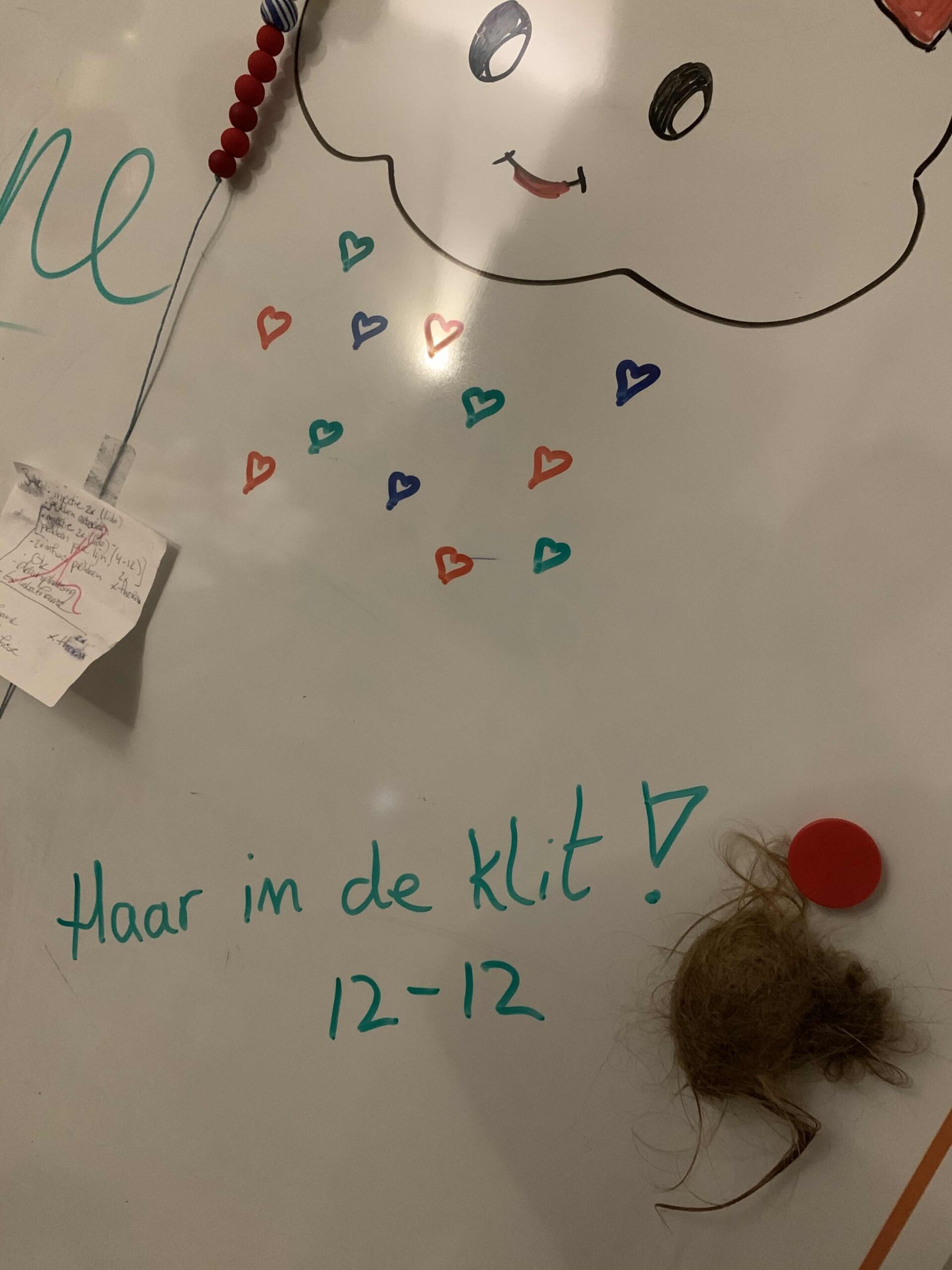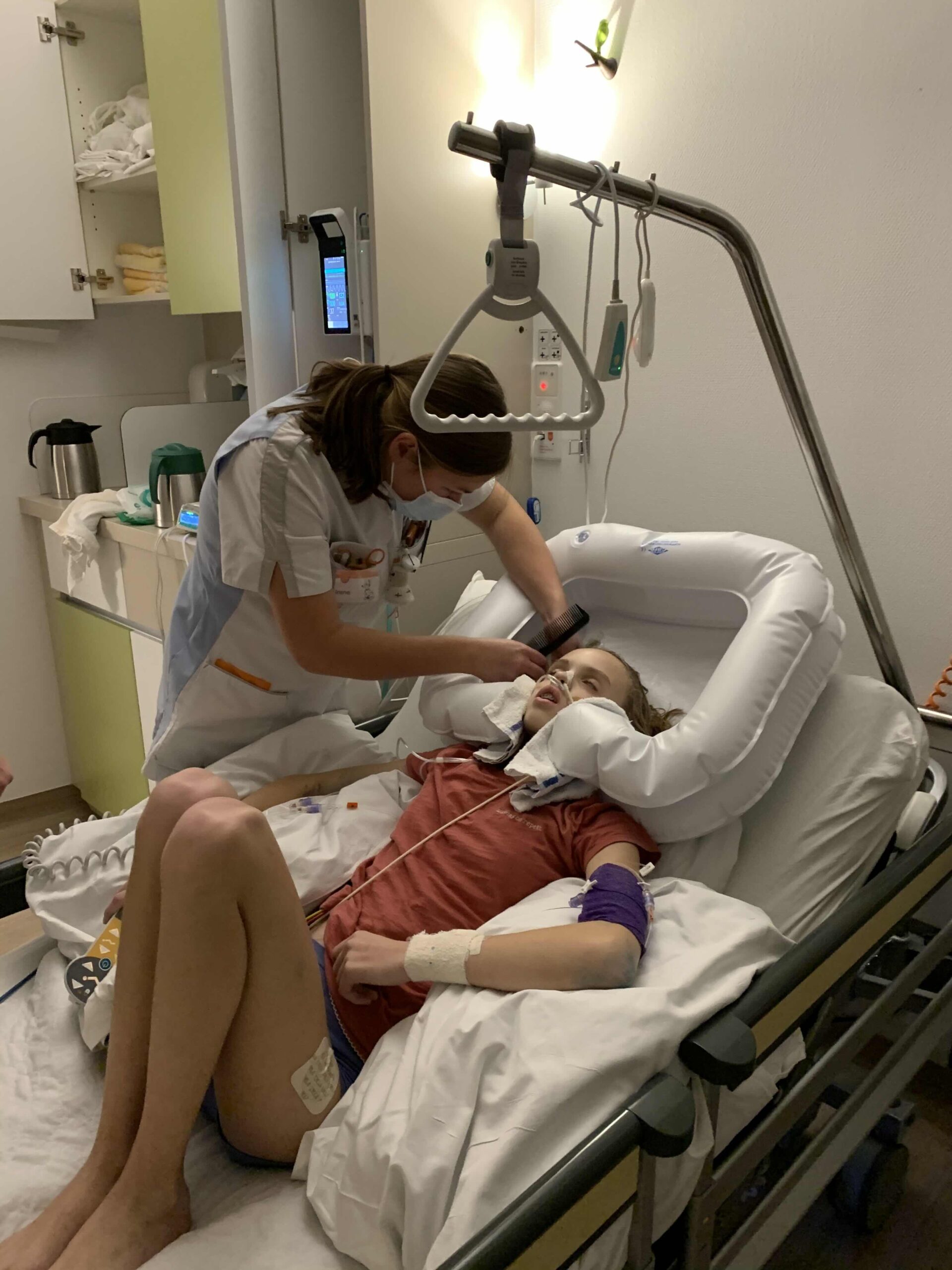 Vanmiddag is de pedagogisch medewerker geweest om met Anne te praten over de mogelijkheden m.b.t. het haar; Pruik of Toupim. Als ze voor de Toupim kiest dan moet die keuze voor de 2e chemo (in principe 26 december) gemaakt worden. Best een moeilijk onderwerp voor Anne. Vandaag stond sowieso in het teken van het haar. De rechterkant is een grote klit geworden en daar is door verschillende mensen in totaal zeker zo’n anderhalf uur aan gewerkt maar we kregen het niet voor elkaar. De klikt (zo groot als een muis) is er voorzicht uitgeknipt zonder dat het heel erg opvalt.