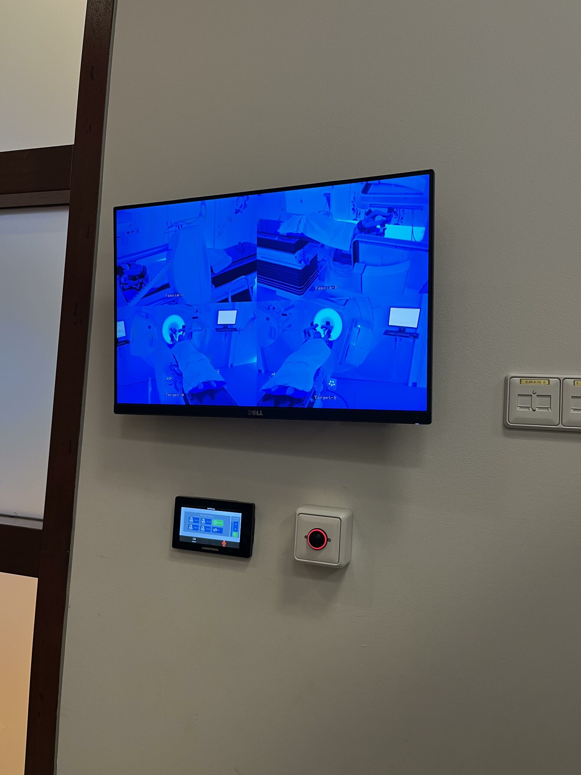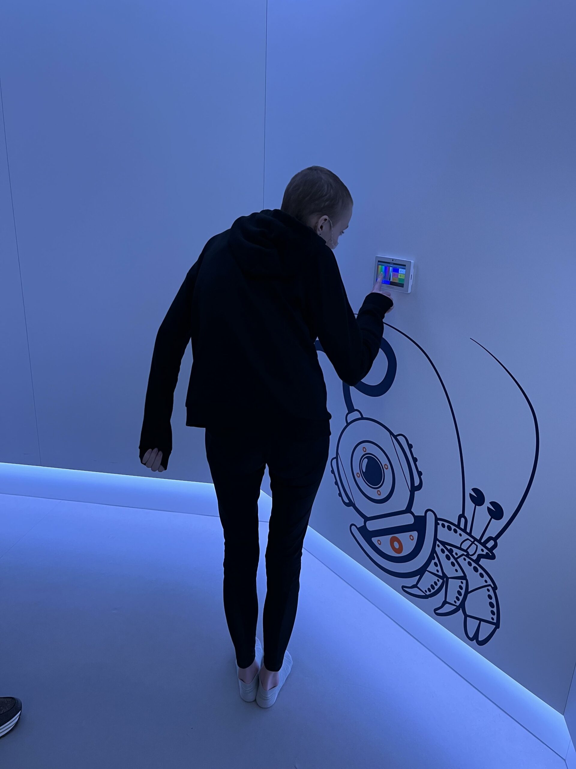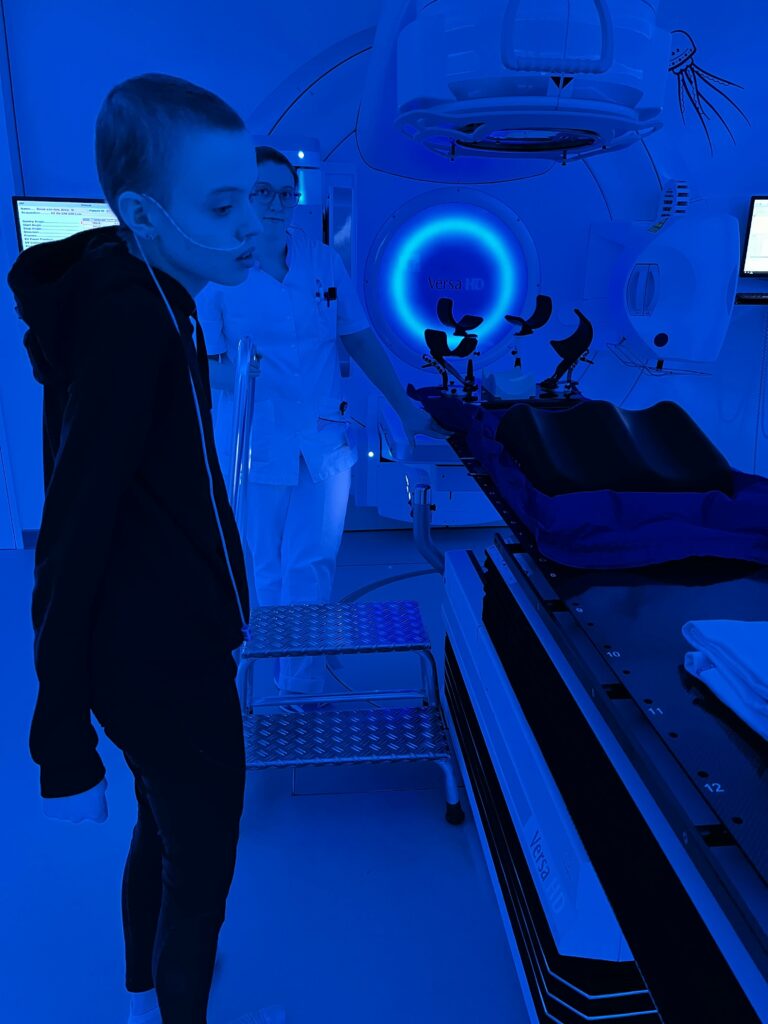 Na het gesprek gaan nog even wat eten in het restaurant van het PMC en haalt Anita nog wat medicijnen op bij de apotheek. Daarna gaan we met de auto naar het UMC voor de 1e bestraling. Dokter Hoeben wacht ons op. Het is allemaal meteen weer heel herkenbaar. Anne geeft mij de telefoon waarop de radiotherapie playlist van 2 jaar geleden staat. Bij het binnengaan van de kamer mag Anne weer een kleur van de verlichting kiezen. Met aangemeten matras ligt al klaar. Voor de bult knippen ze een ‘nep’ huid van siliconen om de huid te beschermen en dan begint het afstellen van het apparaat m.b.v. de markeringen op het lichaam van Anne. Als alles goed is ingesteld moeten Anita en ik een kamertje verderop wachten en kunnen we alles via een scherm volgen. Het gaat hartstikke goed en gaat allemaal veel sneller dan verwacht, binnen een kwartier is alles gepiept en zit de eerste van drie bestralingen er al weer op.