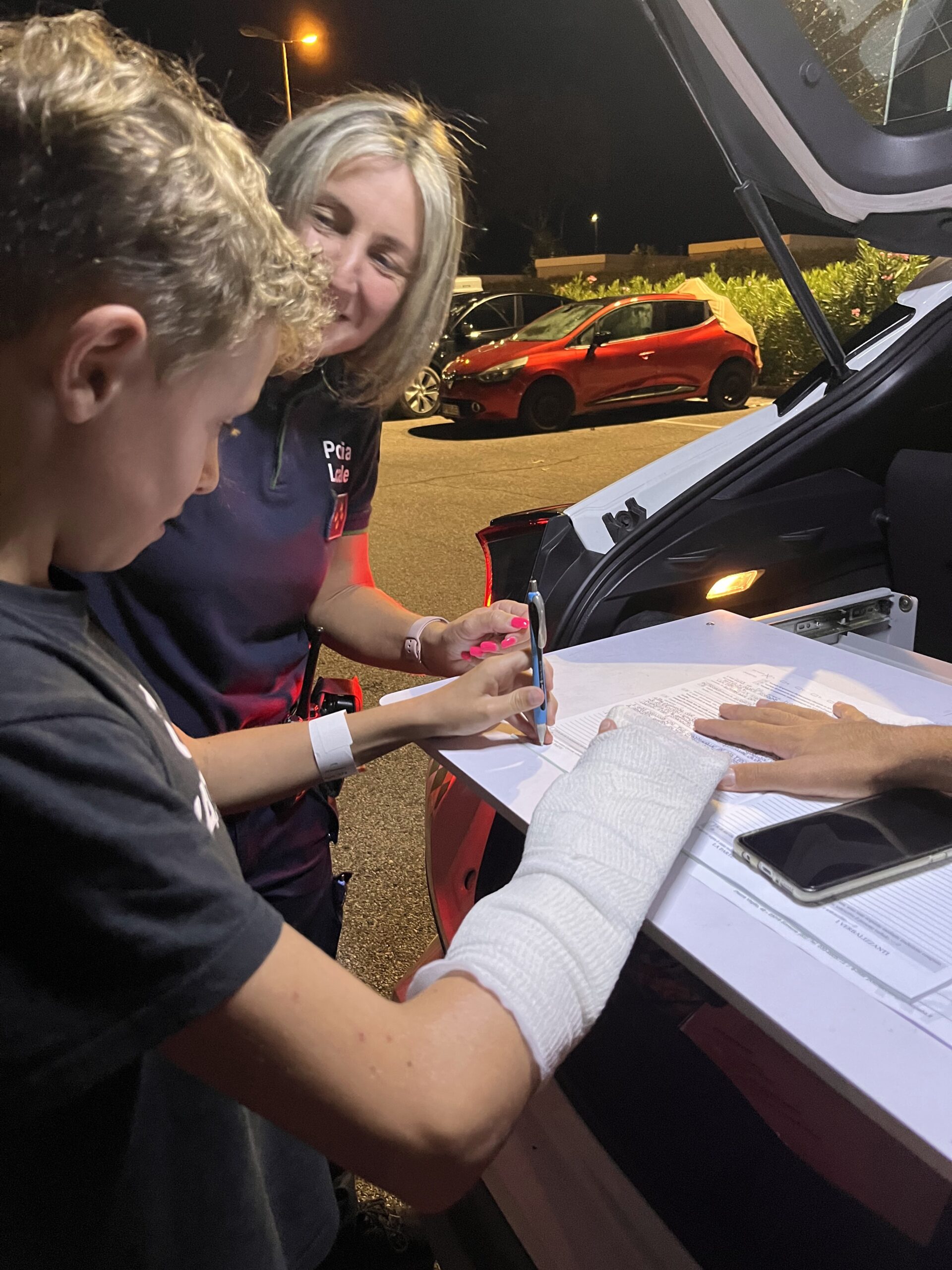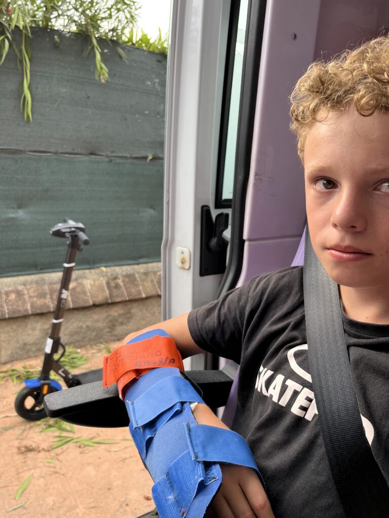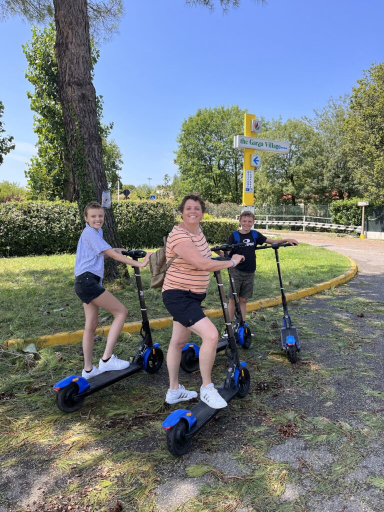 Omdat onze auto onbruikbaar is geworden en we toch boodschappen moeten doen besluiten we (eigenlijk tegen onze principes in) op de camping 4 elektrische steps te huren om boodschappen te kunnen gaan doen in het dorp. De kinderen wilde al eerder op deze steps maar ons antwoord was toen nee dus dit vonden ze wel gaaf. Toegeven, het blijkt een prima vervoermiddel te zijn en als we na onze boodschappen terugkomen op de camping vragen de kinderen of ze met z’n tweeën nog even een rondje mogen doen. Ik was niet enthousiast maar dacht ook “ik moet het ook een beetje loslaten en ze vertrouwen”. Na een duidelijk “doe voorzichtig en doe geen gekke dingen” gaan ze op pad. Terwijl ik aan de telefoon zit met Arjan krijgen we nog geen 3 minuten later een telefoontje van Anne. Of ze zo snel mogelijk willen komen want Stan is gevallen. Ze blijken zo’n 1 a 2 kilometer bij een rotonde te zijn waar Anita en ik naar toe rennen. Daar aangekomen blijkt het ernstiger te zijn dan alleen gevallen. Bij het oversteken van het zebrapad is Stan (weliswaar zachtjes) aangereden door een auto en daarna is hij gevallen. Stan huilt en trilt over zijn hele lichaam. Het is niet alleen de pijn maar ook de schrik. De mensen die in de auto zaten hebben de politie en de ambulance gebeld. Het waren gelukkig hele aardige mensen. De politie en de ambulance zijn er vrij snel. De politie gaat het gesprek aan met de bestuurder en met Anita en Anne. Ik ga met Stan mee de ambulance in naar het ziekenhuis in Desenzano, een stadje zo’n 20 minuten verderop.