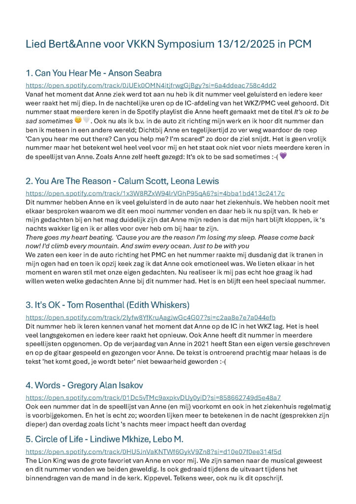 Dit jaar is wel een beetje extra bijzonder voor mij. Rond afgelopen zomerperiode is er wat intensiever contact geweest tussen mij en de werkgroep ‘Werkgroep palliatief en (na)zorg’ (https://www.kinderkankernederland.nl/werkgroep) van de VKKN om te kijken of ik daarin als vrijwilliger iets kon betekenen. De werkgroep, de mensen, de visie en het iets kunnen betekenen in een omgeving die mij na aan het hart ligt sprak (spreekt) mij erg aan maar na lang twijfelen in september toch besloten dat het voor mij nog te vroeg is om dit te doen. Wel heb ik ja gezegd op de vraag of ze mij af en toe mogen benaderen met vragen waarbij ik mogelijk iets kan toevoegen/bijdragen. Inmiddels is de eerste vraag aan mij gesteld en dat betreft deelname aan het seminar komende zaterdag. Het is maar een hele kleine bijdrage maar het is wel mooi om te doen (zie berichtje op Facebook en Instagram). Vooral de weg ernaartoe vind ik mooi. Zo begon het met de vraag een foto van mij en Anne inclusief een ‘korte’ introductietekst aan te leveren, kreeg ik de vraag zaterdag iets mee te nemen dat mij doet denken aan en/of verbindt met Anne, maar kreeg ik ook de vraag welk muzieknummer bij mijn verhaal past waar ik en/of Anne een speciale binding mee hadden/hebben. Dat zijn mooie vragen die regelmatig de nodige emoties losmaken maar je op weer een andere manier dichtbij Anne brengen. Ook de gesprekken met Marjolein en Nynke in aanloop naar zaterdag waren voor mij mooi en waardevol. Deze voorbereidingen gaan gepaard met een lach en een traan maar altijd met warm dankbaar gevoel aan de mooie herinneringen aan Anne. Tegelijkertijd moet ik ook eerlijk bekennen dat in dit proces regelmatig de ‘dolksteken’ van het missen van Anne in alles vaak zijn. Een pijn die niet weggaat, zelfs vaak erger lijkt te worden en waar ik een ‘haat’/liefde verhouding mee heb. Je wil deze pijn niet voelen en tegelijkertijd wil ik dat juist wel omdat Anne niet mag verdwijnen naar de achtergrond.