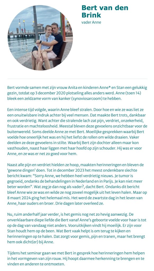 Op zaterdag 13 december 2025 vindt het seminar van de Vereniging Kinderkanker Nederland met als thema ‘Vorm geven aan rouw als een kind is overleden aan kanker’ plaats in het Prinses Máxima Centrum. Net als vorig jaar gaan Anita en ik daar naar toe. Vorig jaar hebben wij het ervaren als een hele mooie en bijzondere middag en we kijken dan ook uit naar de bijeenkomst dit jaar.
