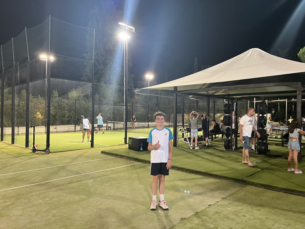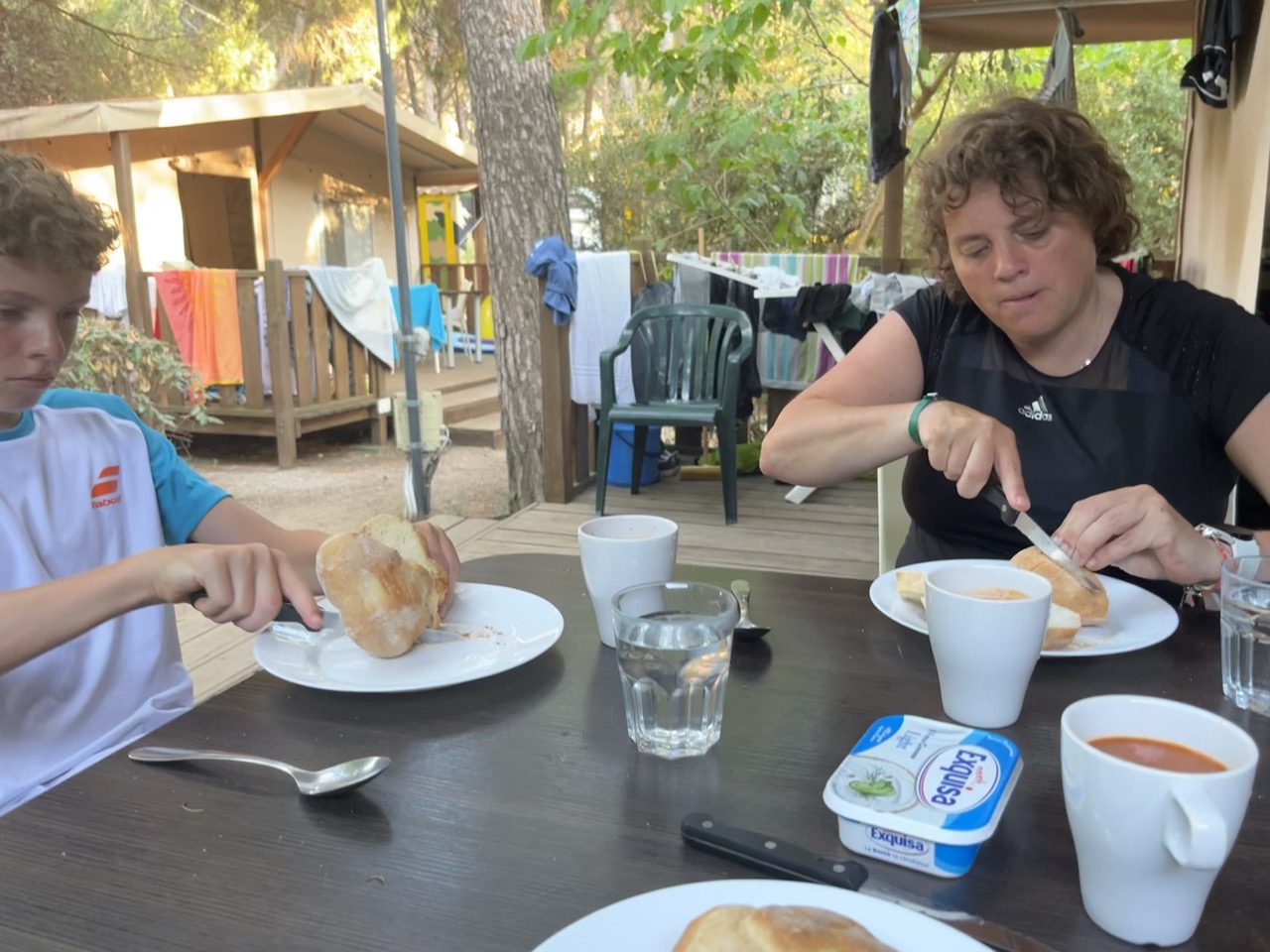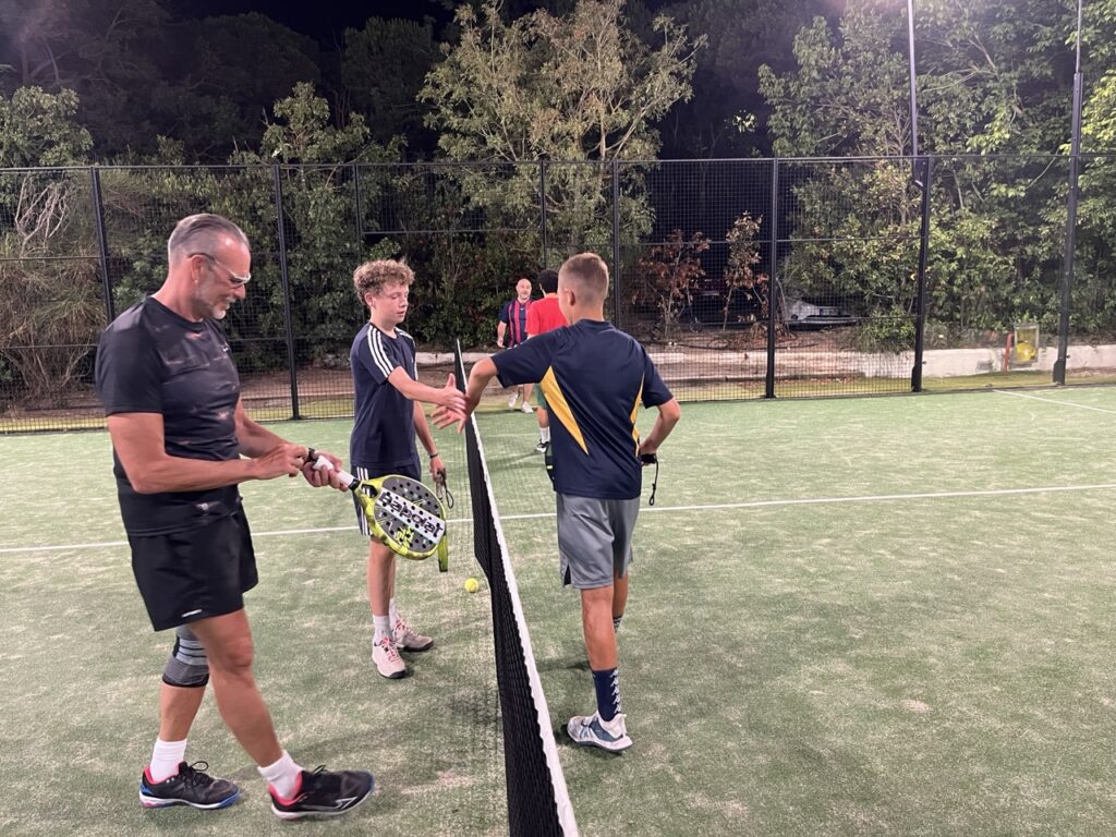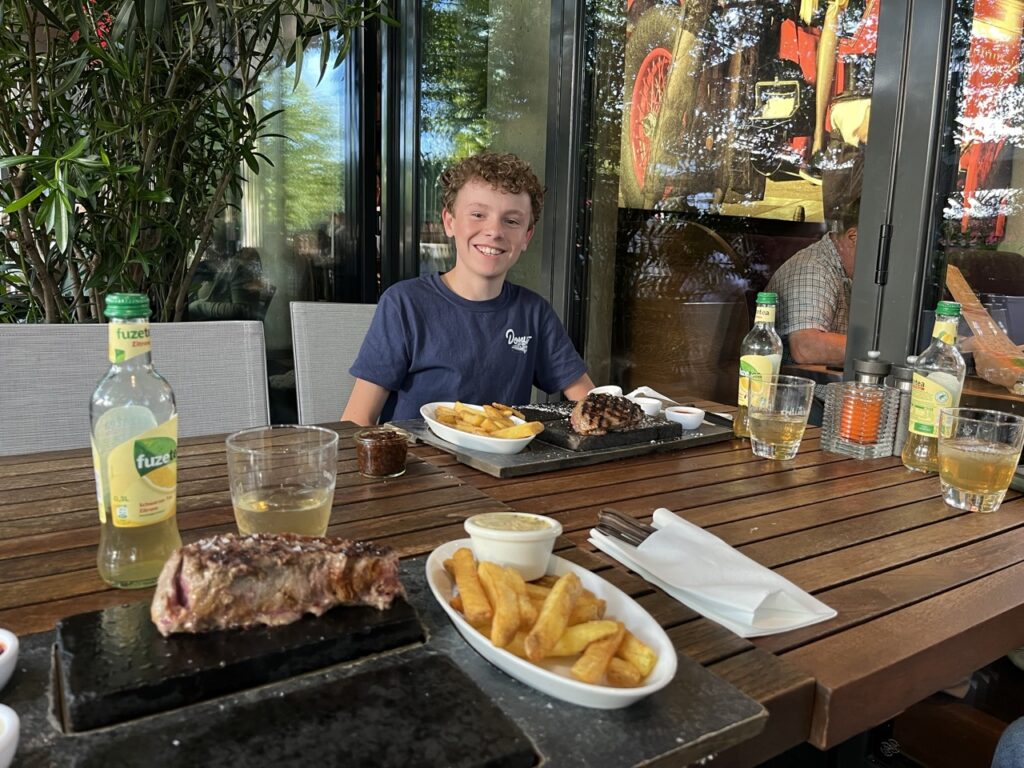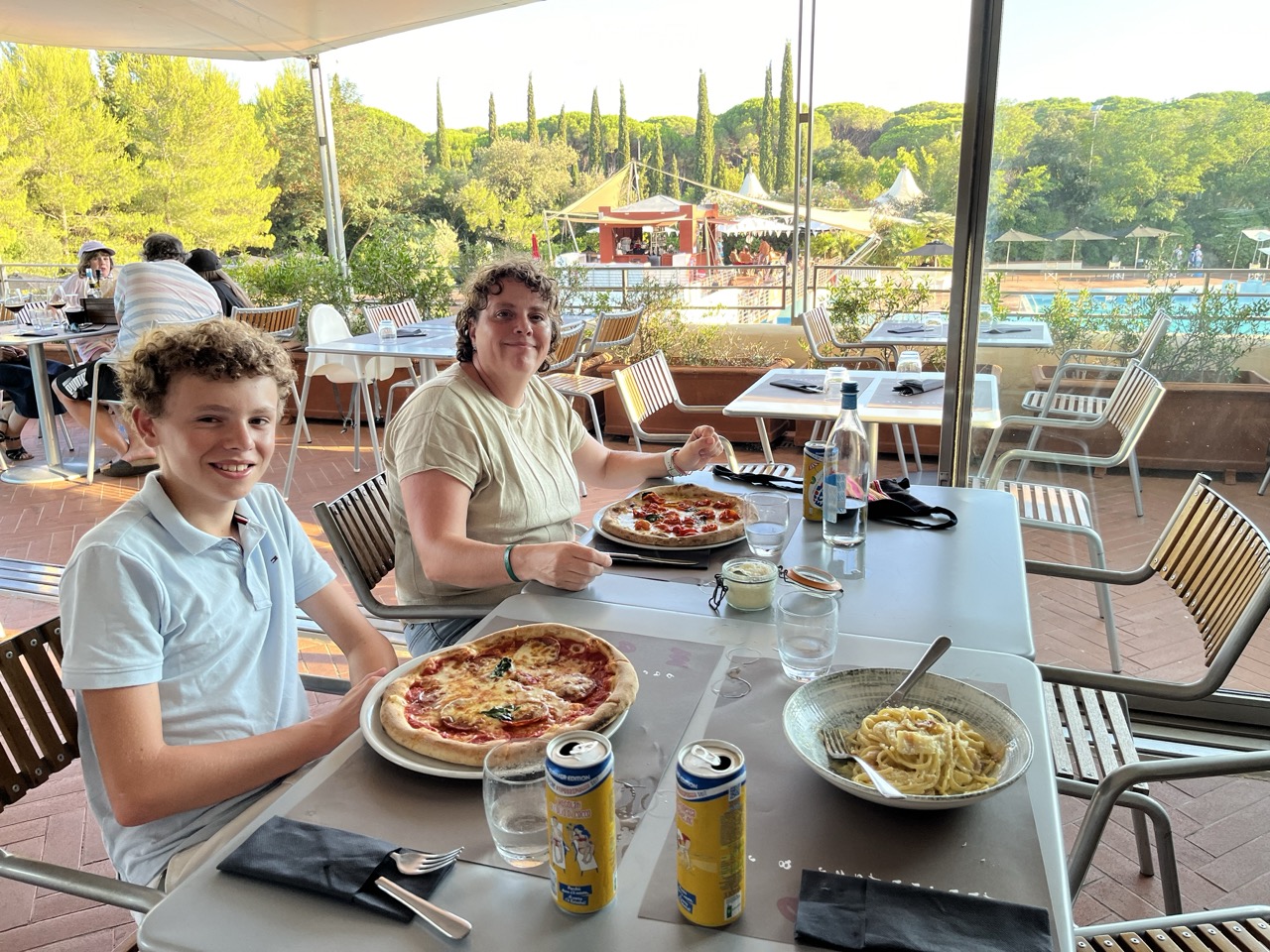 Vandaag hebben we er een rustige relaxdag van gemaakt op de camping. Vandaag maar eens even geen toernooitje en geen ‘verplichtingen’. Na het ontbijt zijn we naar de fietsverhuur op de camping geweest om te kijken of we zondag eventueel kunnen gaan fietsen in de omgeving. We hebben uiteindelijk 3 elektrische mountainbikes gekozen want die bleken veel goedkoper te zijn dan in onze folder stond en er was duidelijk aangegeven dat die fiets de voorkeur had. Vanmiddag zijn we maat S van de fiets nog even gaan testen, gaat net dus zondag gaan we fietsen. Daarna zijn we naar het zwembad gegaan. Anita lekker lezen en Stan en ik met (beach) bal aan de slag en rotzooien in het zwembad. Vanmiddag heeft ieder voor zichzelf relaxtijd. Aan het einde van de middag doen we nog en spelletje Quicks. Koken doen we vandaag niet. Stan heeft van oma Anja 50 euro gekregen om een keer uit eten te gaan en Stan z’n idee is om dat vandaag in het restaurant van de camping te doen. We hebben niet gereserveerd maar er is gelukkig nog 1 tafeltje vrij. Mooi restaurant met mooi uitzicht en lekker eten. Stan maakte zich zorgen of hij wil binnen budget bleef omdat papa weer zonodig iets anders dan een pizza moest nemen. Stan vroeg zelf om de rekening en bij het afrekenen bleek de rekening 49 euro, netjes (1 euro winst was de eerste reactie van Stan 😀). Daarna gaan we naar de sportvelden want Stan heeft afgesproken met het Italiaanse meisje Malena om anderhalf uur te gaan tennissen. Anita en ik gaan zelf even padellen, kijken daarna naar Stan en Malena (staan echt leuk te tennissen) en als de ouders van Malena vragen om een potje padel met ons te spelen doen we dat uiteraard meteen. Stan en Malena houden het ruim anderhalf uur vol. Moe en bezweet stappen ze van de baan af maar dan vraagt de Hannibal (vader van Malena) of we zin hebben om nog even te padellen. Tuurlijk dus zo staan Stan en ik weer tegenover Malena en Hannibal op de padelbaan en zitten Anita en de moeder van Malena langs de kant om ons toe te supporten. Na een lange eerste set die Stan en ik net verliezen in de tie-break wordt de vraag gesteld of we nog een 2e set willen doen. Malena zegt ja en Stan zegt ook ja als ik vraag of hij 14 jaar wil worden op de padelbaan of in bed 😀 Uiteindelijk lopen we rond half 1 de baan af. Stan wordt door iedereen gefeliciteerd en zo hebben we een leuke en gezellige afsluiter (of begin) van de dag.
