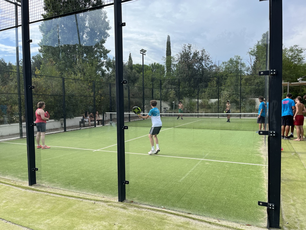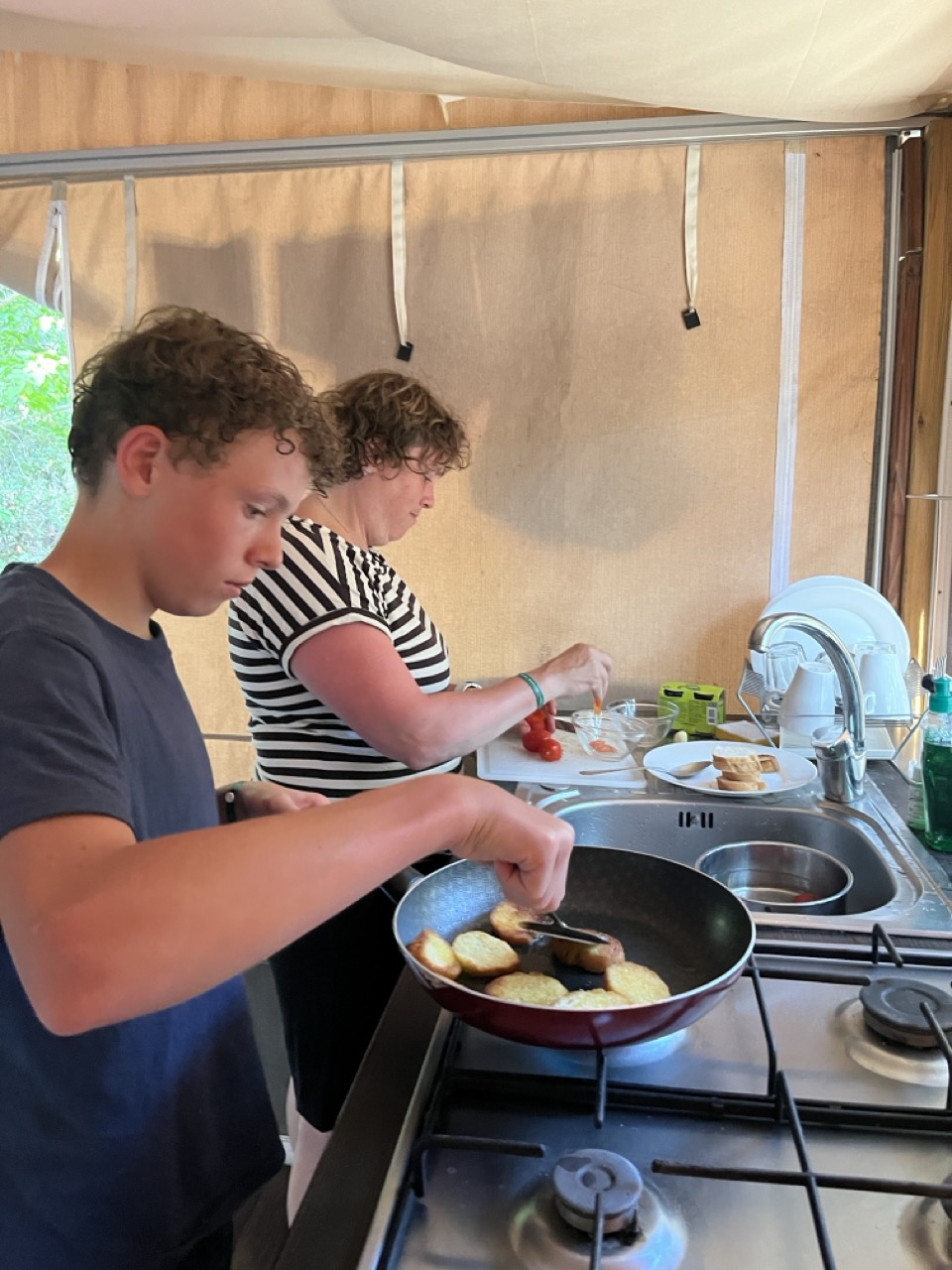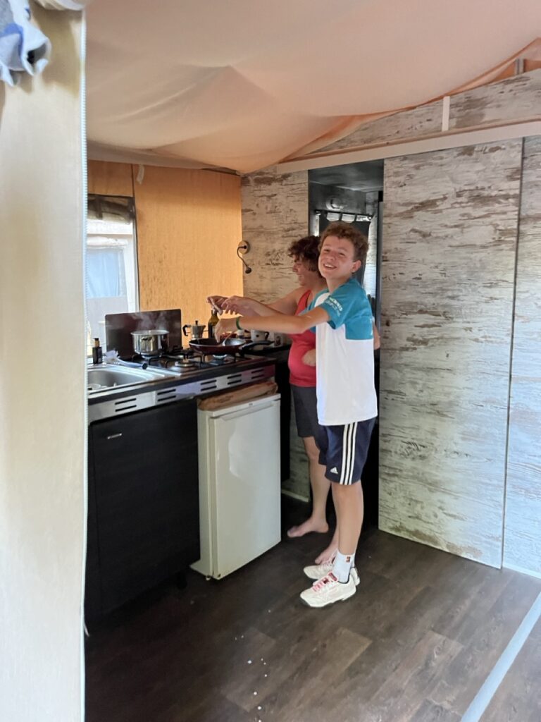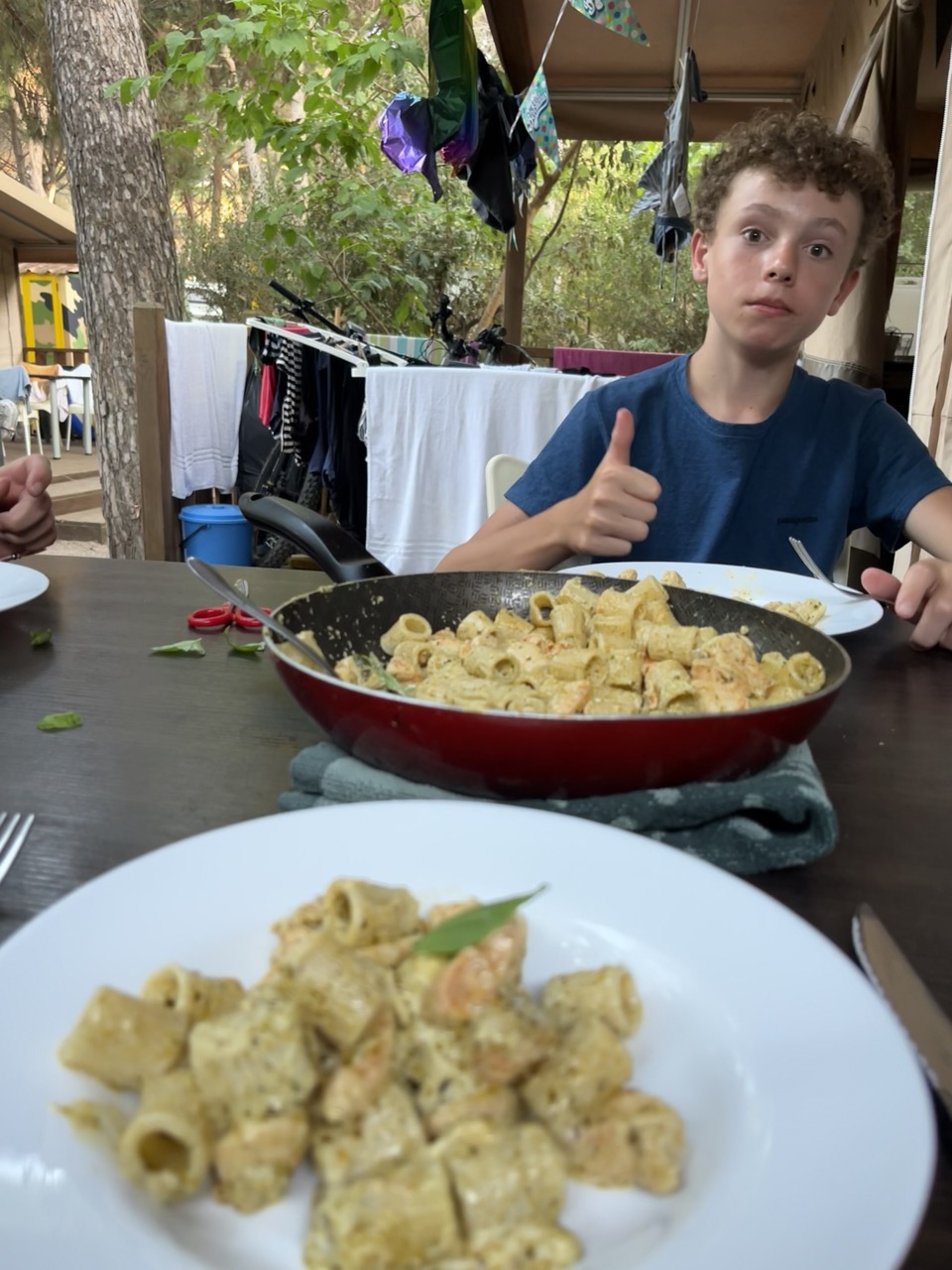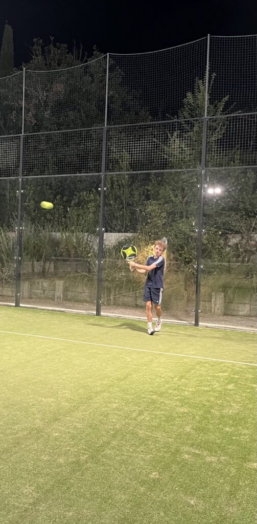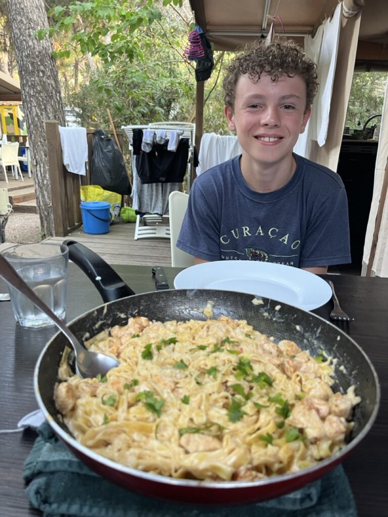 Vandaag hebben we er een rustige relaxdag van gemaakt op de camping. Vandaag maar eens even geen toernooitje en geen ‘verplichtingen’. Na het ontbijt zijn we naar de fietsverhuur op de camping geweest om te kijken of we zondag eventueel kunnen gaan fietsen in de omgeving. We hebben uiteindelijk 3 elektrische mountainbikes gekozen want die bleken veel goedkoper te zijn dan in onze folder stond en er was duidelijk aangegeven dat die fiets de voorkeur had. Vanmiddag zijn we maat S van de fiets nog even gaan testen, gaat net dus zondag gaan we fietsen. Daarna zijn we naar het zwembad gegaan. Anita lekker lezen en Stan en ik met (beach) bal aan de slag en rotzooien in het zwembad. Vanmiddag heeft ieder voor zichzelf relaxtijd. Aan het einde van de middag doen we nog en spelletje Quicks. Koken doen we vandaag niet. Stan heeft van oma Anja 50 euro gekregen om een keer uit eten te gaan en Stan z’n idee is om dat vandaag in het restaurant van de camping te doen. We hebben niet gereserveerd maar er is gelukkig nog 1 tafeltje vrij. Mooi restaurant met mooi uitzicht en lekker eten. Stan maakte zich zorgen of hij wil binnen budget bleef omdat papa weer zonodig iets anders dan een pizza moest nemen. Stan vroeg zelf om de rekening en bij het afrekenen bleek de rekening 49 euro, netjes (1 euro winst was de eerste reactie van Stan 😀). Daarna gaan we naar de sportvelden want Stan heeft afgesproken met het Italiaanse meisje Malena om anderhalf uur te gaan tennissen. Anita en ik gaan zelf even padellen, kijken daarna naar Stan en Malena (staan echt leuk te tennissen) en als de ouders van Malena vragen om een potje padel met ons te spelen doen we dat uiteraard meteen. Stan en Malena houden het ruim anderhalf uur vol. Moe en bezweet stappen ze van de baan af maar dan vraagt de Hannibal (vader van Malena) of we zin hebben om nog even te padellen. Tuurlijk dus zo staan Stan en ik weer tegenover Malena en Hannibal op de padelbaan en zitten Anita en de moeder van Malena langs de kant om ons toe te supporten. Na een lange eerste set die Stan en ik net verliezen in de tie-break wordt de vraag gesteld of we nog een 2e set willen doen. Malena zegt ja en Stan zegt ook ja als ik vraag of hij 14 jaar wil worden op de padelbaan of in bed 😀 Uiteindelijk lopen we rond half 1 de baan af. Stan wordt door iedereen gefeliciteerd en zo hebben we een leuke en gezellige afsluiter (of begin) van de dag.