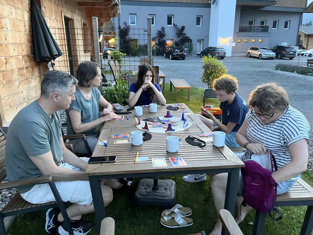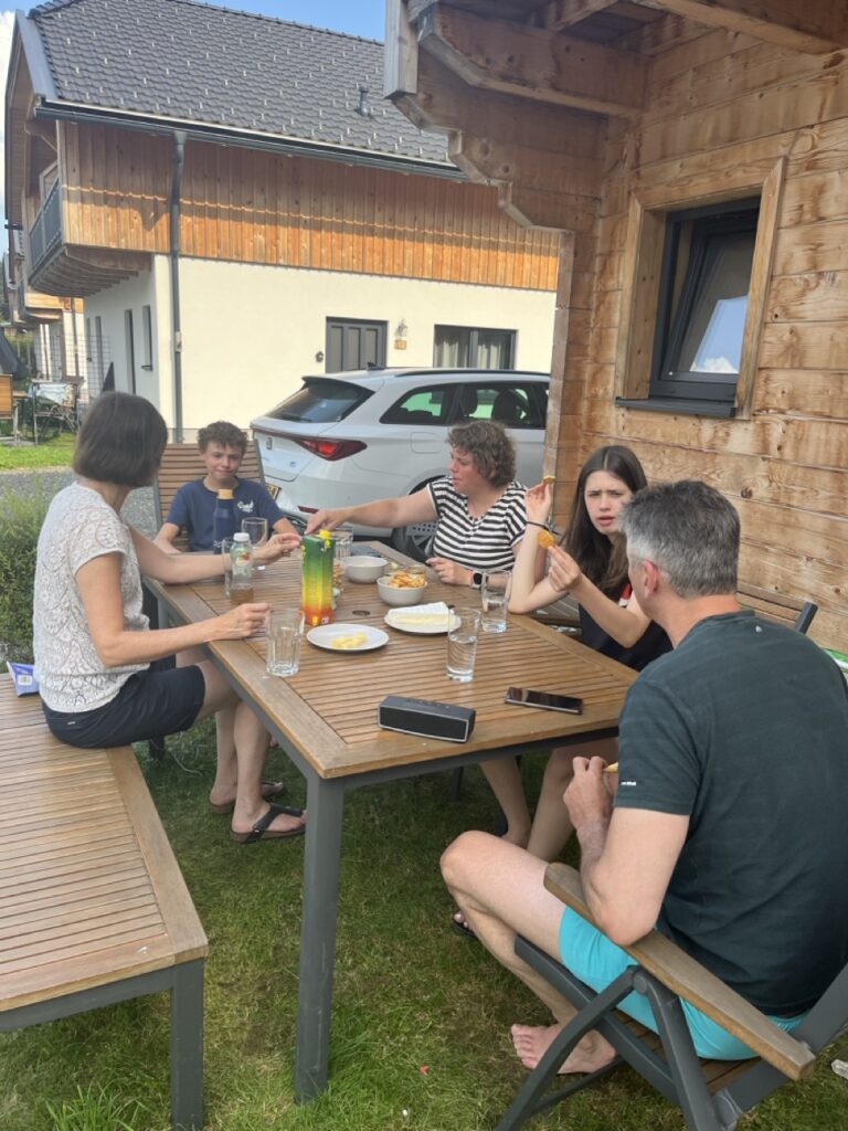 Zondagochtend (na heerlijk ontbijt) vertrekken iets voor half 10 richting Oostenrijk. Iets meer last van files maar uiteindelijk komen we na een prima reis iets voor zes uur aan bij het huisje van David en Kristel in Rattendorf. Ze hebben een heerlijk typisch Oostenrijks huisje waar we ons de komende dagen vast prima gaan vermaken. Terwijl Eva en Stan lekker staan te badmintonnen pakken we de auto uit en gaan dan in een dorpje verderop uit eten (Wiener schnitzel of Wiener schnitzel of toch maar Wiener schnitzel 🙂 maar het was heerlijk). Daarna de dag gezellig afgesloten met een spel (uiteraard!) Verraders.