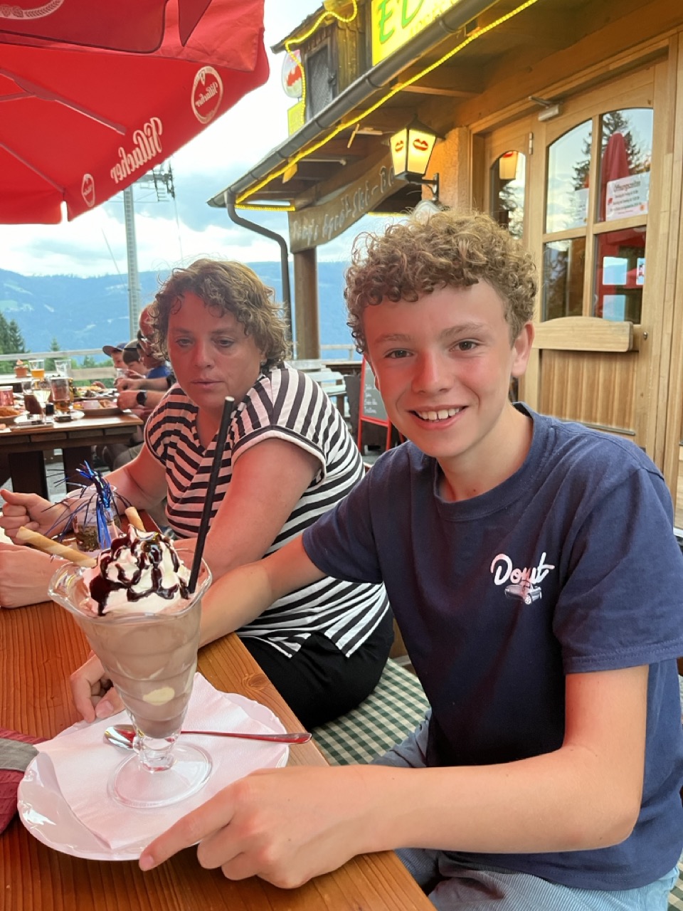 Vandaag voor het eerst jarig zonder fysieke aanwezigheid van Anne en dat is voelbaar lastig. Ik ben vanochtend eerst naar het kerkje verderop gelopen om daar een kaarsje te branden voor Anne, naar foto’s te kijken van mijn verjaardag vorig jaar in Italië en gewoon stil te zitten met mijn gedachten en herinneringen aan Anne. Best een moeilijke start van de dag eerlijk gezegd maar de rest van de dag hebben we er met elkaar toch een fijne en gezellige dag van gemaakt. Ik heb ontzettend veel lieve berichtjes ontvangen (dank jullie wel!). Van Anita een heel lieve en ontroerende brief en cadeau gekregen en van Stan te horen gekregen wat ik ga krijgen (een zelfgemaakt spel, super origineel en erg leuk maar het is nog niet helemaal af dus dat gaan we straks thuis samen verder af maken). De ontbijttafel was versierd en er waren lekkere broodjes bij de bakker gekocht dus heerlijke start van de dag. Daarna zijn we weer naar het meer gegaan om te zwemmen, beachballen, frisbeeën, volleyballen en spelletjes spelen. Tussendoor nog even een lekker ijsje (het is geen weer voor een taartje) en daarna op tijd naar huis zodat iedereen even iets voor zichzelf kan doen. Vanavond zijn we ter ere van mijn verjaardag gaan eten in een restaurant hoog in de bergen. Typisch Oostenrijks maar heerlijk en gezellig. Deze verjaardag met dubbele gevoelens afgesloten met het spelen van wat spelletjes en nu lekker naar bed.