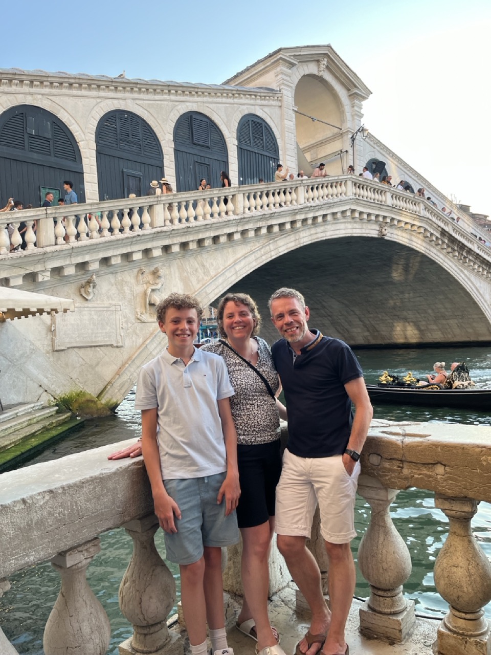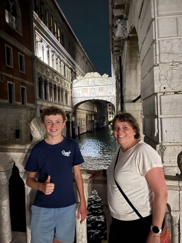 Vandaag een dag de toerist uithangen in Venetië. Als eerste zijn naar de top van de klokkentoren van San Marco gegaan om te genieten van mooi uitzicht over Venetië (leuk hoor maar beetje zonde van het geld). Daarna zijn we even de beroemde kathedraal in geweest waar Anita ook een kaarsje voor Anne heeft aangestoken. We hebben wat door de straatjes van Venetië geslenterd, de bijzondere boekwinkel even bezocht en daarna met de watertaxi naar het eiland Murano gevaren (bekend van glasblazen). Na wat gegeten te hebben zijn we doorgevaren naar het eilandje Burano. Dit eiland was eigenlijk mooier dan Murano. Na onszelf getrakteerd te hebben op een heerlijk ijsje zijn we terug gevaren naar Venetië. Onderweg terug naar het hotel hebben een souvenirtjes gekocht zoals we dat tijdens al onze vakanties gewend zijn maar deze keer 2 in plaats van 1; Eentje voor thuis zoals we gewend waren; Een zwarte gondel met daarop een rood hartje van Murano glas waarbij we denken aan Venetië en onze lieve Anne. Maar we hebben er ook een gekocht voor bij het graf van Anne; een mooie met de hand beschilderde steen. We willen al onze vakanties en/of bijzondere gebeurtenissen op deze manier ook met Anne delen. In deze winkel hebben we ook een mooie ketting met een hartje van Murano glas voor Anita gekocht. Als echte Italianen zijn we rond 20:00 uur gaan eten en kregen we van Stan een ijsje als toetje van de beste ijssalon van Venetië. Daarna hebben we de watertaxi genomen richting hotel. Dat was erg leuk, je ziet Venetië dan van een andere kant en we werden ook nog verrast door een spectaculaire show met drones. Het blijkt dat deze dagen het Festa del Redentore (het Feest van de Verlosser) wordt gevierd. Dat maken we toch nog maar mooi even mee hoewel we de grote vuurwerkshow van morgenavond wel zullen missen. Als we aan wal komen lopen we nog ‘snel’ even langs de Brug der Zuchten want stel je voor dat we thuiskomen en we moeten vertellen dat we die niet hebben gezien 🙂