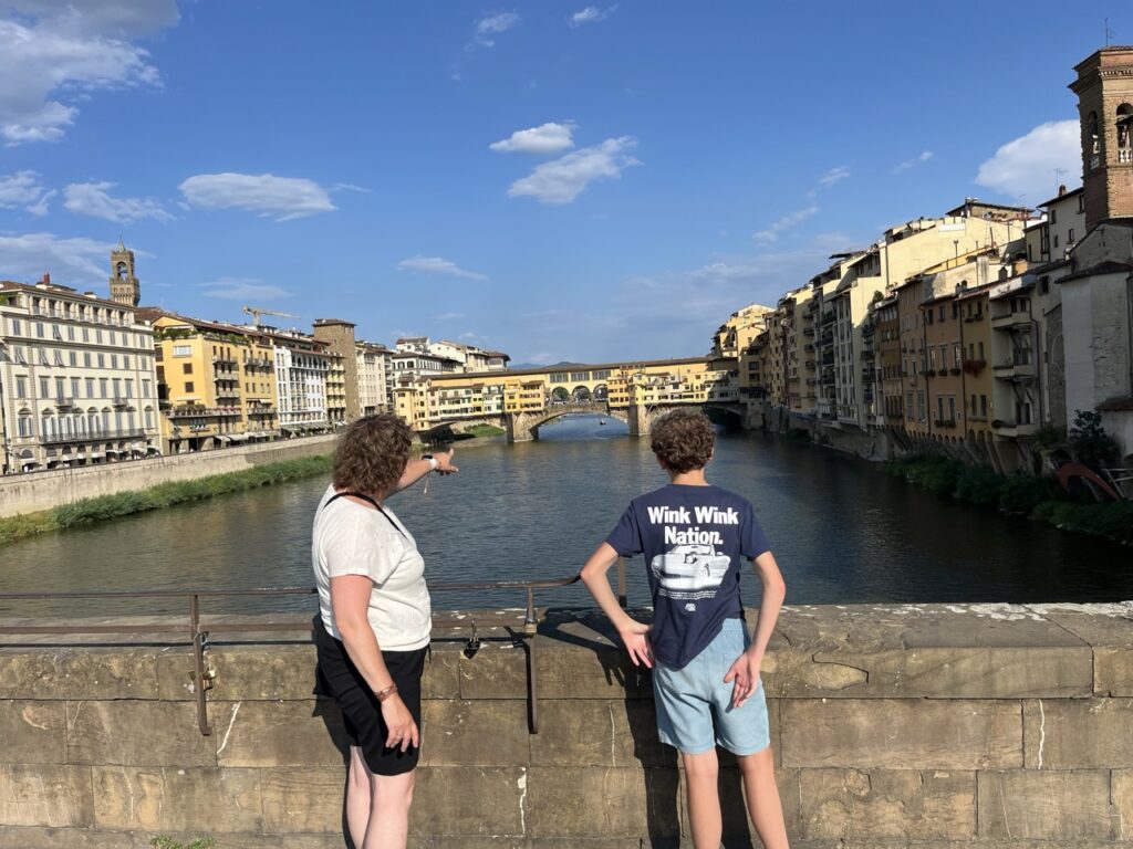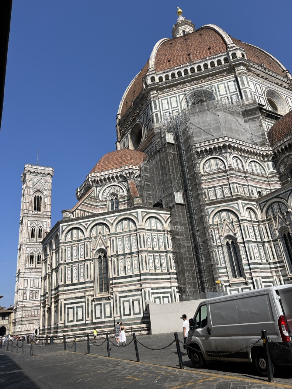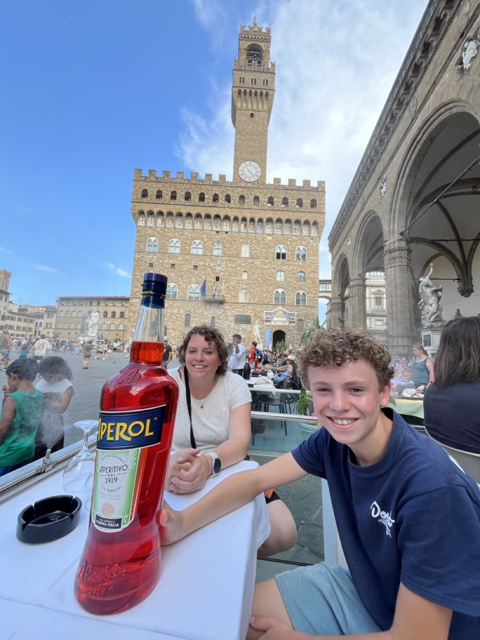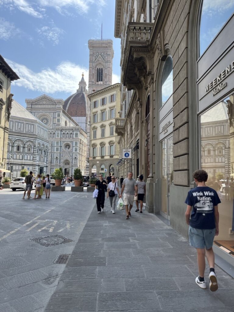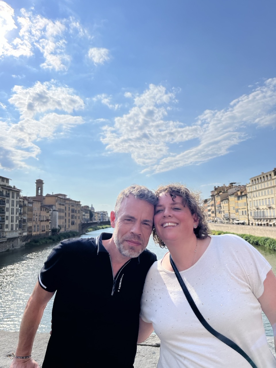 Na ontbijt op onze kamer zijn we om half 10 vertrokken richting de watertaxi. Venetië was wel aardig maar laaiend enthousiast zijn we eerlijk gezegd niet. Het was prima zo. Met de watertaxi terug naar onze parkeerplaats en dan rijden we richting Florence. Gisteravond een hotelletje geboekt in het centrum van Florence en daar rijden we eigenlijk zonder problemen naar toe. Wel een beetje spannend of het met de milieuzone goed gaat maar aangekomen in het hotel blijken ze dat voor ons te regelen. Het hotel ziet er prachtig uit, onze auto brengen ze naar een garage en de kamer ziet er prima uit. Kamer was net zo duur als in Venetië maar dit voelt een stuk luxer aan. De locatie is perfect, we zijn met 7 minuten lopen bij de grote kathedraal met de rode koepel. We zijn eigenlijk net op tijd (eigenlijk te laat) bij de kathedraal omdat ze al om 16:00 uur sluiten maar we hebben geleerd van oma Anja dat brutale mensen de halve wereld hebben. De rij werd afgesloten door een bewaker maar wij zijn halverwege maar even aangesloten. Is eigenlijk niks voor ons (vond Stan ook) maar het zorgde er wel voor dat we de kathedraal toch nog van binnen konden bewonderen want morgen is de kathedraal gesloten. Wat een immens groot en mooi gebouw, veel mooier dan in Venetië. Ook hier hebben we met z’n drieën een kaarsje voor Anne aangestoken. We zijn vervolgens zoveel mogelijk zonder Google Maps door Florence gelopen. Wat veel mooie imposante gebouwen. We lopen over de Ponte Vecchio (niet veel aan), lopen over een andere brug om de Ponte Vecchio vandaar te bekijken (laten we het er op houden dat het verhaal achter deze brug interessant is), lopen nog een Pandora winkeltje in om 2 bedeltjes voor Anita’s nieuwe armband te kopen en zo hebben we samen best een aangename middag. Op het Piazza Signoria pakken we een terrasje en gaan we ons (voor een keertje) te buiten; Stan een Ice Tea Lemmon en Anita en ik aan de Spritz. Het blijkt al snel dat wij inderdaad geen alcohol drinkers zijn, het stijgt ons (en vooral Anita) lichtjes naar het hoofd maar we hebben wel lol met elkaar. In de avond eten we bij hetzelfde restaurant. Er zit een Amerikaan naast ons die het lachwekkend vindt dat we 1 dag in Florence zijn, dat we te weinig weten van de cultuur van Florence, een fanatieke Trump-aanhanger blijkt te zijn, onze politiek belachelijk vindt (waarom jagen jullie alle boeren het land uit) maar ondanks dat alles ook leuke tips geeft voor wat te bekijken in Florence in de korte tijd die we hebben. Na het eten genieten we nog even van een live klassiek openluchtconcert, slenteren nog even door de straten van Florence en gaan dan terug naar het hotel.