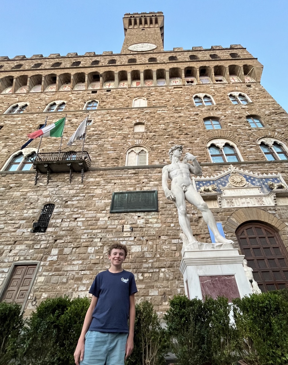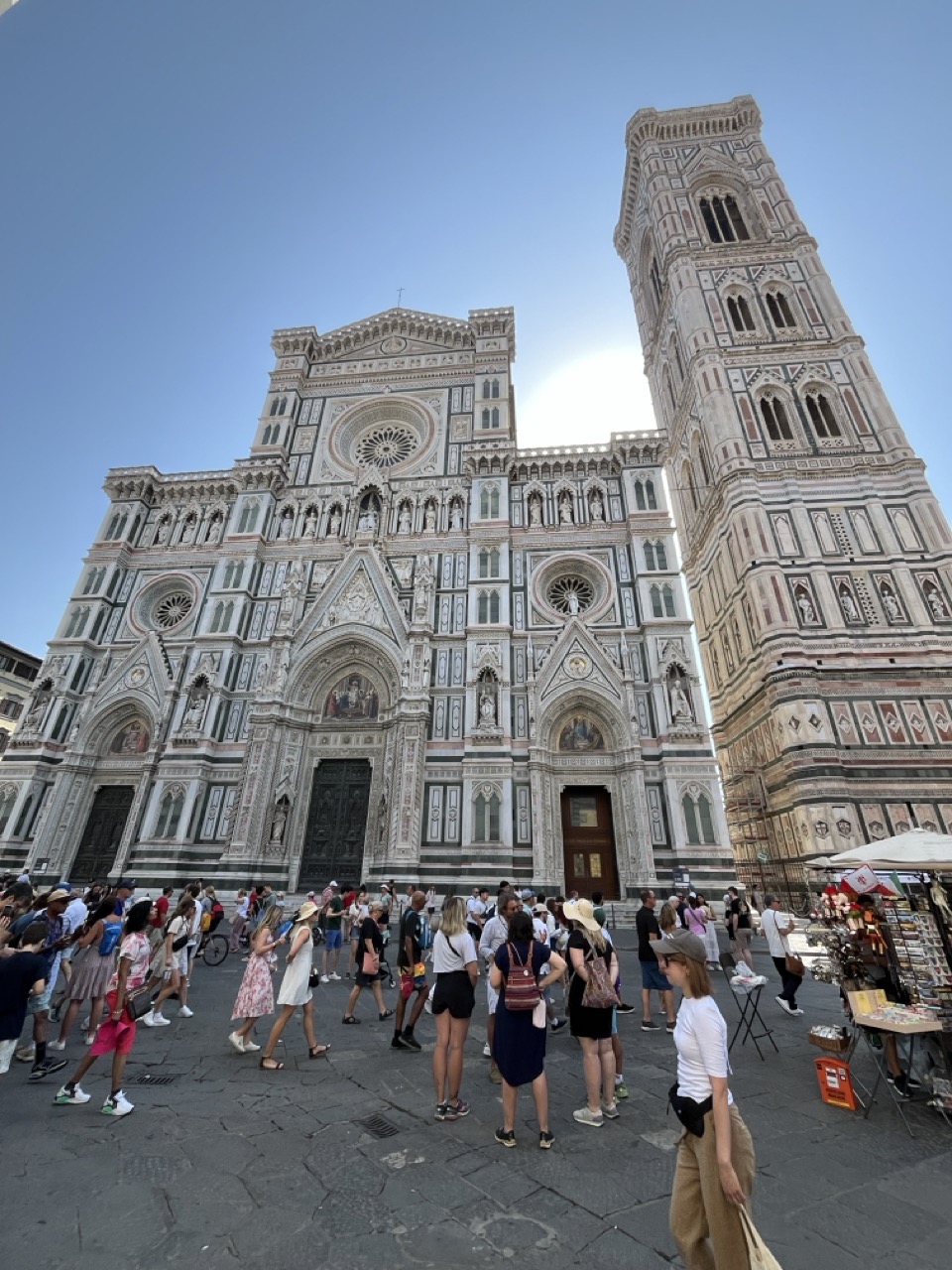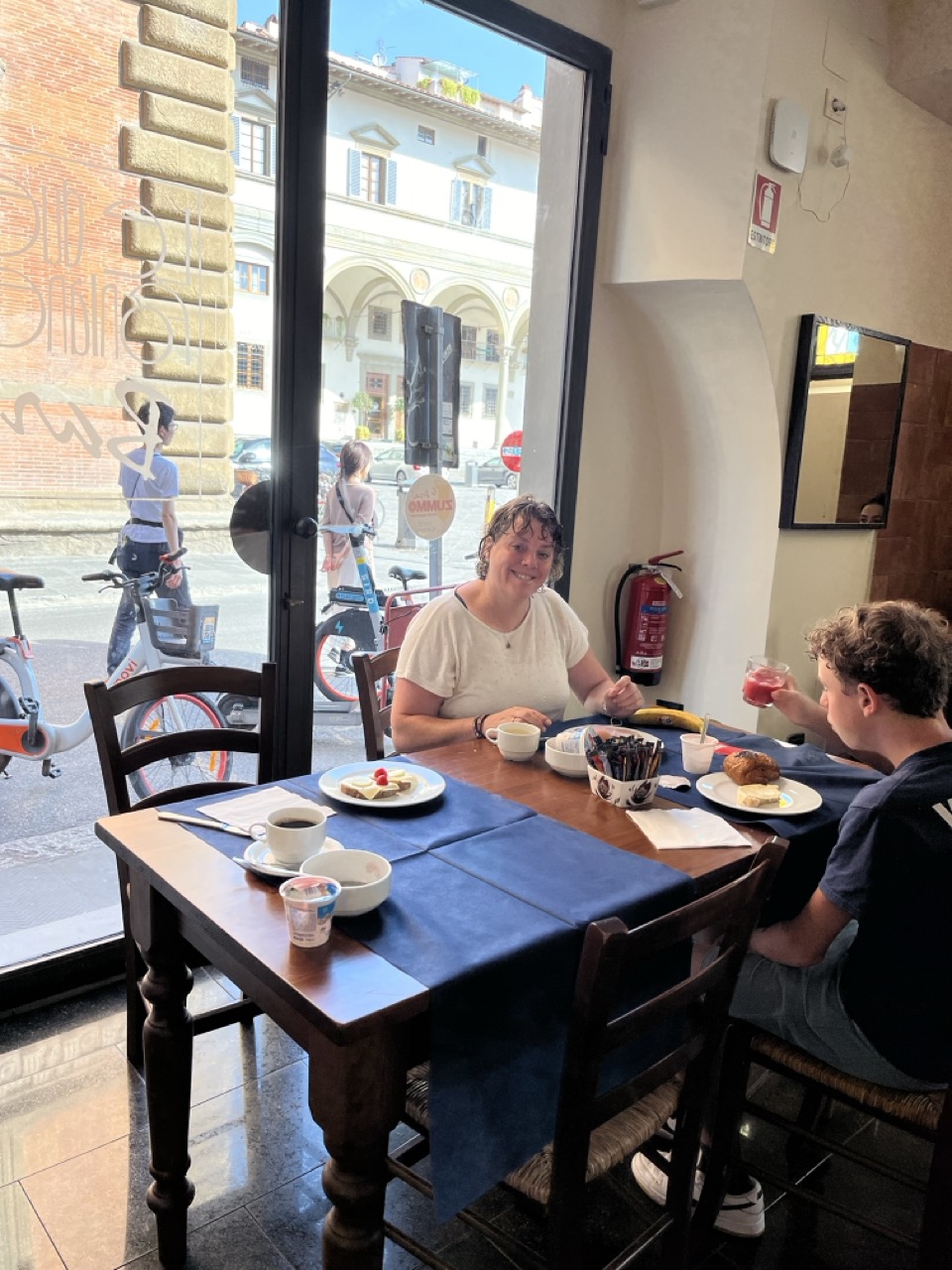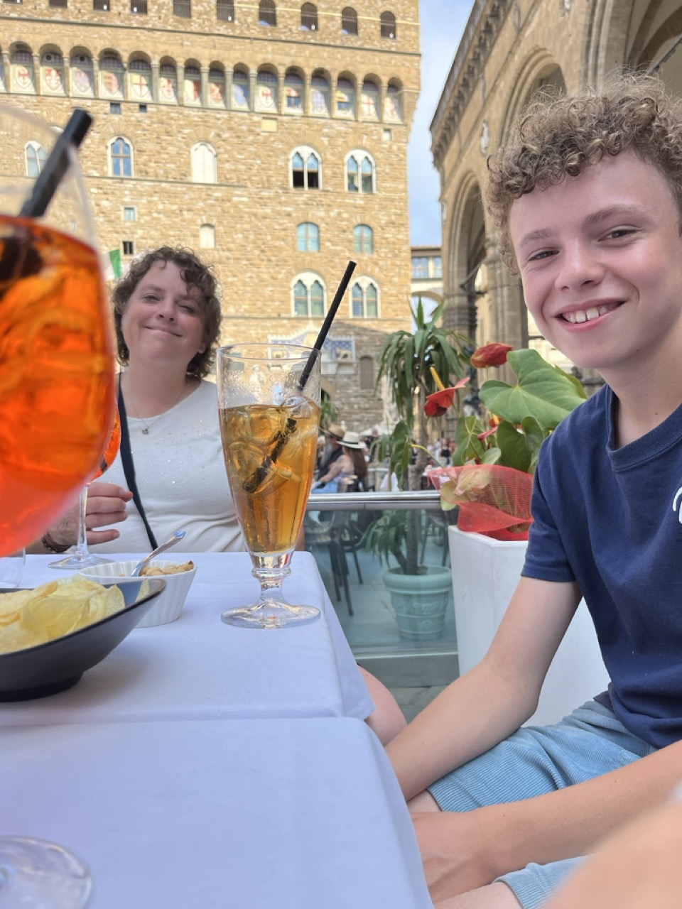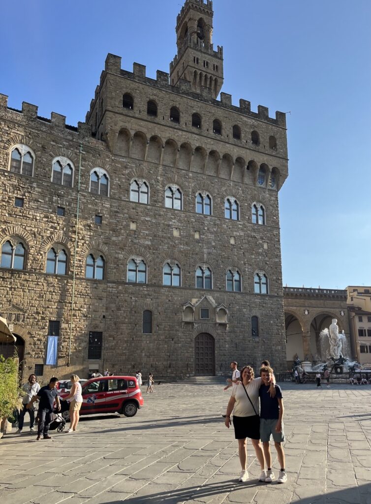 Na ontbijt op onze kamer zijn we om half 10 vertrokken richting de watertaxi. Venetië was wel aardig maar laaiend enthousiast zijn we eerlijk gezegd niet. Het was prima zo. Met de watertaxi terug naar onze parkeerplaats en dan rijden we richting Florence. Gisteravond een hotelletje geboekt in het centrum van Florence en daar rijden we eigenlijk zonder problemen naar toe. Wel een beetje spannend of het met de milieuzone goed gaat maar aangekomen in het hotel blijken ze dat voor ons te regelen. Het hotel ziet er prachtig uit, onze auto brengen ze naar een garage en de kamer ziet er prima uit. Kamer was net zo duur als in Venetië maar dit voelt een stuk luxer aan. De locatie is perfect, we zijn met 7 minuten lopen bij de grote kathedraal met de rode koepel. We zijn eigenlijk net op tijd (eigenlijk te laat) bij de kathedraal omdat ze al om 16:00 uur sluiten maar we hebben geleerd van oma Anja dat brutale mensen de halve wereld hebben. De rij werd afgesloten door een bewaker maar wij zijn halverwege maar even aangesloten. Is eigenlijk niks voor ons (vond Stan ook) maar het zorgde er wel voor dat we de kathedraal toch nog van binnen konden bewonderen want morgen is de kathedraal gesloten. Wat een immens groot en mooi gebouw, veel mooier dan in Venetië. Ook hier hebben we met z’n drieën een kaarsje voor Anne aangestoken. We zijn vervolgens zoveel mogelijk zonder Google Maps door Florence gelopen. Wat veel mooie imposante gebouwen. We lopen over de Ponte Vecchio (niet veel aan), lopen over een andere brug om de Ponte Vecchio vandaar te bekijken (laten we het er op houden dat het verhaal achter deze brug interessant is), lopen nog een Pandora winkeltje in om 2 bedeltjes voor Anita’s nieuwe armband te kopen en zo hebben we samen best een aangename middag. Op het Piazza Signoria pakken we een terrasje en gaan we ons (voor een keertje) te buiten; Stan een Ice Tea Lemmon en Anita en ik aan de Spritz. Het blijkt al snel dat wij inderdaad geen alcohol drinkers zijn, het stijgt ons (en vooral Anita) lichtjes naar het hoofd maar we hebben wel lol met elkaar. In de avond eten we bij hetzelfde restaurant. Er zit een Amerikaan naast ons die het lachwekkend vindt dat we 1 dag in Florence zijn, dat we te weinig weten van de cultuur van Florence, een fanatieke Trump-aanhanger blijkt te zijn, onze politiek belachelijk vindt (waarom jagen jullie alle boeren het land uit) maar ondanks dat alles ook leuke tips geeft voor wat te bekijken in Florence in de korte tijd die we hebben. Na het eten genieten we nog even van een live klassiek openluchtconcert, slenteren nog even door de straten van Florence en gaan dan terug naar het hotel.