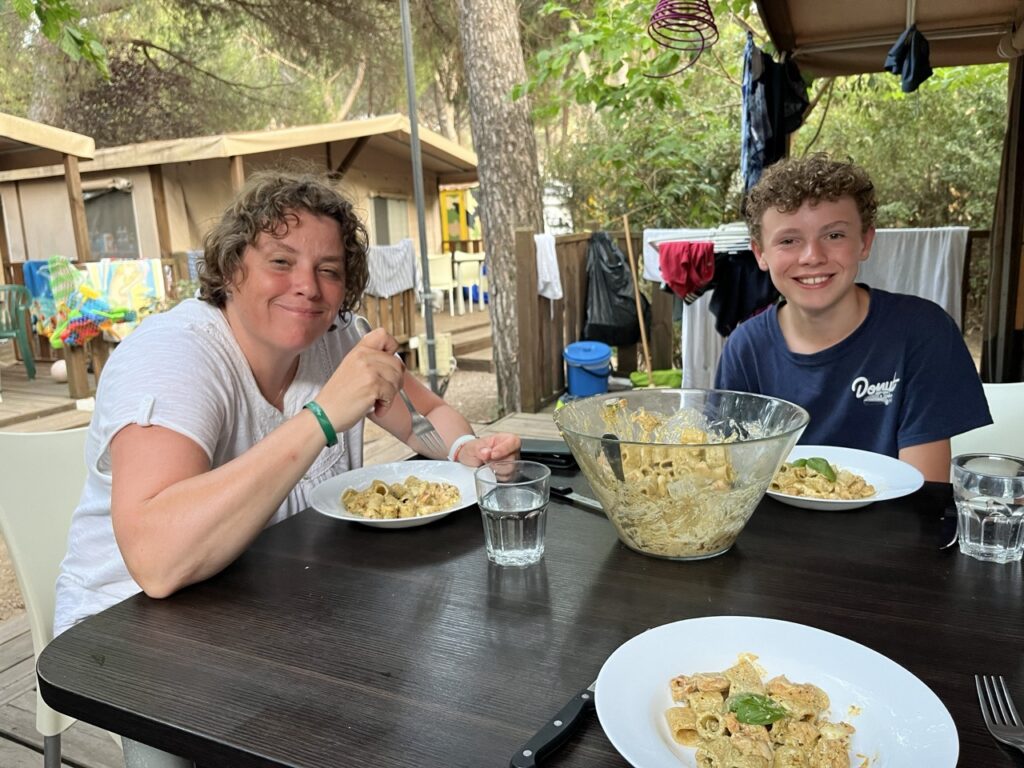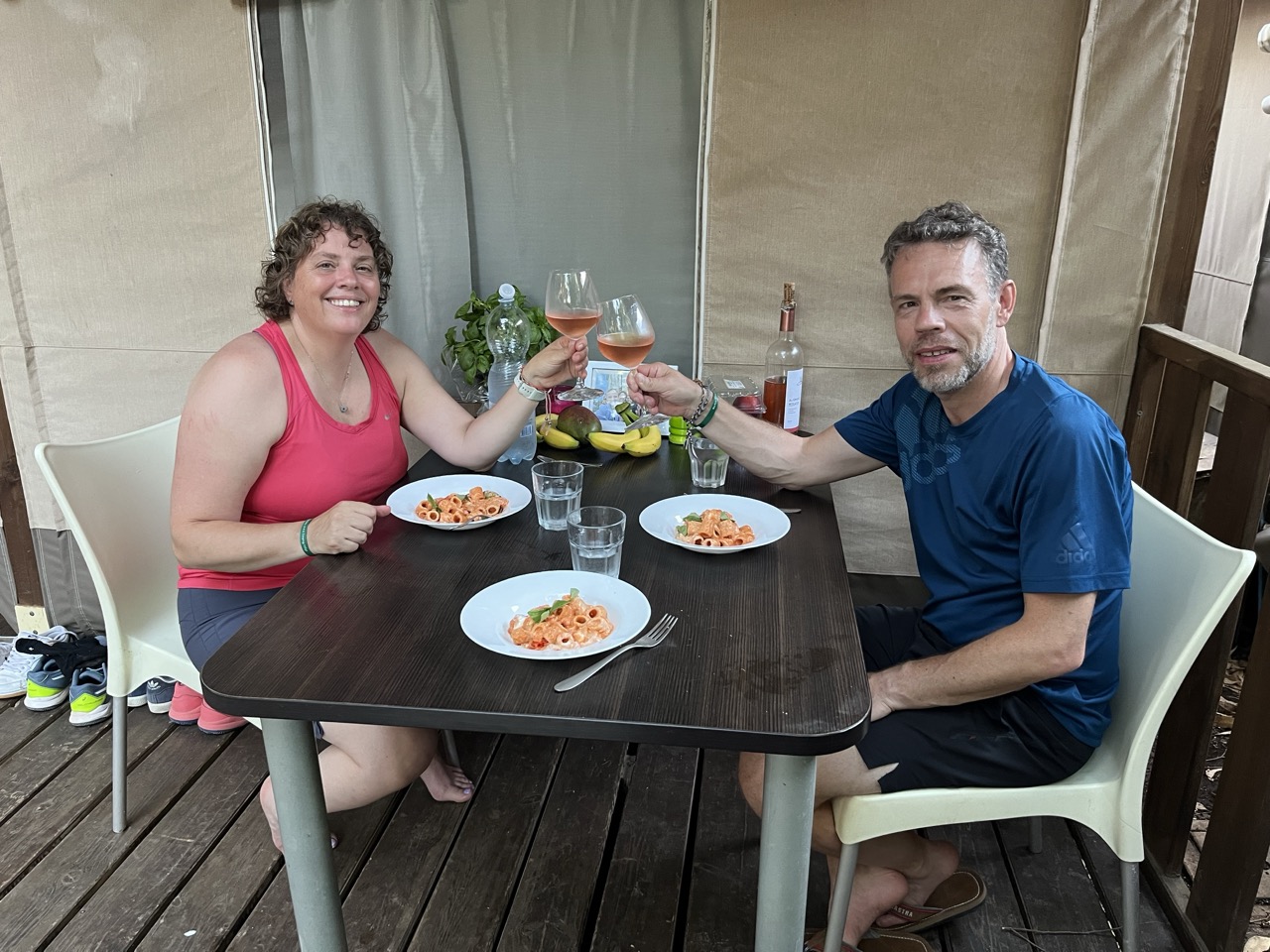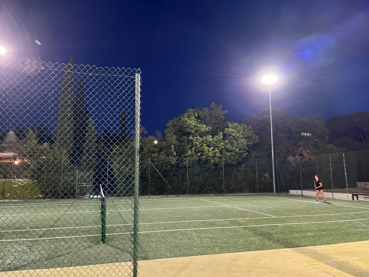 Vanochtend rustig opgestaan om vervolgens na het ontbijt opnieuw richting de sportvelden te gaan omdat we ons alledrie hebben ingeschreven voor het tennistoernooi dat om 11:15 uur begint. Gelukkig is het vandaag net iets minder warm (waarschijnlijk 32 graden ipv 34 graden maar toch). Er doen best veel mensen mee en ontmoeten (eigenlijk voor het eerst) ook een paar Nederlanders. Uiteindelijk kom ik Anita tegen in de halve finale en in de finale sta ik tegenover Stan. Die finale heb ik ‘helaas’ verloren. Een Italiaans meisje deed ook mee en die wilde graag tegen Stan spelen dus zij hebben nog een tijdje leuk staan spelen en zelfs een afspraak gemaakt om morgenavond nog een keer te gaan spelen. Leuk! Vanmiddag hebben we bij de tent het spel Kolonisten van Catan gespeeld en zijn daarna aan het einde van de middag nog even naar het strand geweest. Vanavond heeft Stan opnieuw heerlijk voor ons gekookt (Pasta Alfredo) en daarna hebben we nog even het spel Bonanza gespeeld. Om half 10 gaan Stan en ik richting het tennisveld omdat we vanaf 10 uur de baan hebben gereserveerd. Anita blijft in de tent om verder te gaan met haar luisterboek. Stan en ik kunnen bijna meteen de baan op en staan lekker te spelen. We krijgen regelmatig publiek en het nodige applaus als er weer eens een leuke rally is. Terwijl we staan te spelen komt het Italiaanse meisje en haar vader (een hele goede padelspeler) of we willen padellen. Natuurlijk willen we dat, leuk! En zo staan we tot bijna half 12 in de avond op padelbaan 1 met veel publiek heerlijk te padellen. Inmiddels beginnen steeds meer mensen op de camping ons en onze namen te kennen. We worden aangesproken op ons goede (tennis/padel) spel en met name Stan laat nogal een indruk achter bij veel mensen. Best grappig want zo leren we ook steeds meer mensen kennen. De taal is wel een barrière want er zijn echt veel Italianen die werkelijk geen woord Engels spreken (laat staan Nederlands) dus het is met handen en voeten communiceren maar dat gaat ook steeds beter. Al met al een heerlijk sportieve dag.
