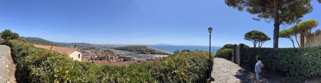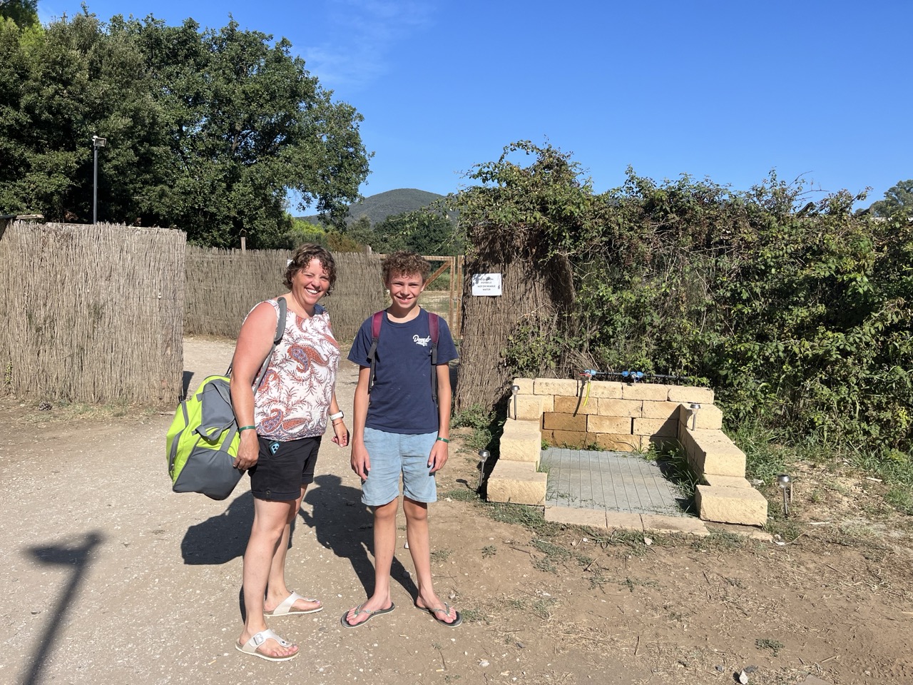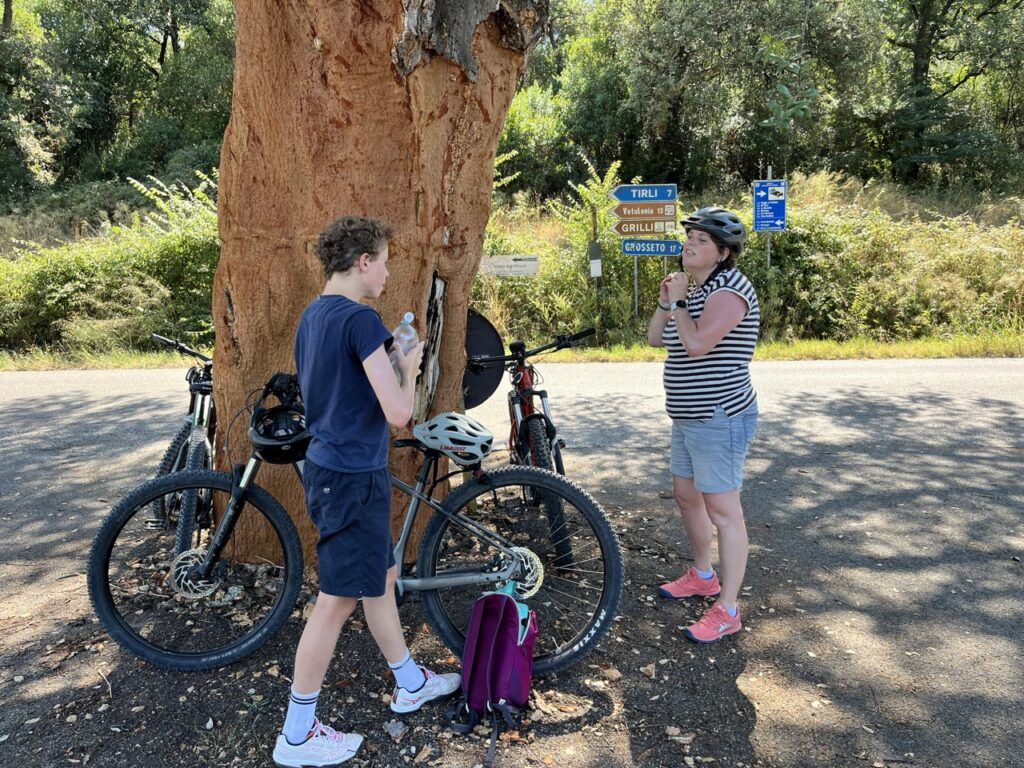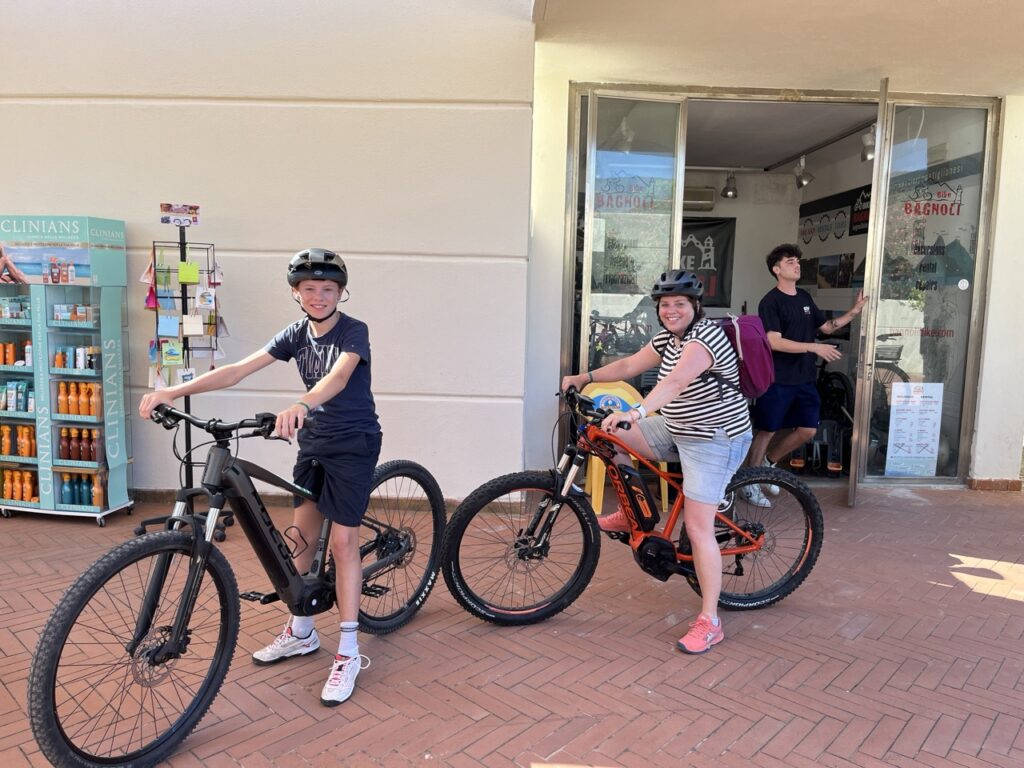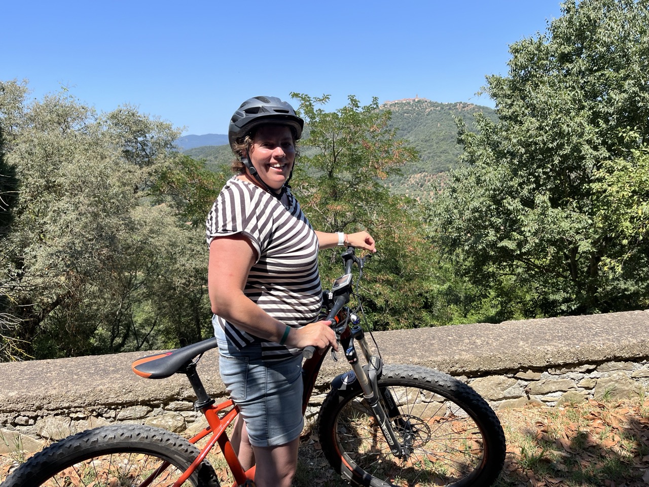 Vandaag was een van de weinige keren dat we onze wekker hadden gezet. Niet extreem vroeg maar wilden om 9 uur bij de fietsverhuur zijn zodat we een beetje op tijd kunnen vertrekken voor ons geplande fietsavontuur. De verhuurder was en is super aardig. Hij heeft 2 fietsen kunnen regelen waar het zadel lager kan wat wel echt fijn is voor Stan en Anita. Stan en ik vragen ons af of het wel goed gaat komen met de prijs want in de folder en ook in de winkel staat een prijs van 60 euro voor een elektrische mountainbike en wij hebben 25 euro afgesproken maar alle zorgen waren voor niets, voor 75 euro hadden we 3 elektrische mountainbikes, 3 helmen en 2 fietssloten dus helemaal compleet. We kiezen een route in Google Maps die ons naar/door de bergen zou moeten leiden maar geschikt is voor medium ervaren rijders (de expert routes laten we maar even links liggen, vorig jaar hebben we de Italiaanse ambulance al van binnen gezien en dat is genoeg). Het begint vlak maar zodra we de berg op gaan is het best pittig en zijn we heel blij met onze elektrische hulp. Ook vandaag is het erg warm (ruim 36 graden) en op sommige plekken rijden we open vlaktes in de volle zon maar al met al was het een prachtige tocht. Boven op de berg komen we aan bij bij ons ‘eindpunt’ het plaatsje Buriano waar we nog even echt hele steile hellingen moeten beklimmen om bovenaan bij de ruïne van een kasteel te komen. Vandaar weer terug naar Castiglione waar we nog een verkoelend ijsje nemen en dan terug naar de camping. Na ruim 50 kilometer en ruim 400 hoogtemeters komen we vermoeid maar tevreden aan bij de camping. Geen ongelukken en een leuke toch achter de rug. Vanavond heeft Stan weer lekker voor ons gekookt, hebben we nog een spelletje Quirkle gedaan. Om 22:00 uur zijn Stan en ik naar de padelbaan gegaan en is Anita thuis gebleven om in haar boek te lezen. Stan en ik hebben opnieuw 2 uur op de baan gestaan met de Nederlanders, was leuk maar aan het einde was zowel bij Stan als bij mij de pijp wel helemaal leeg dus nu lekker slapen.