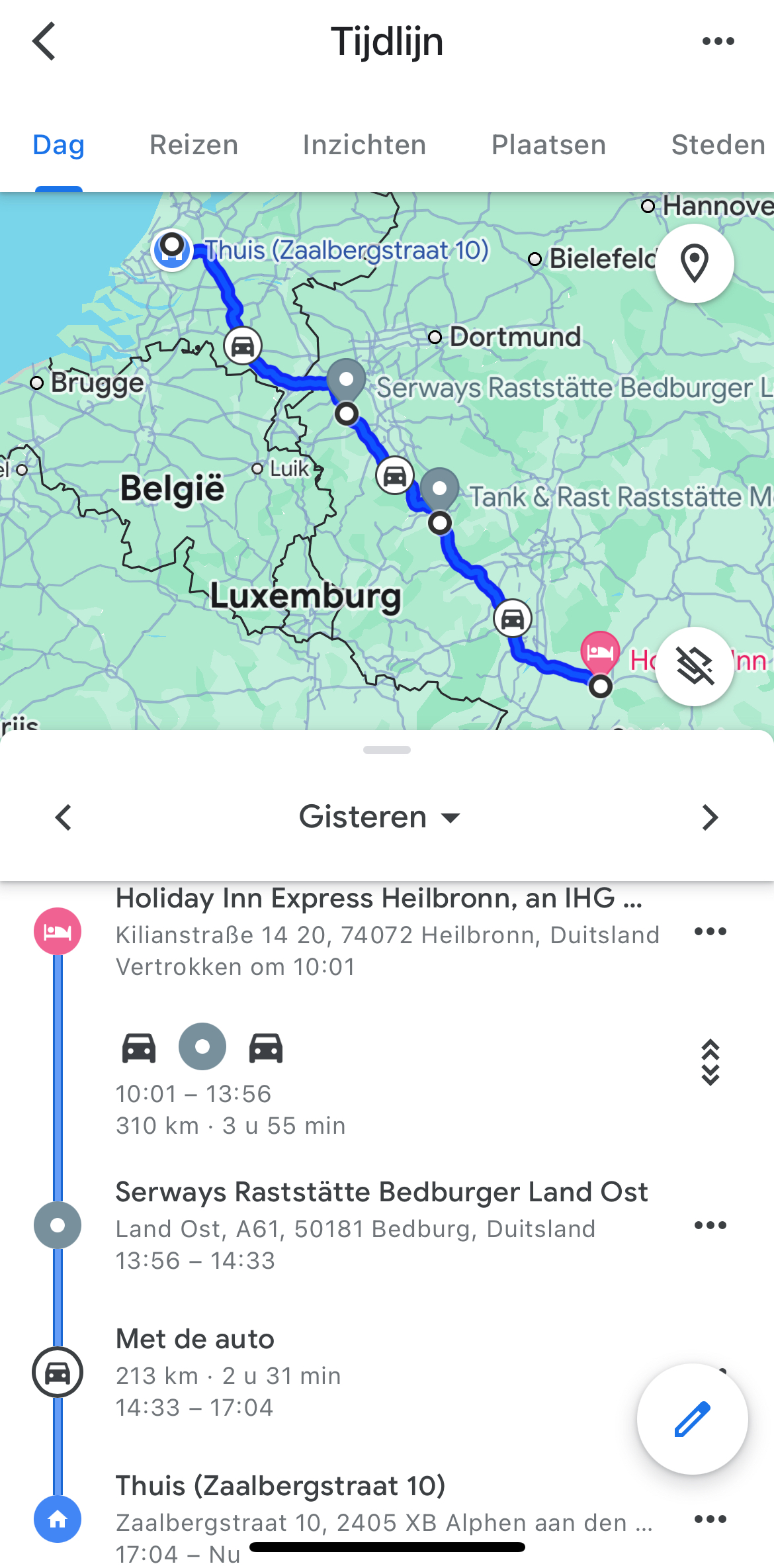 Vandaag was dan toch echt onze laatste dag van deze vakantie. Echt lekker geslapen kon ik niet dus om half zeven ben ik opgestaan om naar beneden te gaan en onder het genot van lekkere koffie het dagboek bij te werken. Ik vind het best fijn om zo rustig in mijn eentje de dag te starten en mijn gedachten en gevoelen een plekje te geven. Als Anita en Stan ook naar beneden komen genieten we van een heerlijk ontbijt en na deze relaxte start verlaten we iets voor tienen Heilbronn voor onze laatste 530 kilometers naar huis. Als we kijken naar Google Maps lijkt het alsof we nog wel wat files voor onze kiezen gaan krijgen maar uiteindelijk viel dat allemaal reuze mee en hebben we nagenoeg geen files gehad. Onderwerp in Duitsland nog even getankt (2,41 per liter!!!) en genoten van een werkelijk heerlijke snelle hap. Om 17:05 uur zijn we thuis na een prima reis. Het huis voelt vertrouwd aan en het is ook best wel fijn om weer thuis te zijn. We laden de auto snel uit, starten een eerste was en lopen dan naar opa en oma die ons hebben uitgenodigd om te komen eten. Fijn, lekker en gezellig.