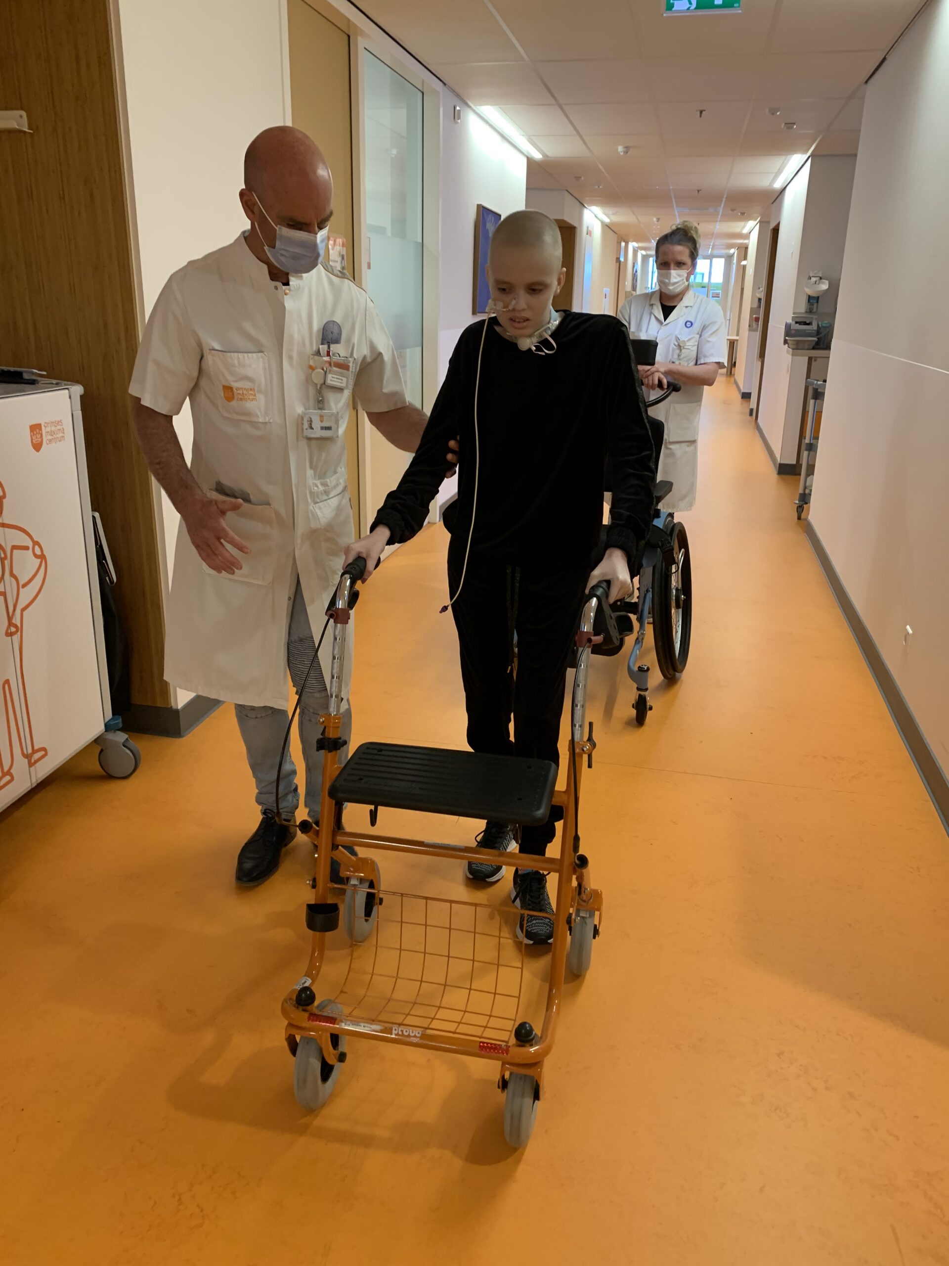 We brengen jullie graag weer even op de hoogte over hoe het gaat met Anne. Afgelopen week was een week met 2 gezichten. Vanaf vorig weekend werd ze ondanks de chemo iedere dag wat sterker. Met fysio Peter werden er iedere dag beste mooie stappen gezet. In de ochtend lopen op de gang met rollator. Dat begon met 40 meter en gisteren was het zelfs 150 meter. In de middag gaat ze dan met Peter naar de sportzaal om oefeningen en leuke dingen te doen. Dan hebben we het over badminton maar ook lopen op de brug met een step in het midden om zo het traplopen te oefenen. Ook het haar is afgelopen anderhalve week hard gaan groeien. De wimpers en wenkbrauwen zijn terug en op het hoofd zie je het met de dag groeien. Of het blijft na de afgelopen chemo is maar de vraag maar voor nu toch fijn om te zien.