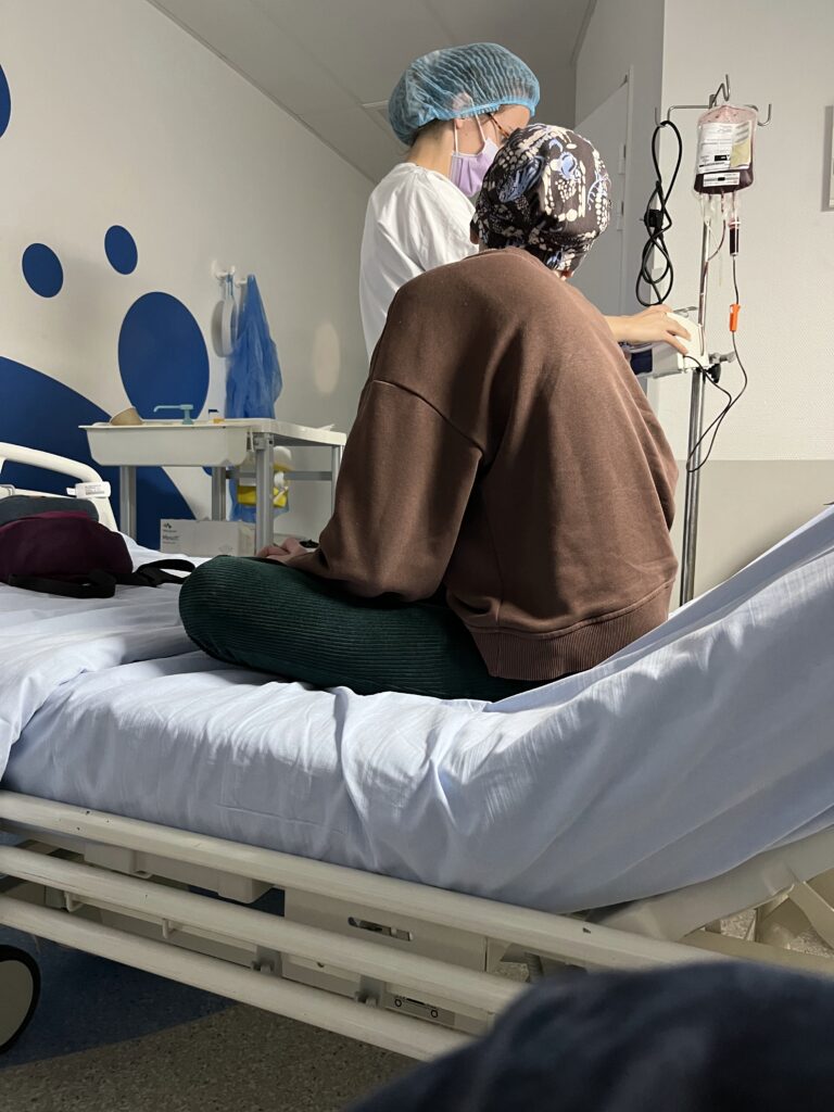 Om half 6 komen ze voor een bloedtransfusie. Uit de bloedtesten bleek dat ze aan de lage kant zat dus er wordt 1 zak bloed gegeven. Deze transfusie duurt 2 uurtjes en iedere 30 minuten komt de verpleegkundige even controleren of alles in orde is.