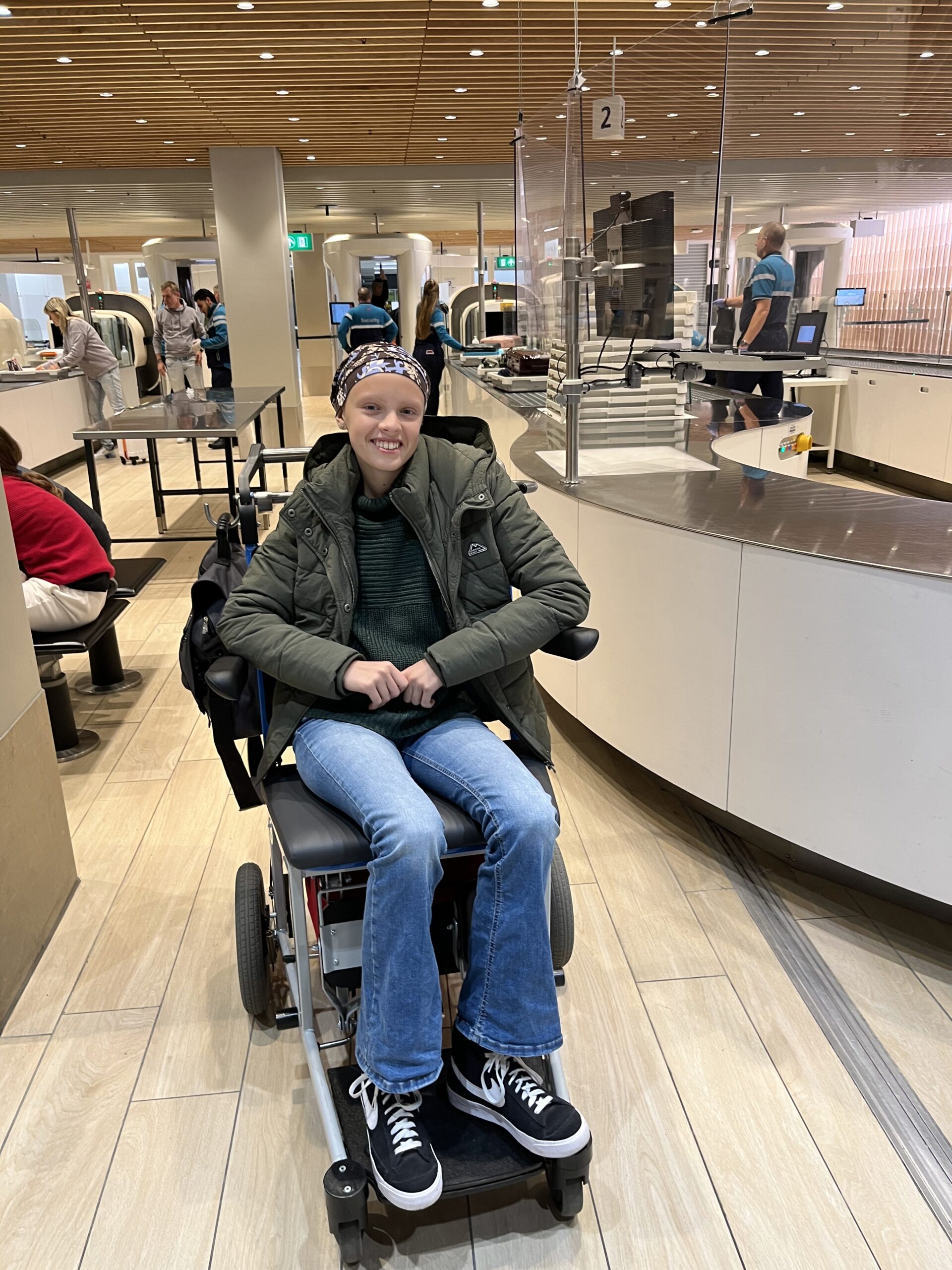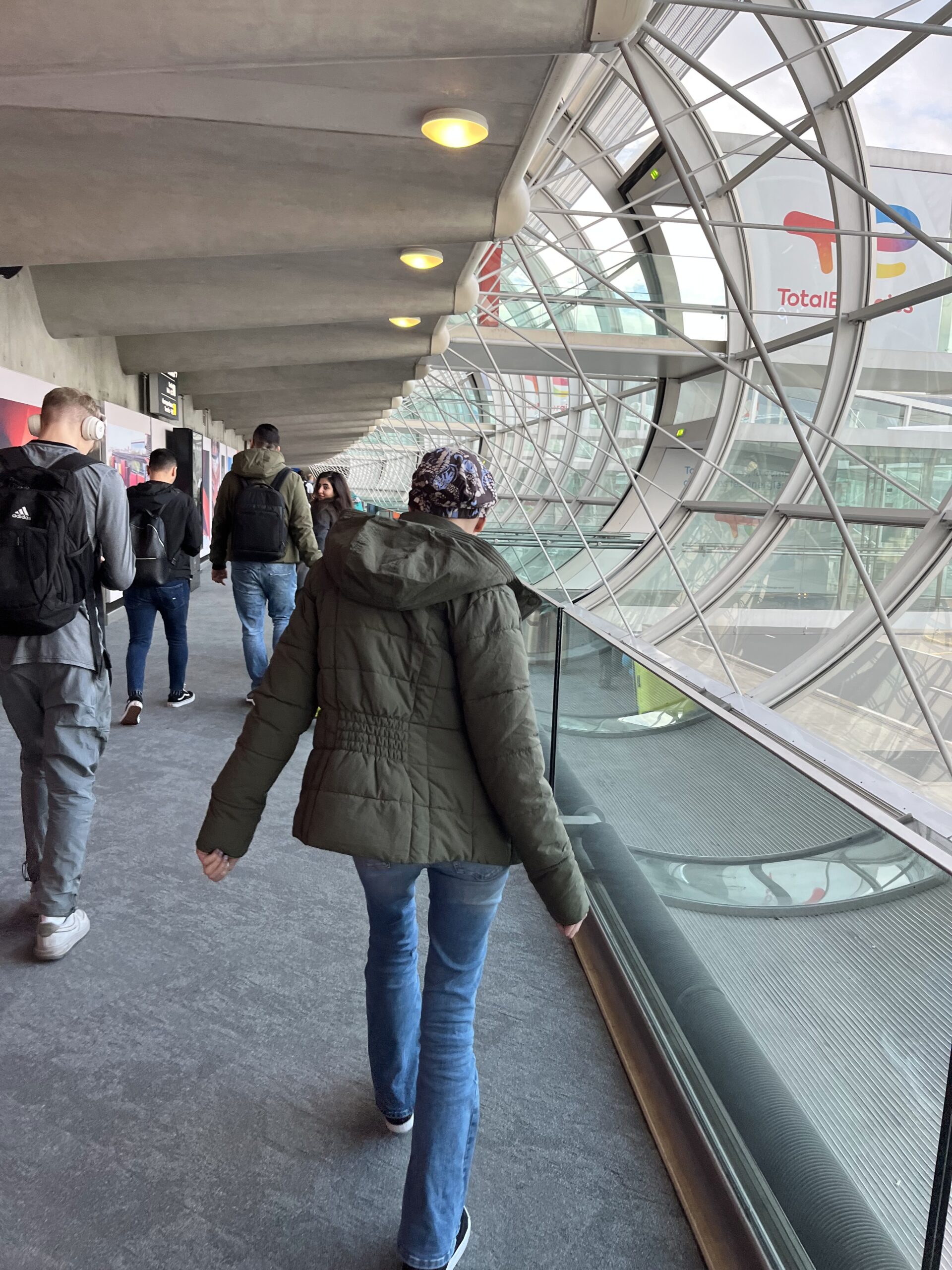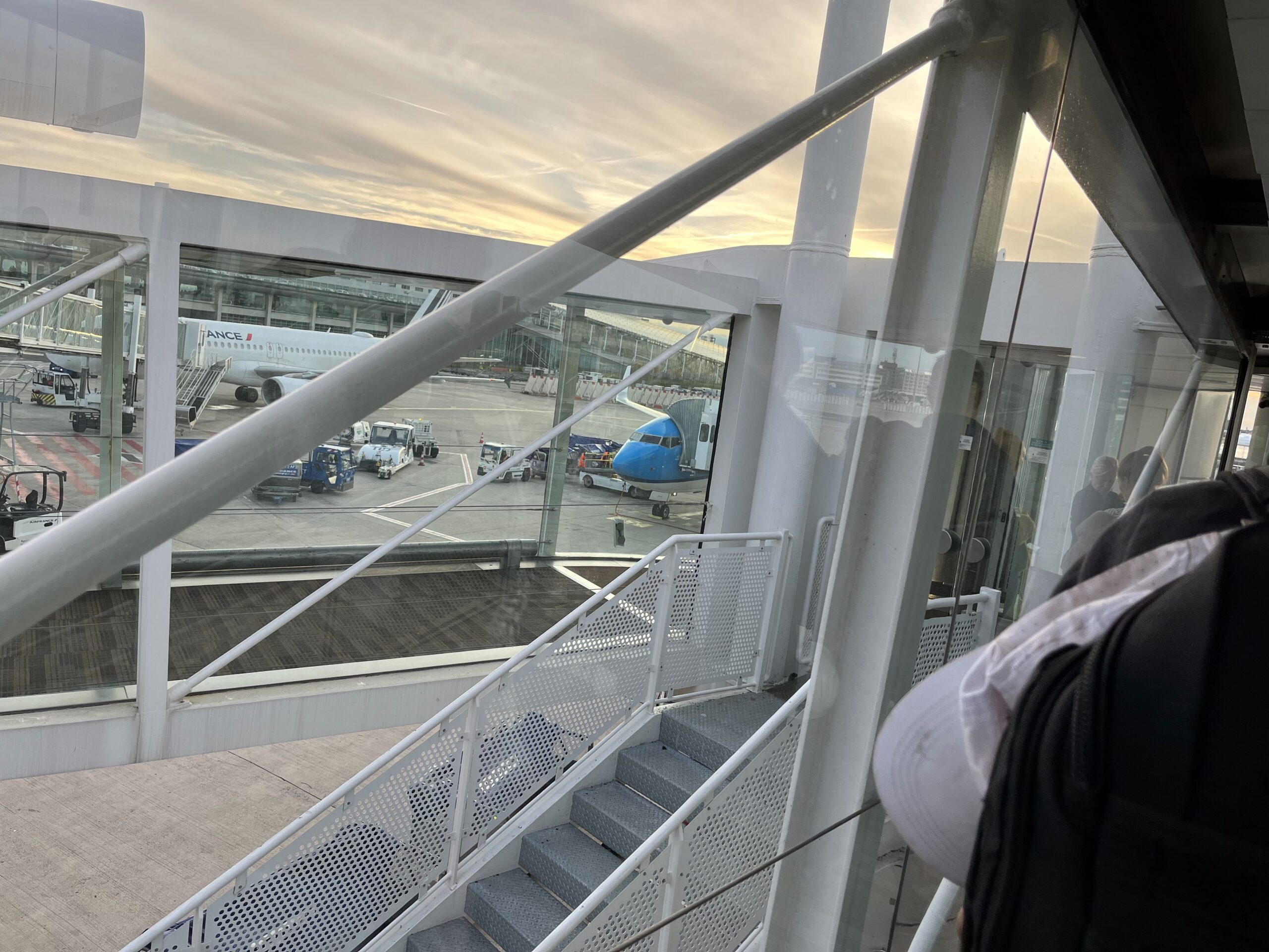 Zondagochtend ging de wekker al om 4:15 uur in de ochtend af want we moesten om 5 uur op Schiphol zijn voor onze 2e trip naar Parijs. Anita brengt Anne en mij naar Schiphol en we zijn precies om 5 uur in de vertrekhal. We gaan meteen aan een KLM medewerkster vragen of we een rolstoel kunnen krijgen. Dat wordt direct geregeld en voordat we het weten zit Anne in een rolstoel en zijn we door de beveiliging. Dat is toch wel heel fijn zo, nergens hoeven wachten en energie sparen voor wat er komen gaat. We zijn nu ruim op tijd dus gaan in het restaurant even heerlijk ontbijten. Om half 8 begint de boarding en wij mogen als eerste het vliegtuig in. Anne mag deze keer aan het raam zitten dus we hebben het gewoon goed voor elkaar deze keer. Om 8 uur vertrekken we en om 9:15 uur staan we al bij de uitgang van vliegveld Charles de Gaulle.