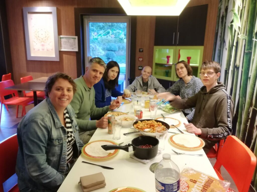 Na wat verwarring kwam de dokter vanochtend vertellen dat Anne het ziekenhuis toch mocht verlaten. Een hele opluchting voor Anne. Nadat de sondevoeding er doorheen was, alle spullen verzameld en de Hollandse stroopwafels aan de zusters was gegeven, vertrok Anne naar het Ronald McDonald huis. Daar werd Anne geïnstalleerd, haar bed verhoogd door een opgevouwen dekbed onder haar matras te leggen zodat ze goed kan liggen en de sondevoeding pomp werd aangesloten. Anne ging heerlijk rusten want ’s avonds kwamen David, Kristel, Eva en Tim naar het RMD huis om samen met ons te eten. We maakten wraps met elkaar en hadden de lange tafel gedekt. Heerlijk eten, gezellig gekletst en ook nog gebakjes gegeten die de visite had meegenomen. De familie nam afscheid en gaan morgen weer terug naar huis.