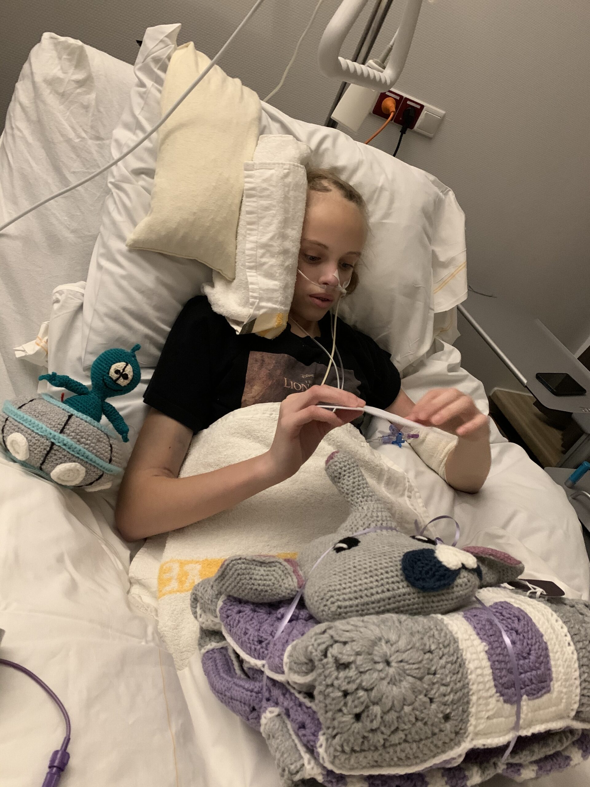 De koorts is er nog wel maar Anne lijkt gelukkig wel wat minder last van de pijn te hebben. Vanmiddag zijn nog even kort haar 2 beste schoolvriendinnen Suzi en Isa langsgeweest en van haar klas ontving ze vandaag een hele mooie deken en 2 knuffels via stichting hartendekens.
