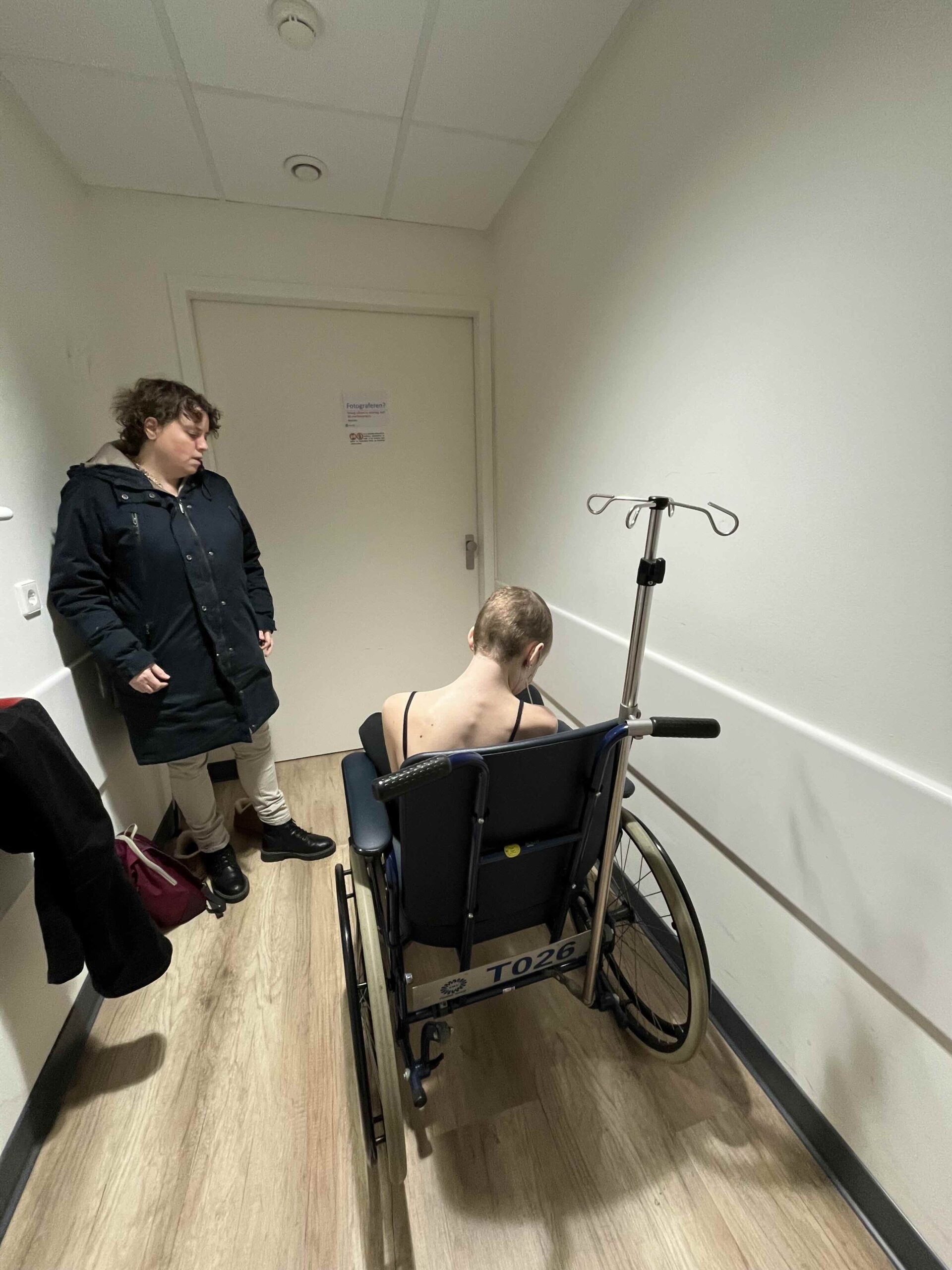 Vandaag mochten we weer met z’n drieën naar het ziekenhuis. Onze eerste stop was vandaag bij de afdeling radiotherapie van het UMC in Utrecht. De 3e en laatste bestraling staat op het programma. Anne is ontzettend moe. We gaan met een rolstoel van het ziekenhuis naar U7 waar de bestraling zal plaatsvinden. Bij het naar binnengaan kiest Anne in eerste instantie een mooie donkerroze kleur voor de verlichting maar dat blijkt al snel te donker te zijn dus hup weer terug de gang in en past Anne het licht aan naar een mooie lichtblauwe kleur. De telefoon sluiten we alvast aan op de geluidsinstallatie en spelen in opdracht van Anne de playlist van Meau. Het valt Anne zwaar deze keer. Ze is erg misselijk, ze hoest vrij veel en het doet haar pijn om op het matras te liggen. Moeilijk om te zien maar uiteindelijk ligt Anne goed, gaan wij naar achteren en gaan ze snel beginnen aan de bestraling. Het lijkt deze keer wat langer te duren (klein kwartiertje) en dat blijkt ook te kloppen. Ze geven wel dezelfde dosis in totaal maar deze keer duurde het wat langer dan de vorige keer. Anne houdt het gelukkig goed voel maar we zijn blij dat ook dit hoofdstuk weer achter de rug is.