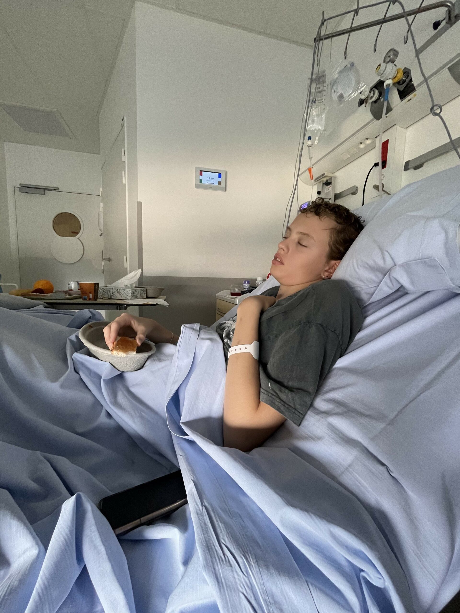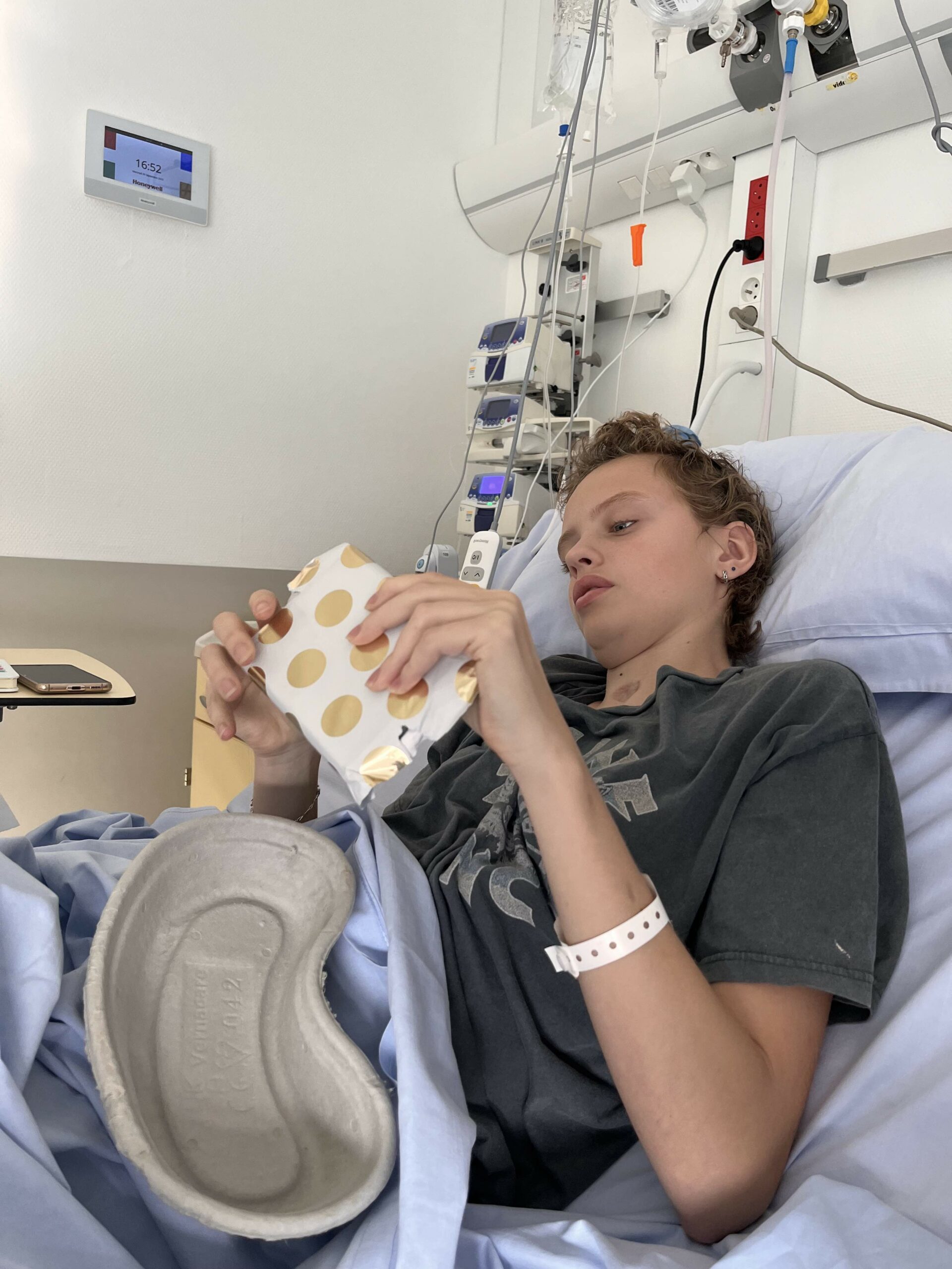 Anne had vandaag zin in thee dus de vraag gesteld of we onze eigen thee mochten meenemen. Daar moest de dokter toestemming voor geven maar uiteindelijk mocht dat. Anne heeft uiteindelijk 2x een heel klein beetje thee gedronken (beter iets dan niets laten we maar zeggen).