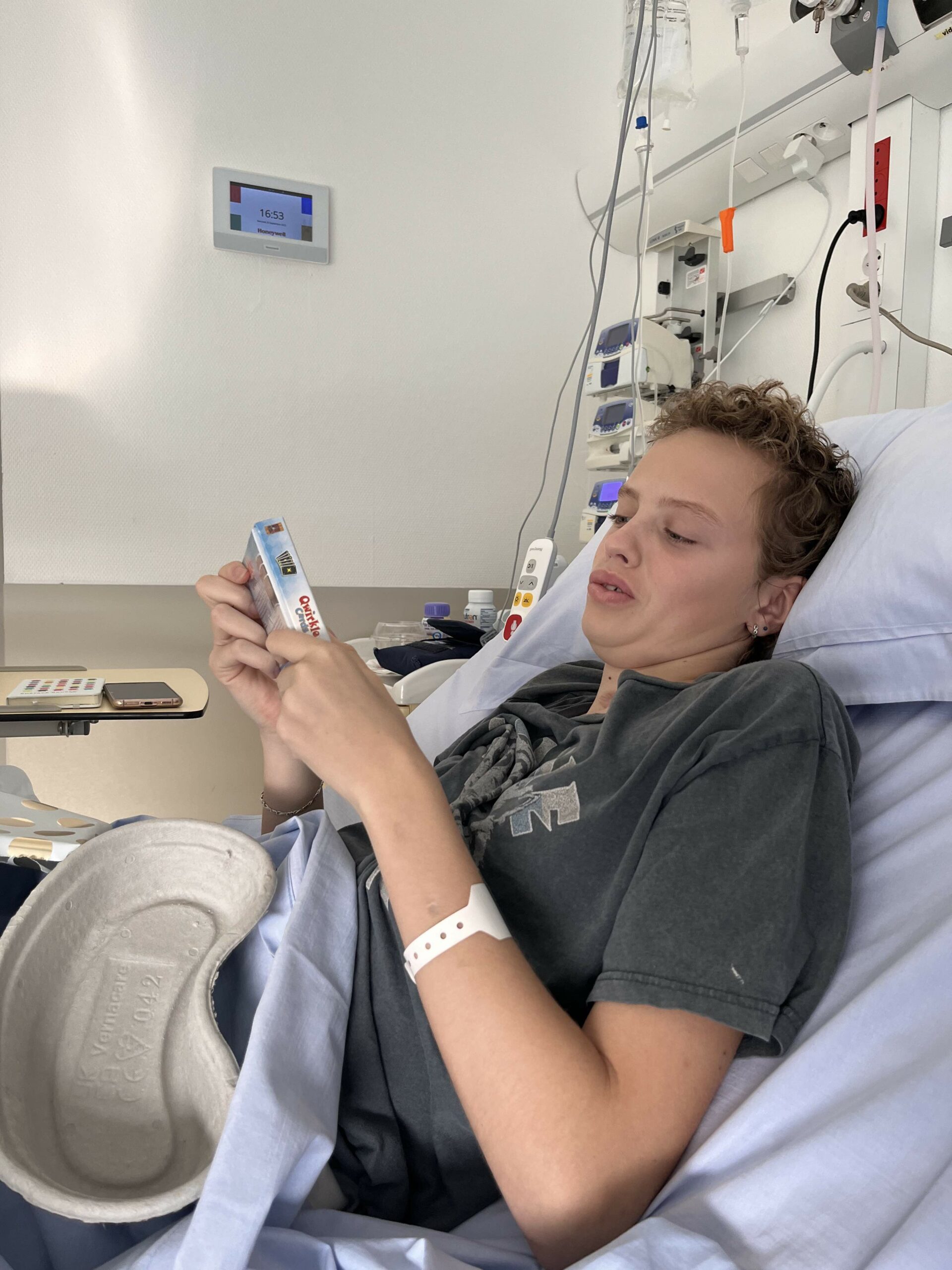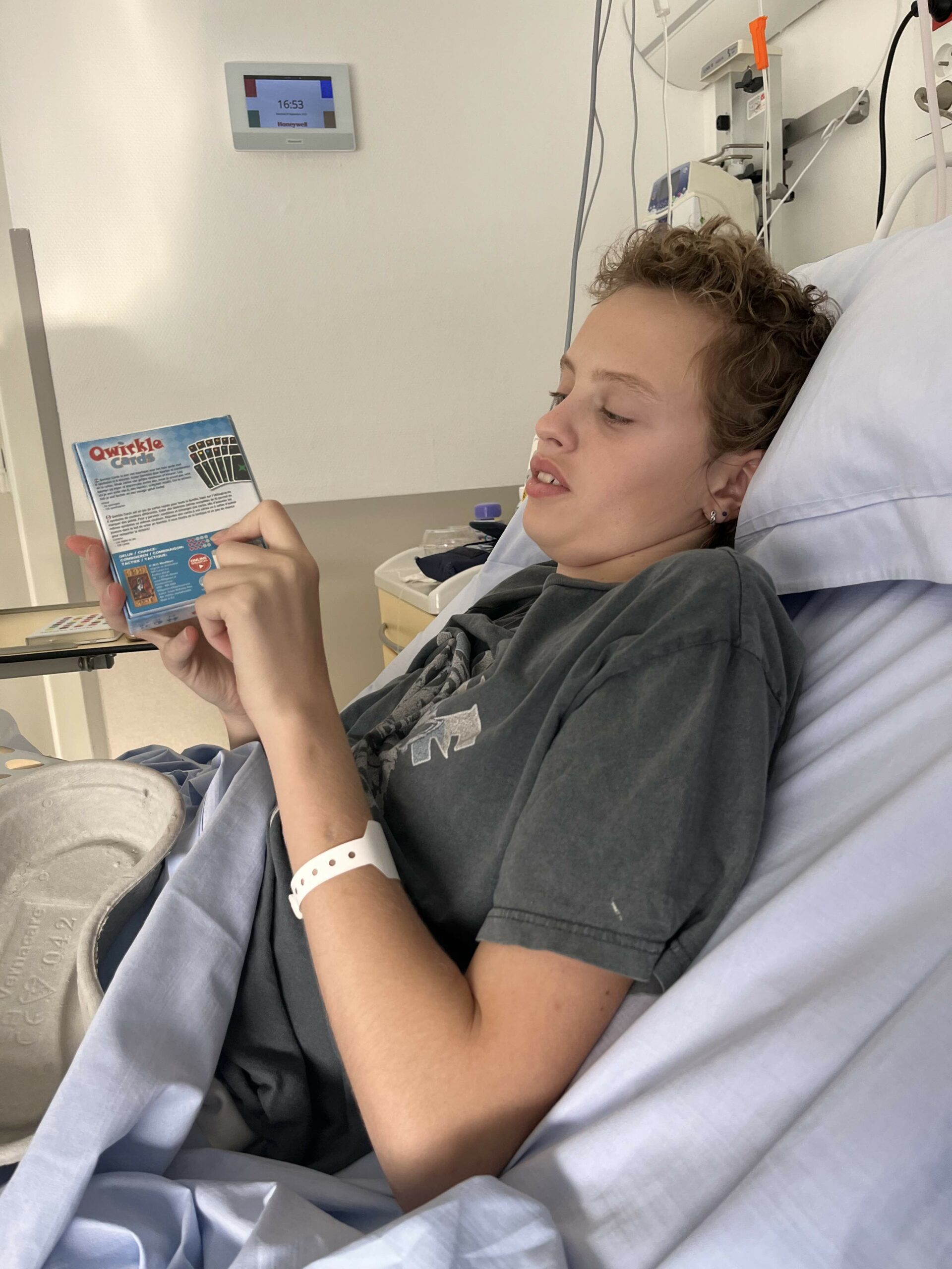 We hebben aan het einde van de dag nog wel een kadootje uitgepakt. Een leuk kaartspel. Anne verteld met een lach op haar gezicht dat ze er heel blij mee is en het graag wil spelen. Dat heeft ze nog niet gezegd of ze wordt misselijk en gaat weer liggen dus dat spelen doen we een volgende keer. Wel een leuk kadoo!