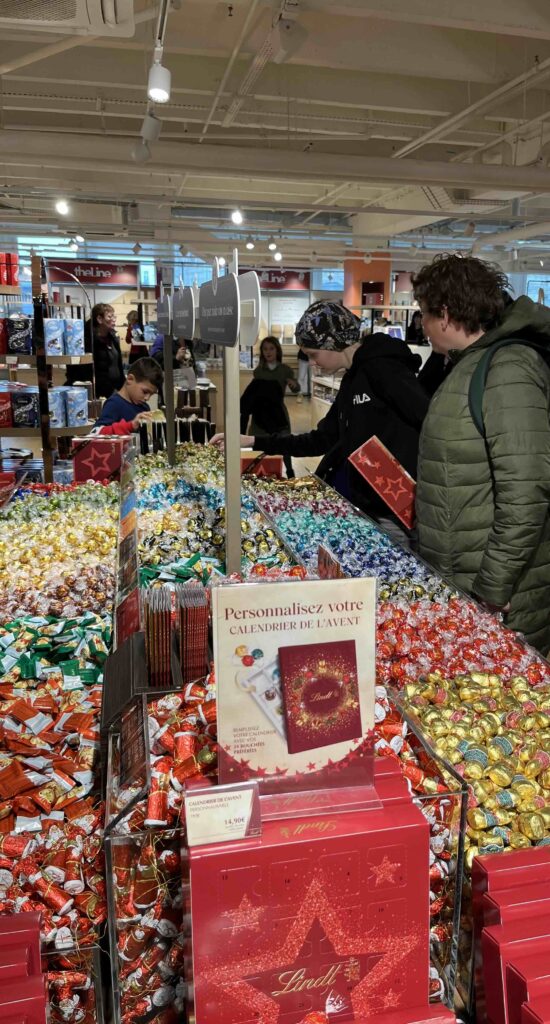 Ook vandaag treffen we het best wel met het weer. Het is wel frisjes maar overwegend droog. Het is een flinke wandeling (Anne uiteraard in de rolstoel) van de parkeergarage naar Lafayette maar wel een leuke route. We lopen onderweg nog even de gigantische grote en mooie Église Saint-Eustache kerk binnen. Bij Lafayette was het behoorlijk druk. Op de begane grond vergapen we ons eventjes aan de veel te duren spullen en besluiten dan naar de 5e verdieping te gaan omdat ze daar kleding voor de kids verkopen. Er is het nodige in de aanbieding maar dan nog zijn de prijzen niet echt leuk dus ook daar waren we snel klaar mee. We bewonderen nog even de prachtige glas in lood koepel en besluiten dan naar het terras te gaan. Helaas gaat er geen lift naar het terras dus Anne moet nog wel een aantal trappen lopen en ik mag de rolstoel tillen. Niet echt fijn voor Anne want ze is erg moe, best wel wat pijn en gewoon niet heel lekker in haar vel. We genieten even van het uitzicht, maken wat foto’s en zijn er dan al snel klaar mee. Weet je wat, we gaan hier gewoon even lekker een hapje eten. Anita en Anja vinden een plekje in een restaurant maar dat vinden Anne en ik qua gezelligheid niet geslaagd dus dan toch maar het duurdere restaurant PanAsia. Anita en Anja moeten even schakelen (duur, alleen maar sushi, wat moet ik hier eten) maar dat slaat al vrij snel om. We besluiten 3 gerechten te bestellen en met elkaar te delen en het eten was meer dan fantastisch. We hadden allemaal wat anders gekozen en het een was nog lekkerder dan het andere. Een geslaagd en gezellig uurtje. Onderweg naar de uitgang komen we langs de chocoladeafdeling en daar ziet Anne iets wat ze al heel lang wil; Een adventskalender zelf mogen vullen met 24 (verschillende) chocolade producten. Mag ik dat?! Maak ik er eentje voor jou Stan! Doe maar. Stan mag niet kijken dus ik ga met Stan naar de elektronica afdeling zodat de dames op hun gemak zich kunnen verlekkeren aan al het (verboden) lekkers. Anne kijkt er zelf nog het meest verlekkerd bij. Wij waren er niet bij maar blijkbaar kregen ze tijdens het vullen zelf ook nog wat chocolade aangeboden dus dit was hoe dan ook geslaagd.