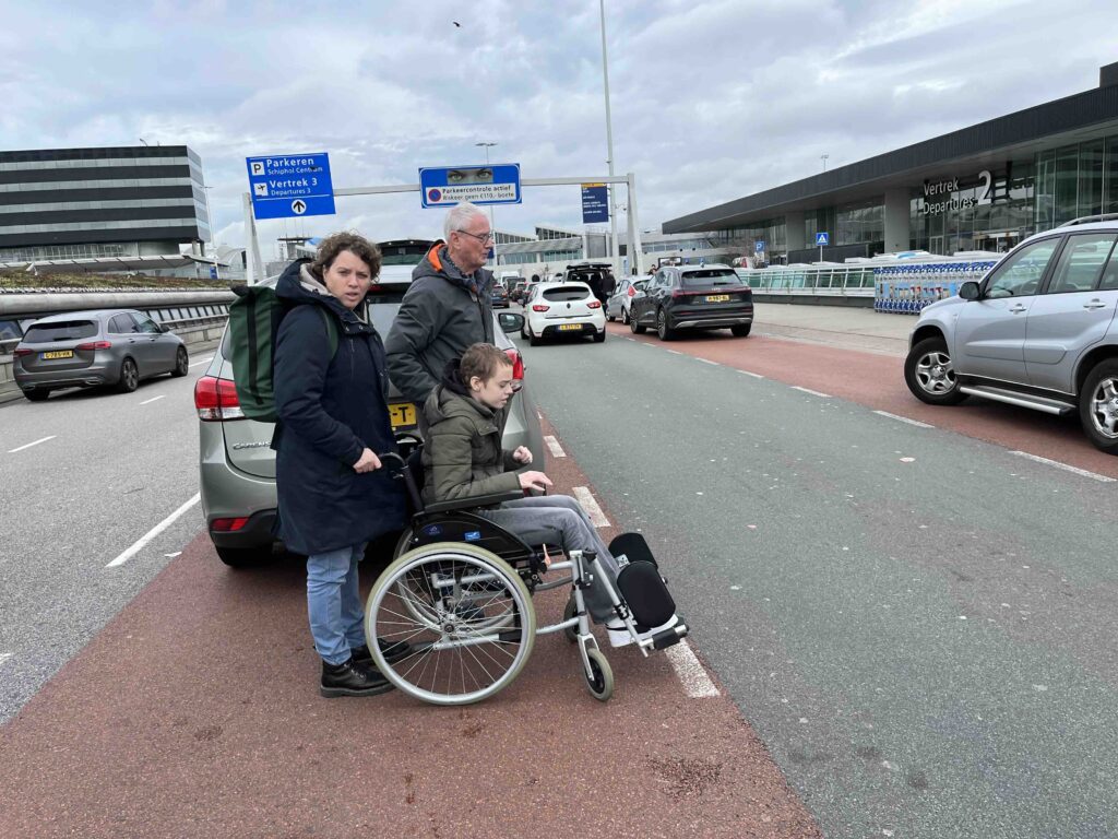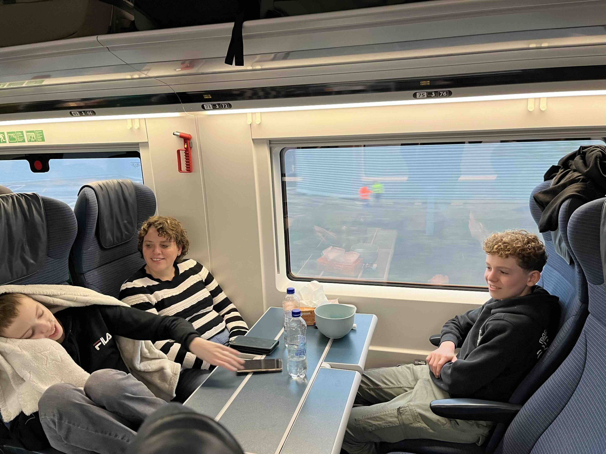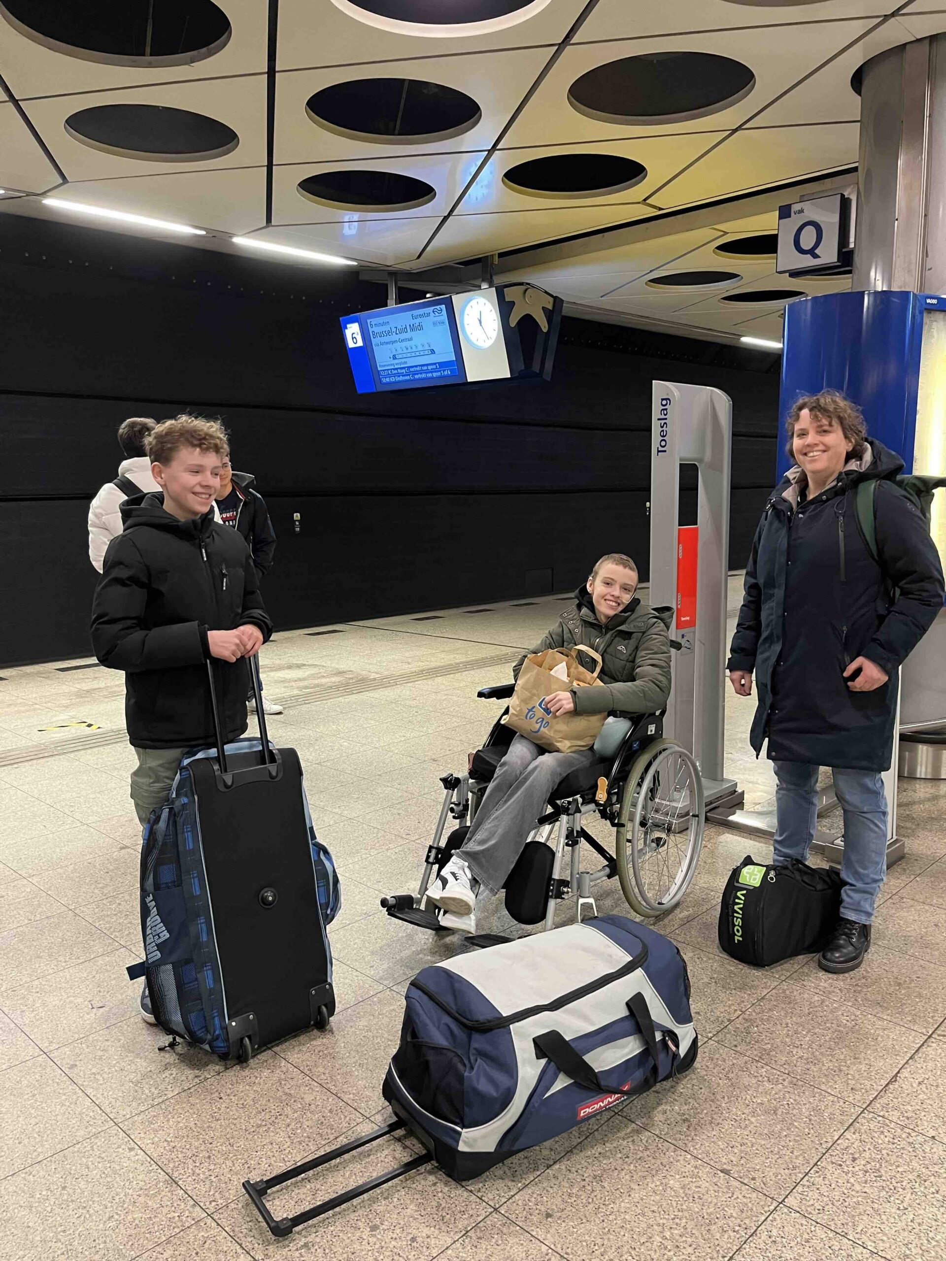 Om kwart over 11 kwam opa Jan om ons met de auto naar Schiphol te brengen. In de auto waren we stilletjes. Iedereen is eigenlijk een beetje (erg) moe. We hebben er zin in maar we zijn nog niet euforisch, dat gevoel moet nog komen. We zijn mooi op tijd op Schiphol. We kopen nog snel even wat broodjes bij de AH omdat we de thuis klaargemaakte broodjes waren vergeten (hopelijk blijft het daarbij) en daarna naar spoor 5-6. We hebben maandag een inklapbare rolstoel gehuurd bij de Vegro en daar maken we dankbaar gebruik van. Anne is te moe om echt te lopen en dat is nu gelukkig ook niet nodig. Om 12:33 uur komt onze Eurostar trein aan. We laden onze spullen in en zoeken onze plek. Het eerste deel van de reis tot aan Brussel zitten we helaas niet bij elkaar. Anita zit bij Anne en ik bij Stan. Het is warm en benauwd in de trein maar ondanks dat gaat het gelukkig goed.