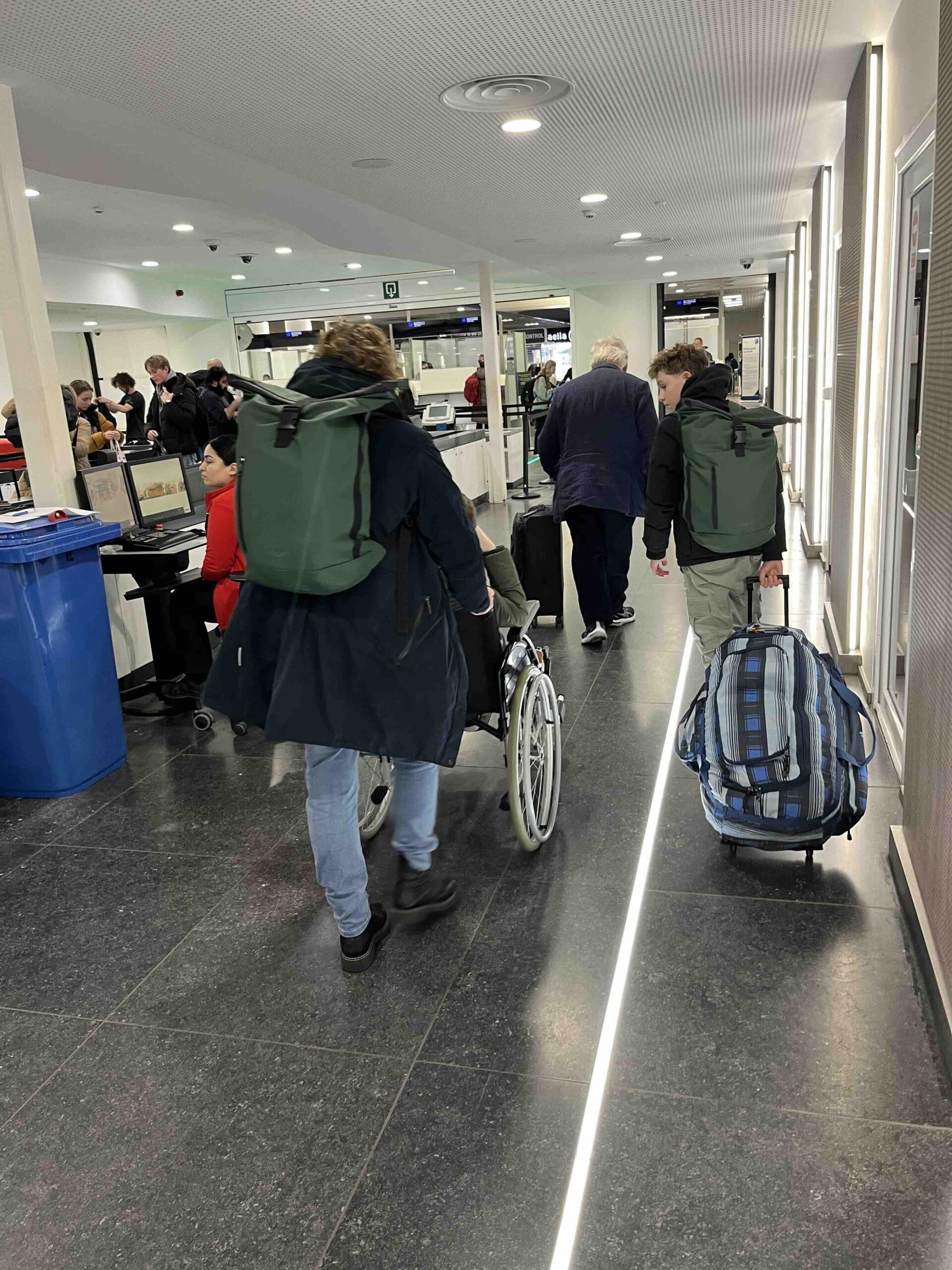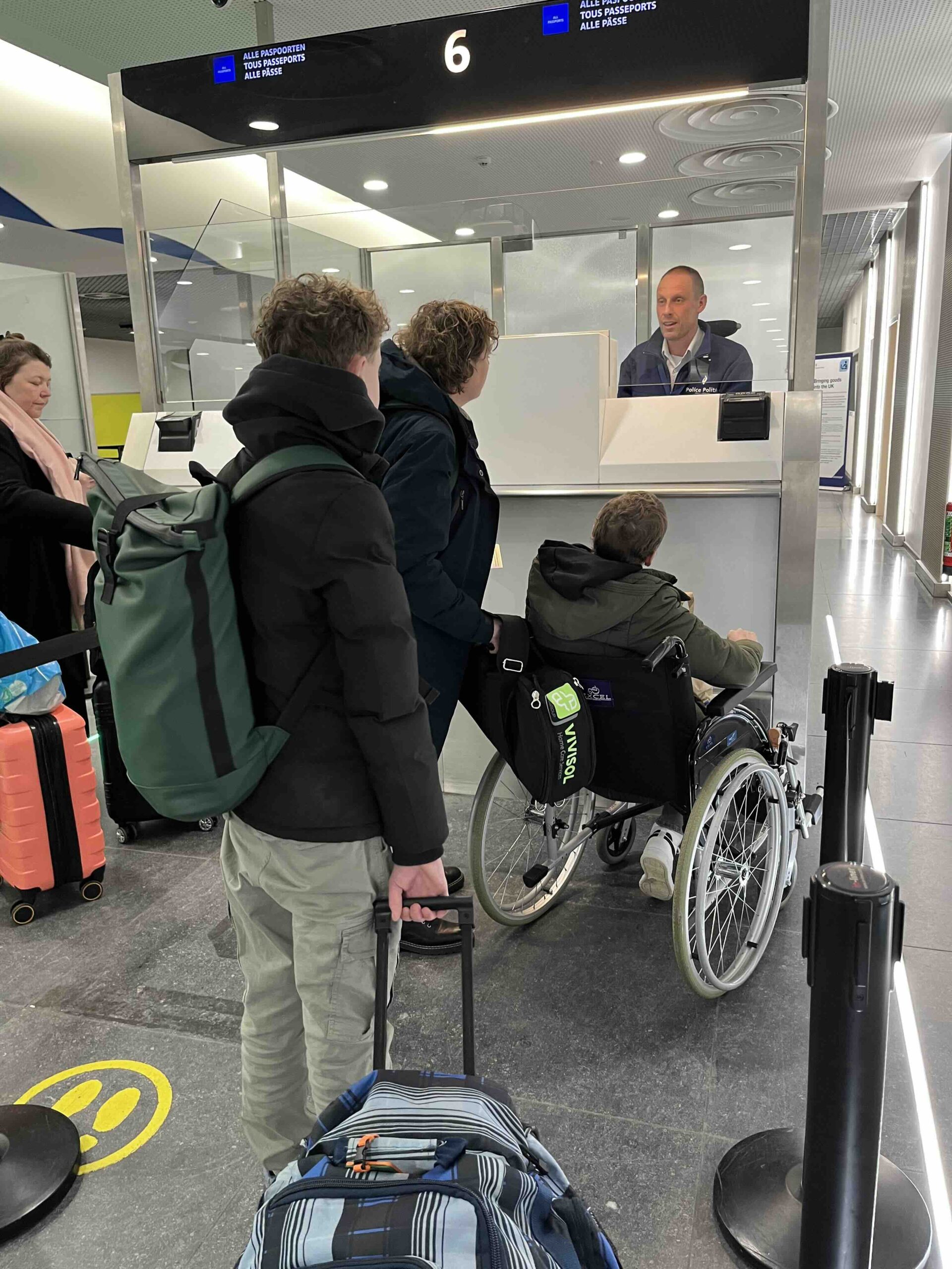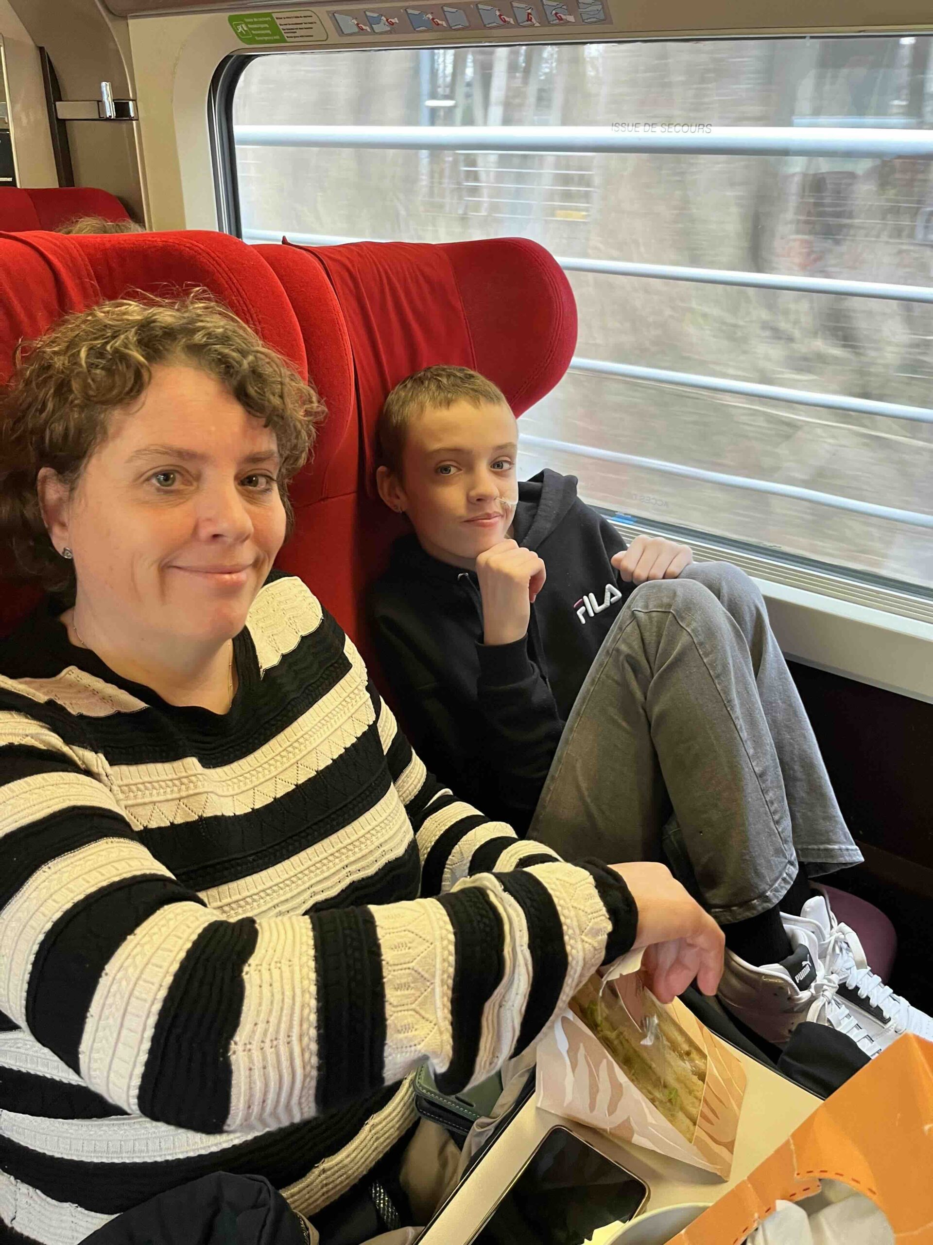 Om kwart over 11 kwam opa Jan om ons met de auto naar Schiphol te brengen. In de auto waren we stilletjes. Iedereen is eigenlijk een beetje (erg) moe. We hebben er zin in maar we zijn nog niet euforisch, dat gevoel moet nog komen. We zijn mooi op tijd op Schiphol. We kopen nog snel even wat broodjes bij de AH omdat we de thuis klaargemaakte broodjes waren vergeten (hopelijk blijft het daarbij) en daarna naar spoor 5-6. We hebben maandag een inklapbare rolstoel gehuurd bij de Vegro en daar maken we dankbaar gebruik van. Anne is te moe om echt te lopen en dat is nu gelukkig ook niet nodig. Om 12:33 uur komt onze Eurostar trein aan. We laden onze spullen in en zoeken onze plek. Het eerste deel van de reis tot aan Brussel zitten we helaas niet bij elkaar. Anita zit bij Anne en ik bij Stan. Het is warm en benauwd in de trein maar ondanks dat gaat het gelukkig goed.