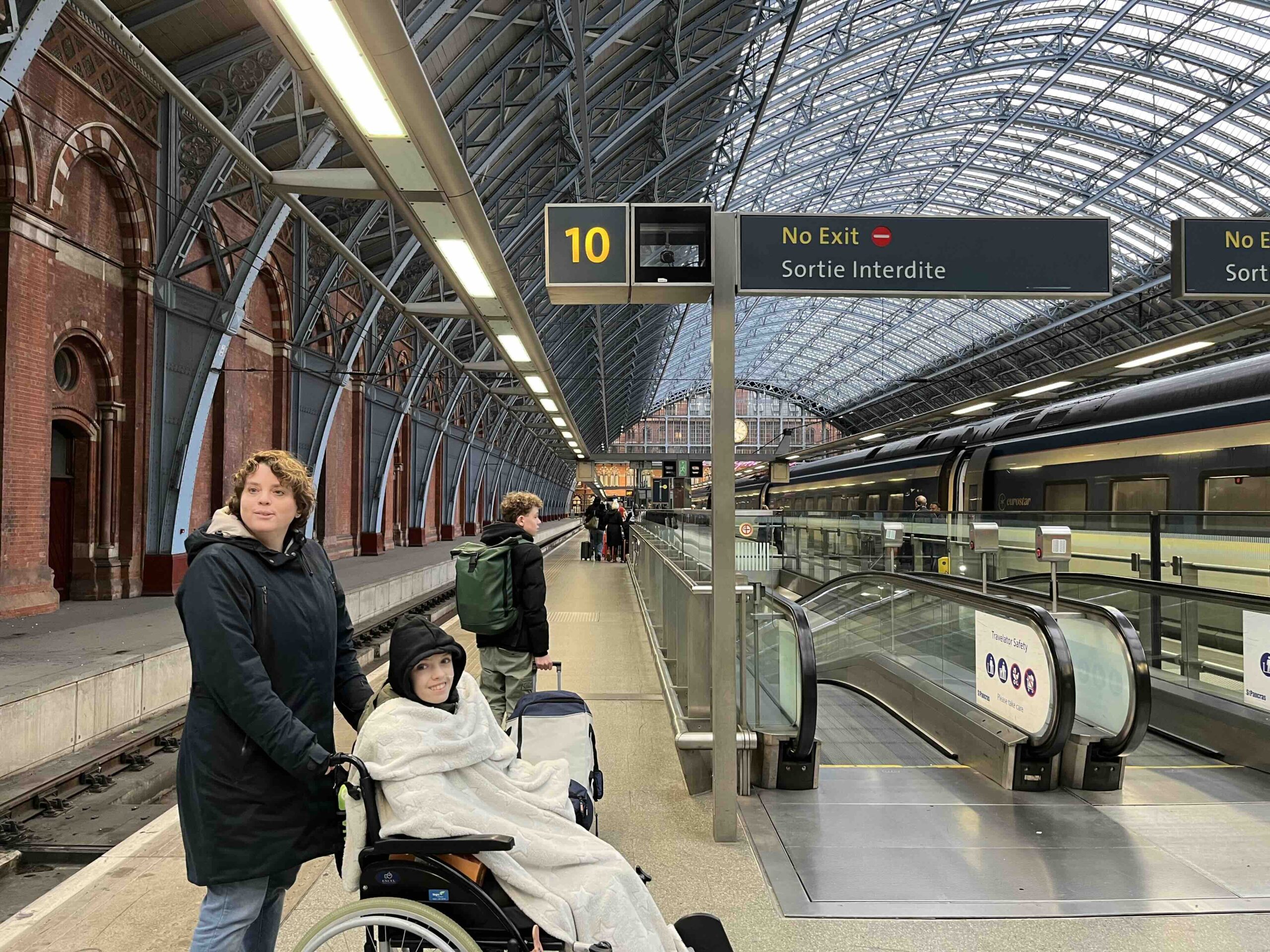 In Brussel moeten we overstappen op de Eurostar naar Londen. Dat gaat gelukkig hartstikke soepel. Anne in de rolstoel doet wonderen. We hoeven nergens iets te vragen, mensen komen bijna op ons afrennen om aan te geven dat wij de binnendoor route mogen nemen. Eerst bij check-in, dan bij de bagagecontrole en daarna bij de paspoortcontrole. Ik maakte me hier vooraf wat zorgen over omdat we maar 35 minuten hadden en het nog best een stukje lopen was maar dit verliep perfect. Kregen ook geen lastige vragen, moesten alleen even de zuurstoffles uit de tas halen om te laten zien wat het was en dat was het. Snel naar de trein. Gelukkig was deze trein veel minder druk en zaten we met z’n viertjes bij elkaar. Veel fijner. Voor Anne hebben we het met een dekentje comfortabel gemaakt waarna ze ongeveer de hele reis heeft geslapen. Anne vond de reis vooraf door de tunnel wel een beetje spannend (onder water) en ik vond de reis door de tunnel een beetje spannend omdat ik niet goed wist of het nog iets met de luchtdruk zou doen. Weet ik nog steeds niet maar de reis verliep heel voorspoedig. Anne heeft geen aanvallen gehad en de zuurstoffles hebben we niet hoeven gebruiken. Superfijn.