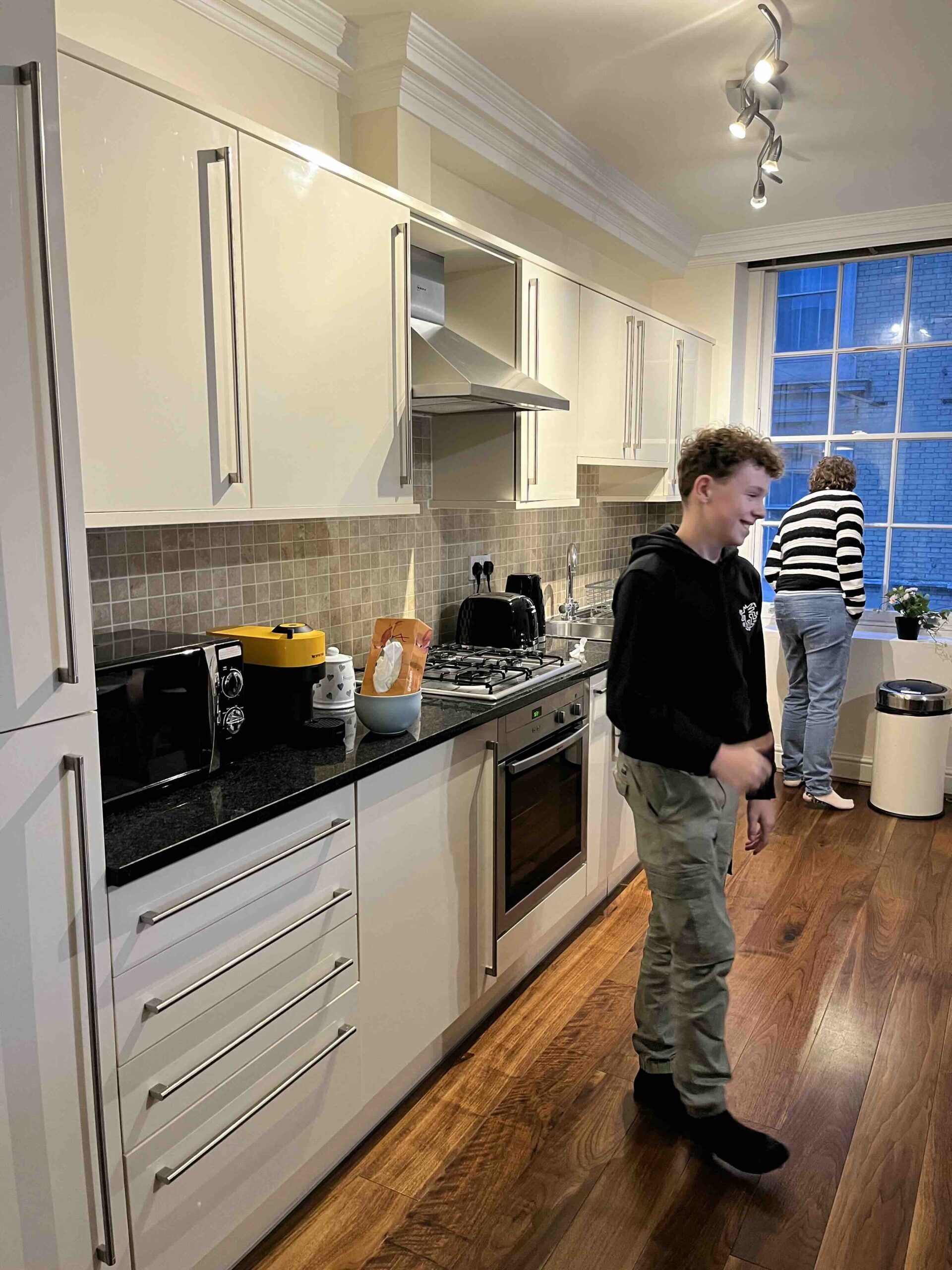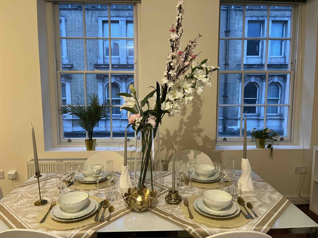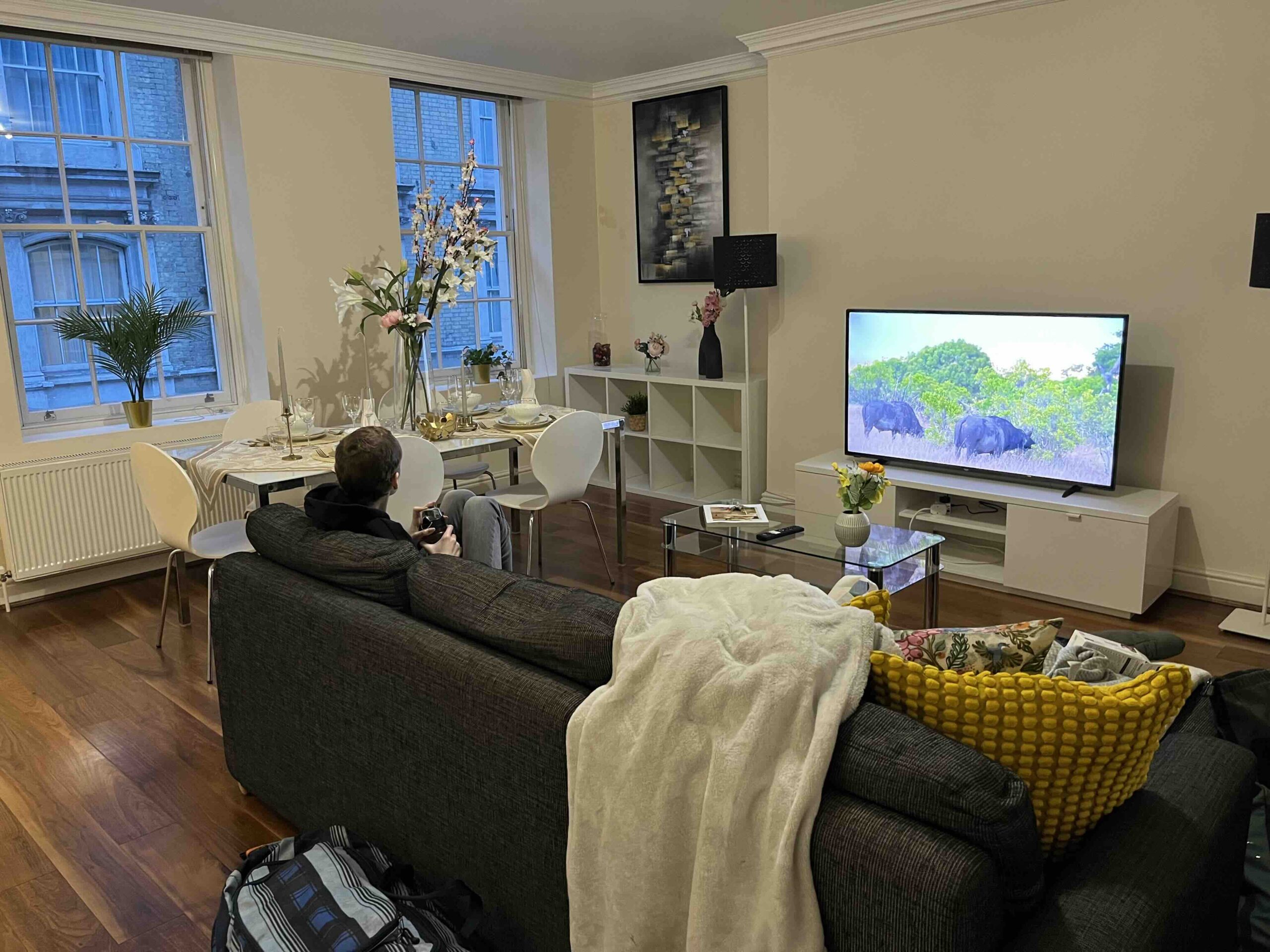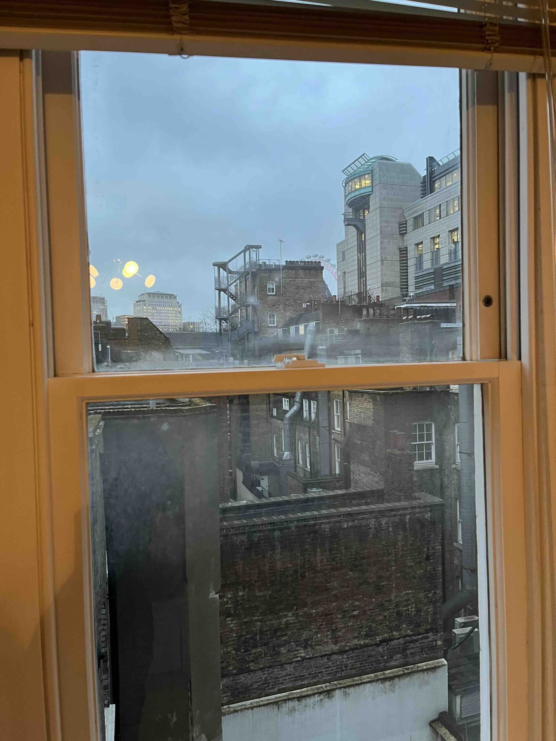 Om 16:00 uur (Engelse tijd, het is hier een uurtje vroeger) komen we aan op Saint Pancras Station in Londen. Het weer is bar en boos. Ik wilde een Uber bestellen maar het is koud, Anne is moe en ik zie een typisch Londense taxi staan en de keuze is snel gemaakt. Het is druk op de weg maar met zo’n 25 minuten staan we voor de deur van het appartement. Ik had ondertussen al app-contact gehad met onze host Giovanni dus hij stond ons al op te wachten. We betreden een prachtig pand, komen in een grote brede hal terecht en gaan dan met de lift naar de 3e etage waar ons appartement #7 is. Het is meteen duidelijk, we hebben een goede keuze gemaakt. Het is een prachtig, groot en statig appartement. Twee grote slaapkamers en 2 badkamers waarvan 1 een badkamer ensuite is. Vanuit de slaapkamer zien we een deel van de Londen Eye. We zitten hier goed, we gaan het hier wel even volhouden denk ik.