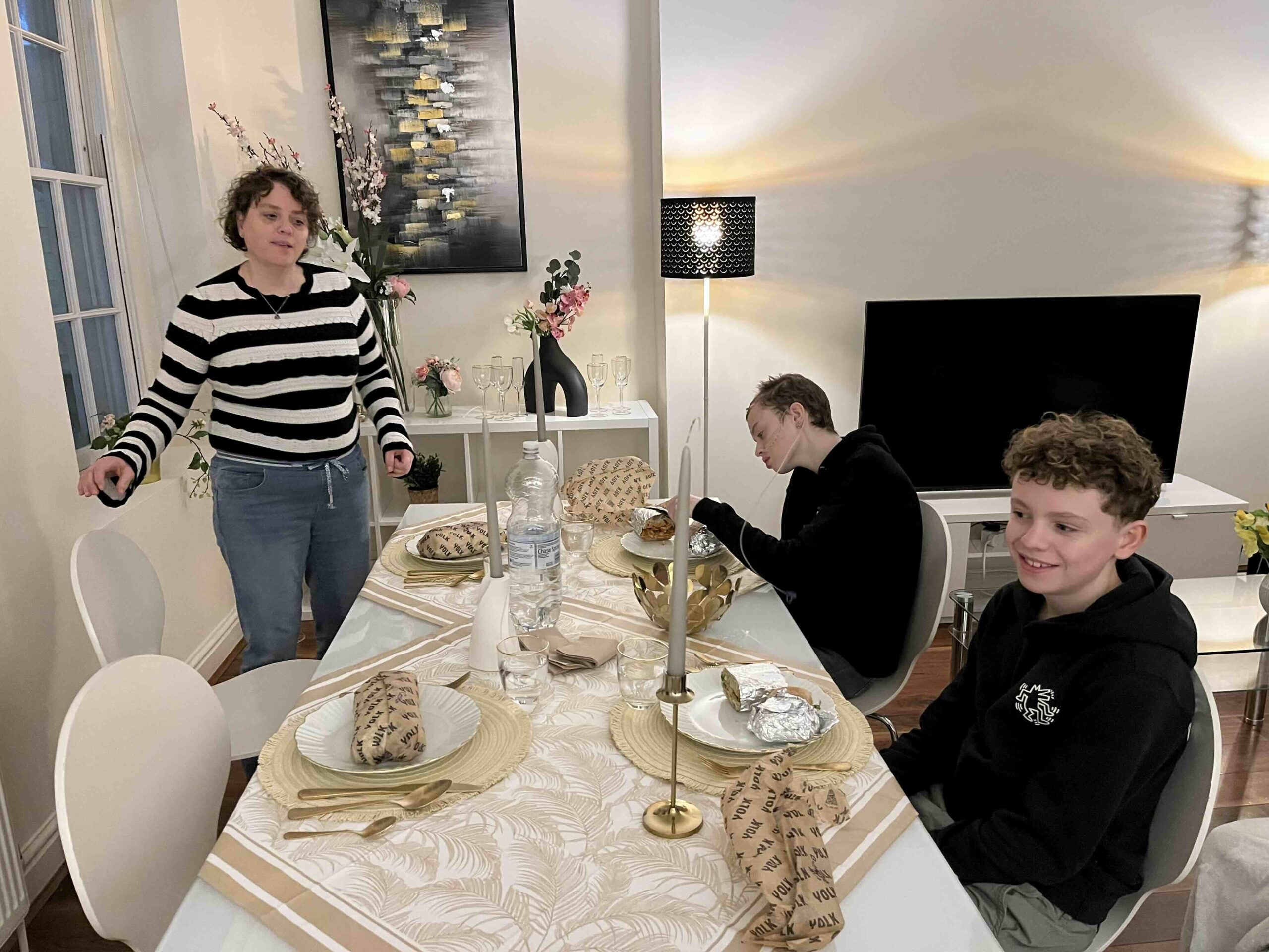 Anne is erg moe dus Stan en ik gaan even met z’n tweetjes op onderzoek en boodschappen doen. We zitten op een perfecte locatie, direct naast Charing Cross station en vlakbij Trafalgar Square. Samen met Stan loop ik over Strand op zoek naar een supermarkt die we al heel snel vinden. Boodschappen gedaan voor het ontbijt en daarna op zoek naar een zaak voor lekkere broodjes. We komen uit bij YOLK waar ze echt heerlijke broodjes verkopen. Via beeldbellen met Anne en Anita bepalen we welke 4 broodjes er moeten komen voor ons diner van vanavond. We zijn te moe voor iets anders maar dit is prima. Na het eten gaat Anne in bad en doe ik wat spelletjes met Stan. Anita geeft Anne nog een massage en dan is het tijd om te slapen. Het bed is wel een dingetje. Het matras is hard, de kussens anders en het bed kan niet versteld worden in hoogte dus het is zoeken naar de minst slechte optie. Er worden kussens onder het matras gestopt om wat hoger te liggen, dekentjes onder het hoeslaken gelegd om zachter te liggen zodat Anne hopelijk lekker kan slapen.