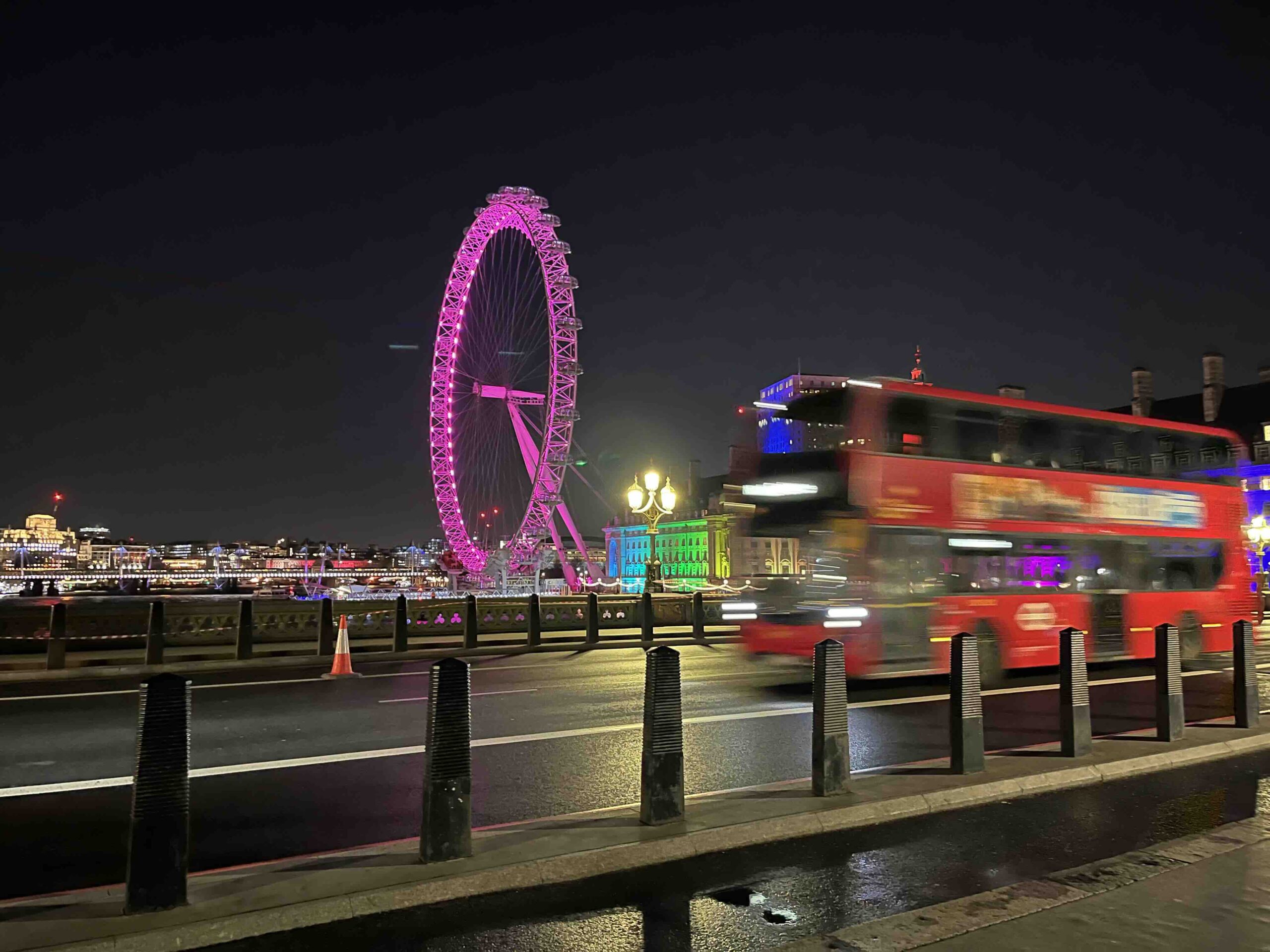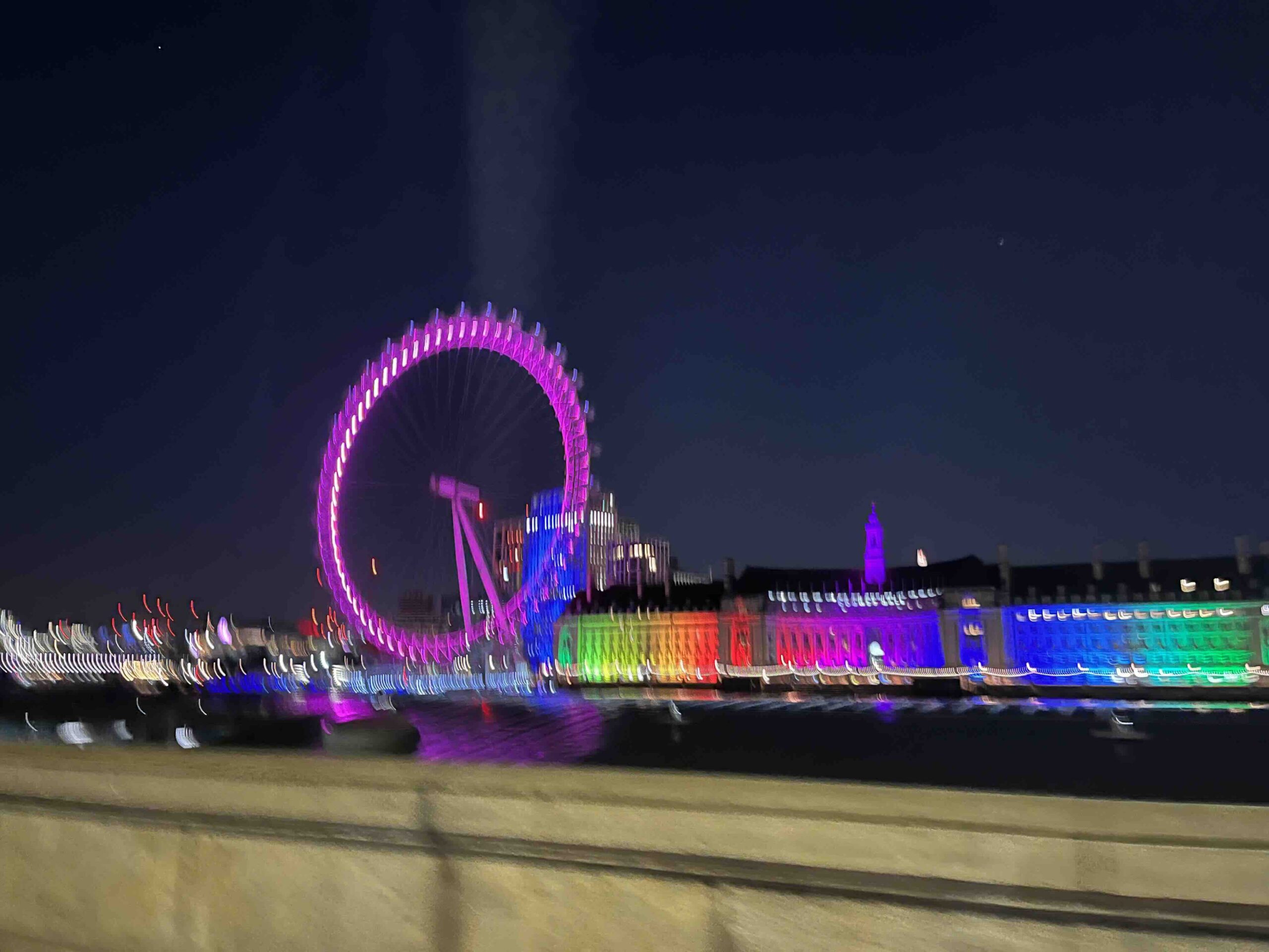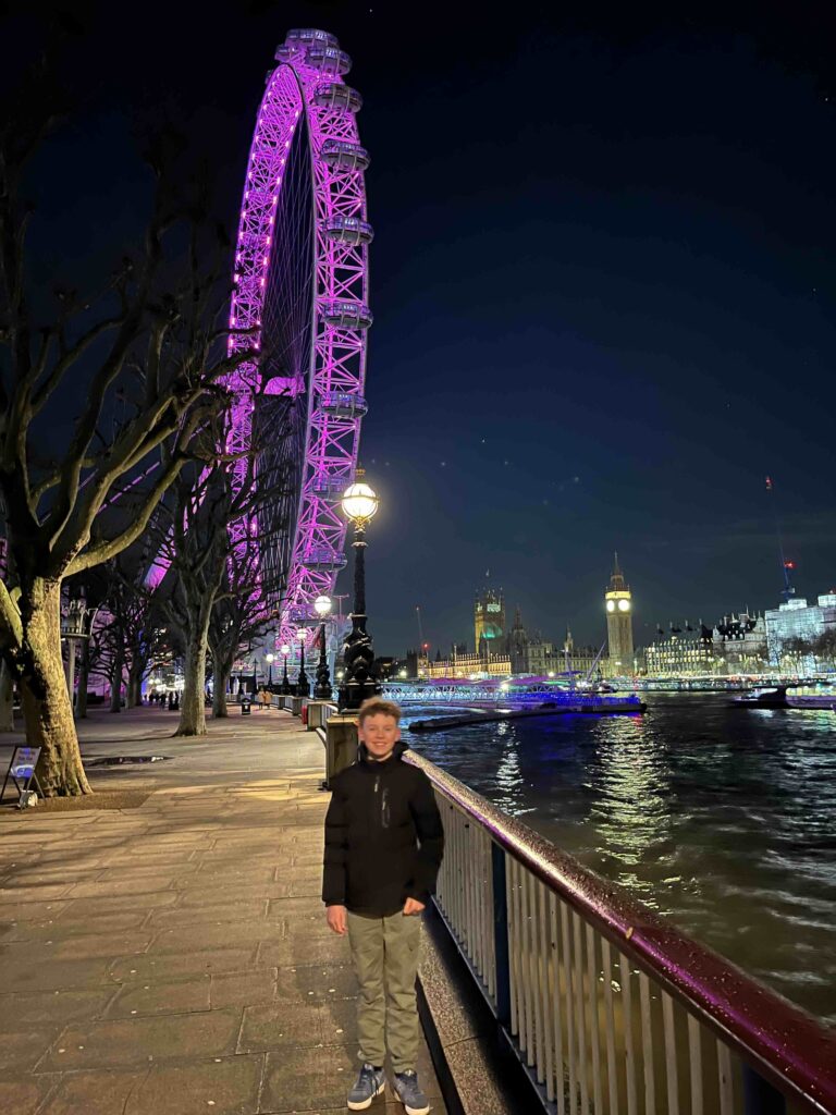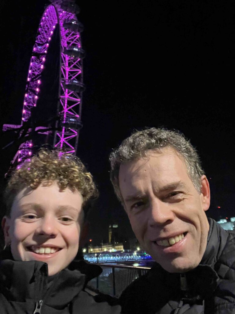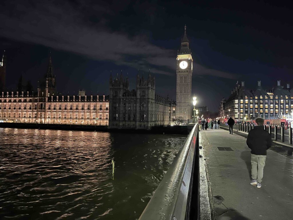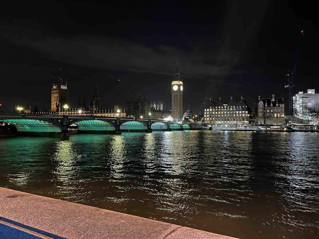 Stan wil eigenlijk nog wel een rondje lopen dus ga ik met hem nog even de omgeving verkennen. Het is inmiddels droog geworden en eigenlijk best lekker weer. Wat zitten we op een fantastische plek. Binnen de kortste keren lopen we over de Theems, lopen we bij het reuzenrad de Londen Eye en staan we oog in oog met de prachtig verlichte Big Ben. Het is een heerlijke wandeling en gezellig om zo even samen met Stan te kunnen praten. Een echt genietmomentje.