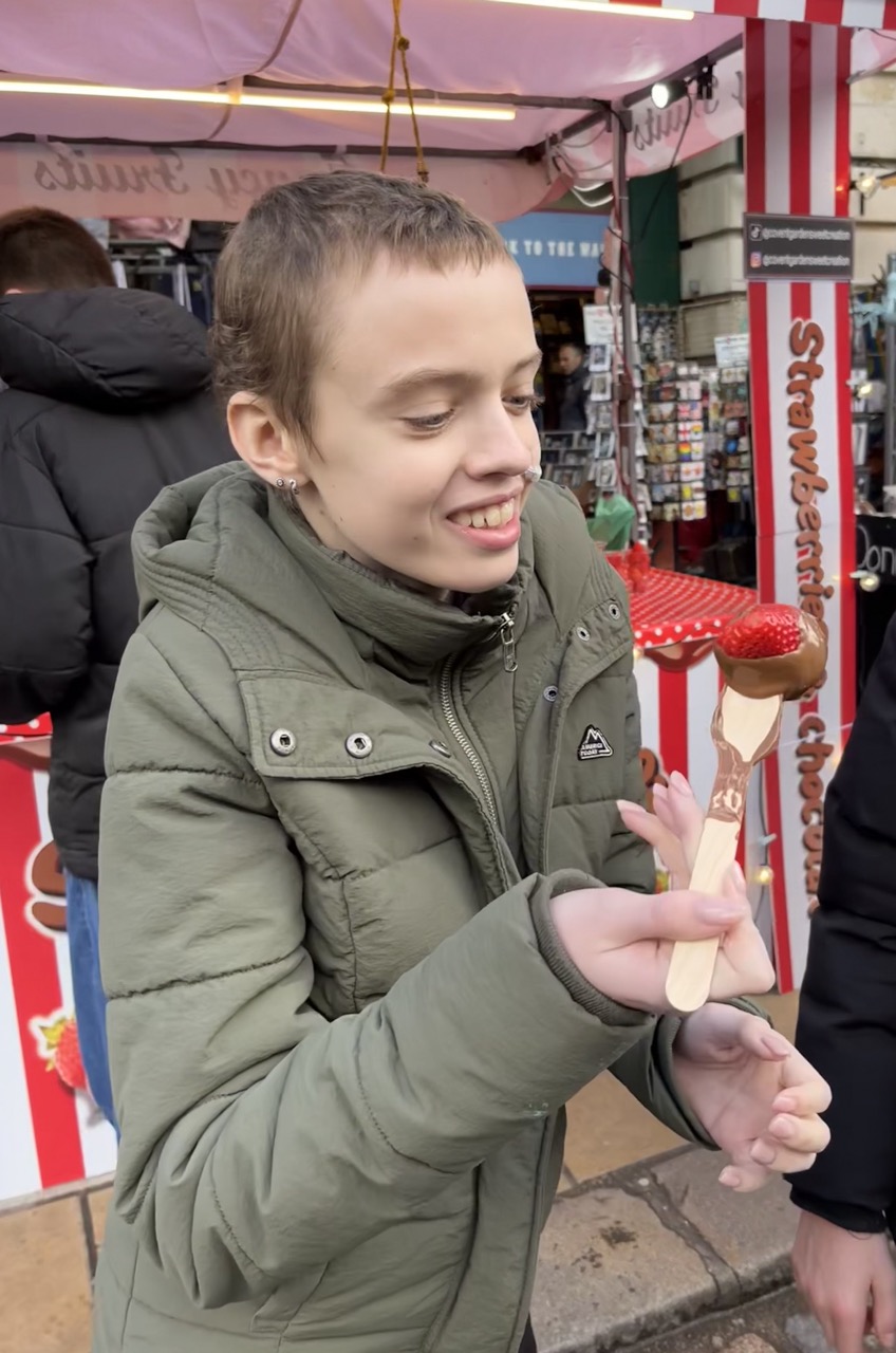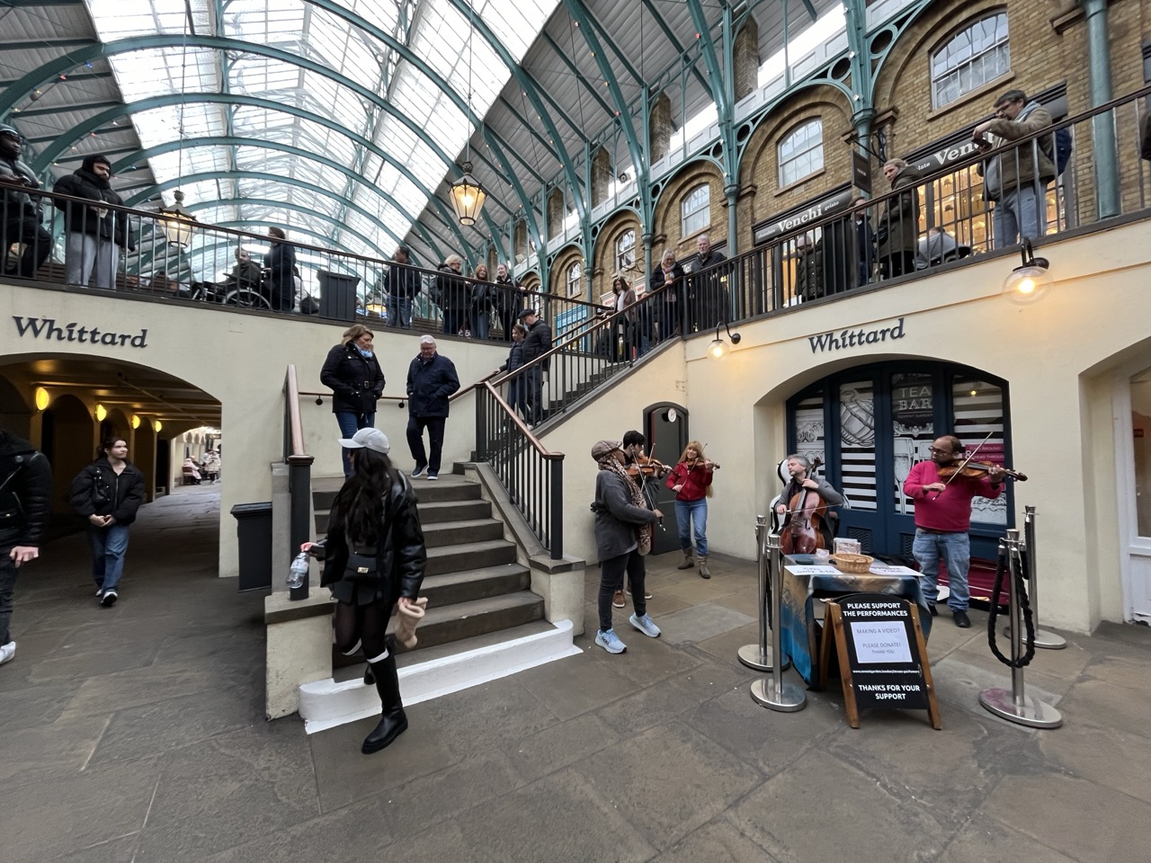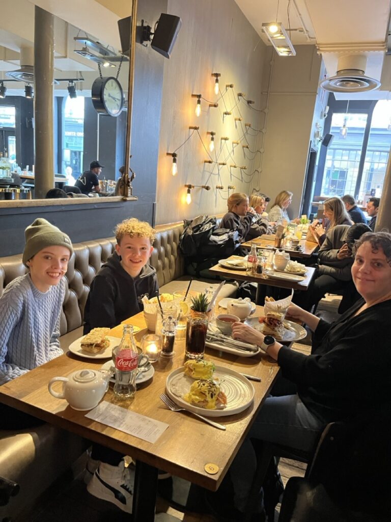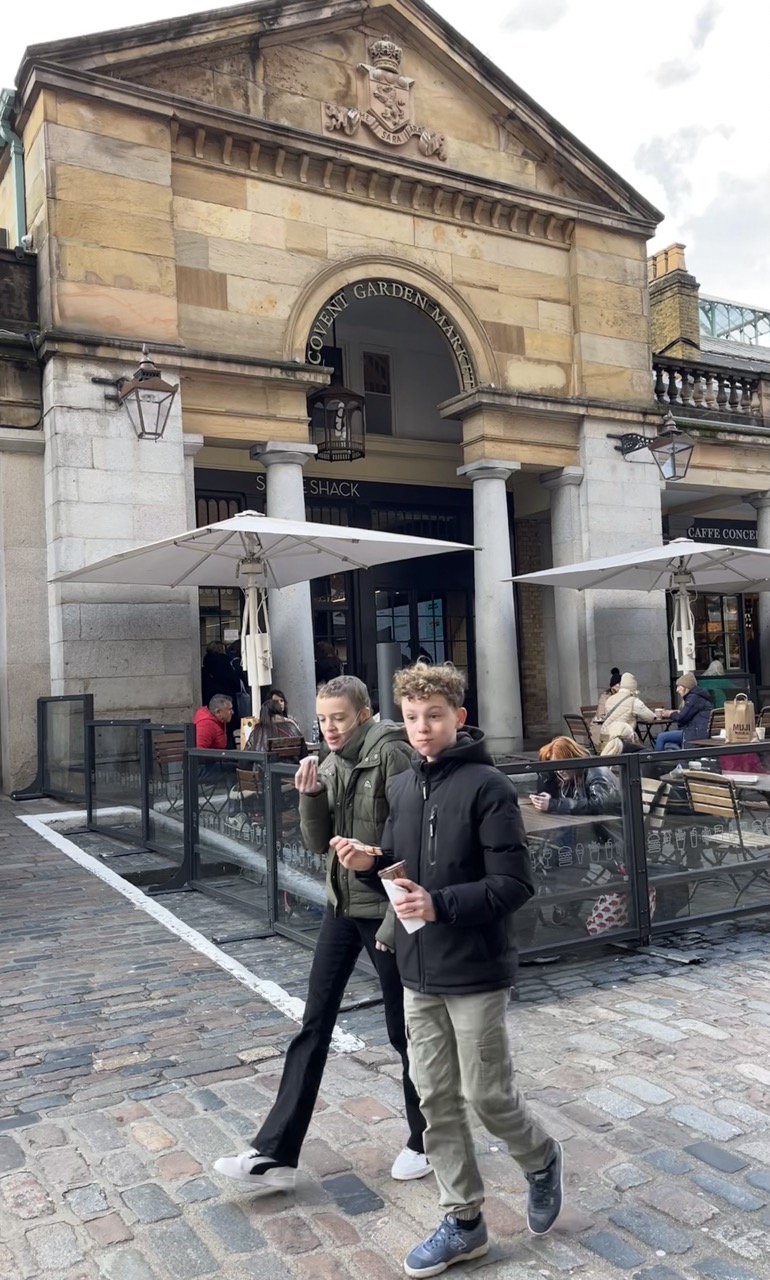 Na een rustige start van deze dag gaan we op pad. Het plan is om vandaag in de buurt de omgeving lopend te verkennen. Als we onderweg iets leuks zien lopen we naar binnen en zo staan we binnen 5 minuten al in de wizzarding world van Harry Potter. Via Trafalgar’s square gaan we richting Covent Garden. De belangrijkste winkel daar is Glossier waar we absoluut naar binnen moeten. Ze koopt daar een veel te dure maar wel hele mooie mascara. Helemaal blij. We lopen over de markt van Govent Garden, zien verschillende (muzikale) optredens van straatartiesten, gewoon gezellig. Enige minpuntje is dat de straten daar soms echt heel vervelend zijn voor de rolstoel waardoor Anne best wel veel pijn begint te krijgen. Tijd dus om zoek te gaan naar iets waar we kunnen eten. Het moet gezellig zijn en er typisch Engels uitzien. Op de vraag van Stan en Anne wat dan typisch Engels is moet ik het antwoord eerlijk gezegd een klein beetje schuldig blijven en kom niet verder dan dat de buitenkant van hout moet zijn en vanbinnen een beetje een donkerbruin gebeuren. Duurt niet lang voordat we zoiets hebben gevonden bij All Bar One. We ploffen neer op de (donkerbruine) banken en bekijken het menu; Heerlijk, dit gaat goed komen. We bestellen 2 chicken & bacon focaccia en eggs royale with muffin en dan delen we samen. Het is heerlijk, ook Anne eet gelukkig best wel wat en het is fijn om even te zitten en te genieten van het heerlijke eten.