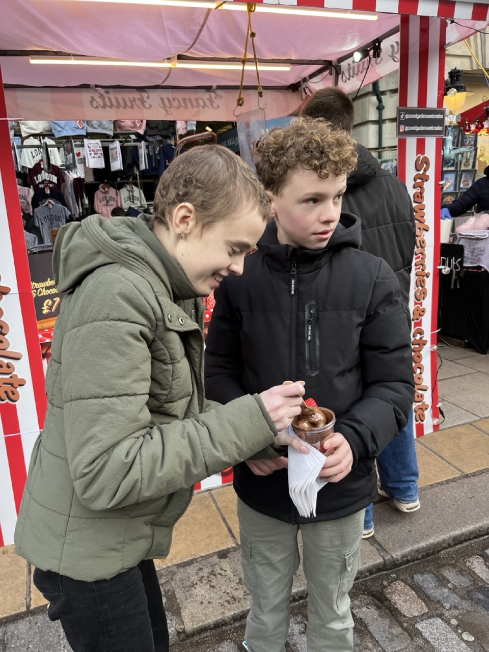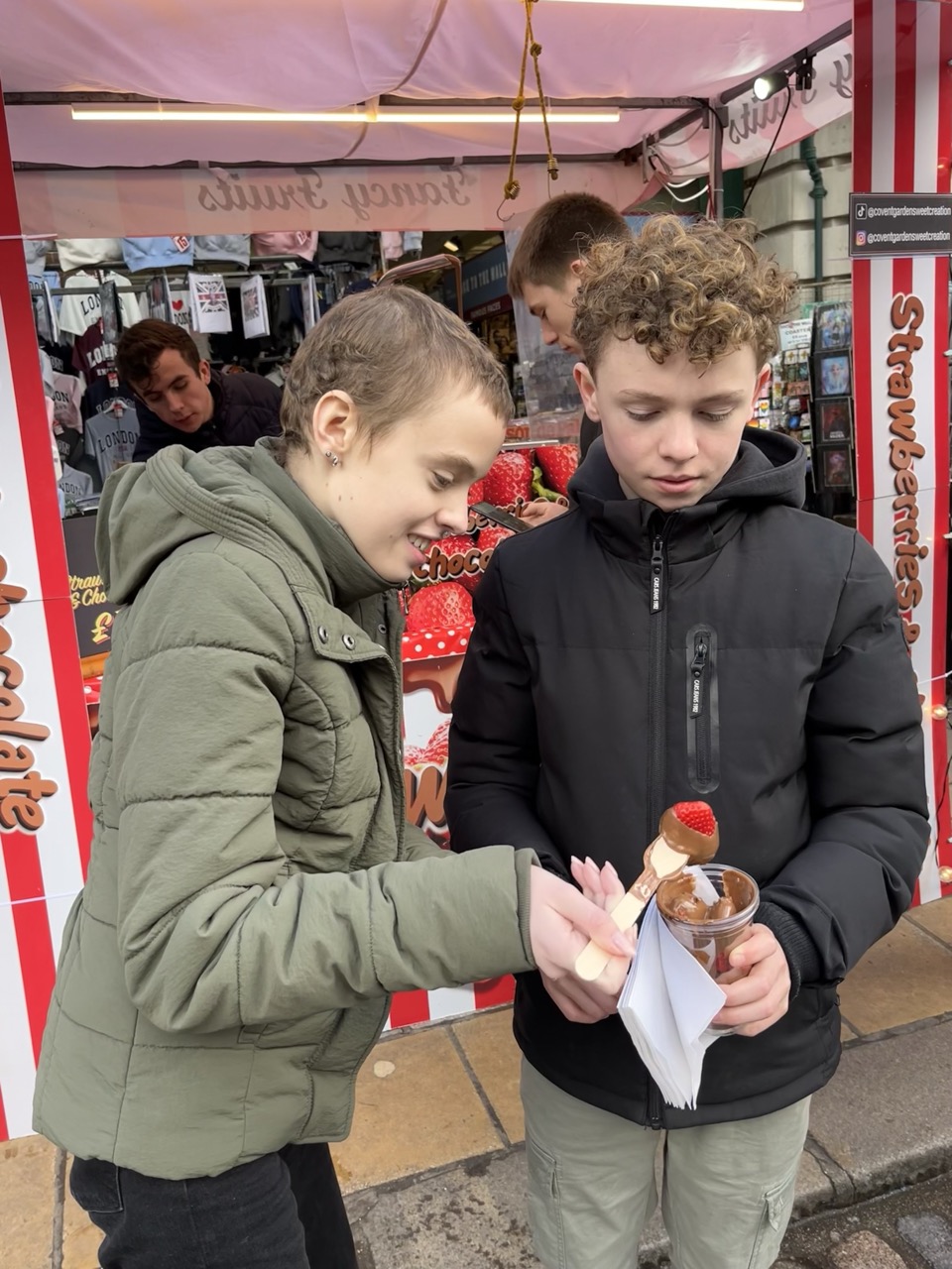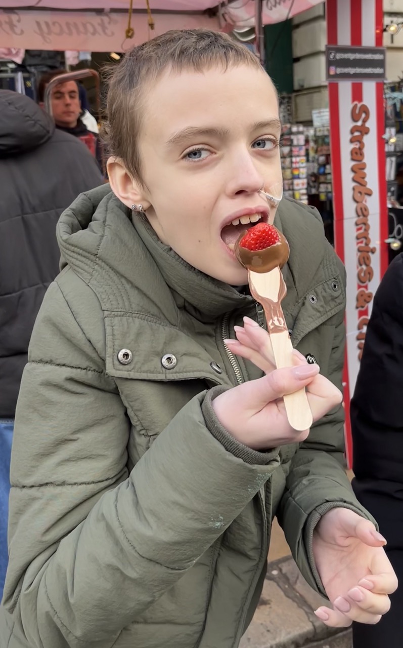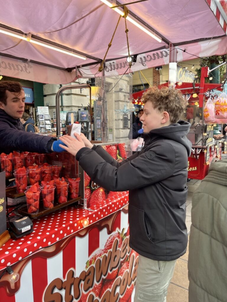 Na een rustige start van deze dag gaan we op pad. Het plan is om vandaag in de buurt de omgeving lopend te verkennen. Als we onderweg iets leuks zien lopen we naar binnen en zo staan we binnen 5 minuten al in de wizzarding world van Harry Potter. Via Trafalgar’s square gaan we richting Covent Garden. De belangrijkste winkel daar is Glossier waar we absoluut naar binnen moeten. Ze koopt daar een veel te dure maar wel hele mooie mascara. Helemaal blij. We lopen over de markt van Govent Garden, zien verschillende (muzikale) optredens van straatartiesten, gewoon gezellig. Enige minpuntje is dat de straten daar soms echt heel vervelend zijn voor de rolstoel waardoor Anne best wel veel pijn begint te krijgen. Tijd dus om zoek te gaan naar iets waar we kunnen eten. Het moet gezellig zijn en er typisch Engels uitzien. Op de vraag van Stan en Anne wat dan typisch Engels is moet ik het antwoord eerlijk gezegd een klein beetje schuldig blijven en kom niet verder dan dat de buitenkant van hout moet zijn en vanbinnen een beetje een donkerbruin gebeuren. Duurt niet lang voordat we zoiets hebben gevonden bij All Bar One. We ploffen neer op de (donkerbruine) banken en bekijken het menu; Heerlijk, dit gaat goed komen. We bestellen 2 chicken & bacon focaccia en eggs royale with muffin en dan delen we samen. Het is heerlijk, ook Anne eet gelukkig best wel wat en het is fijn om even te zitten en te genieten van het heerlijke eten.