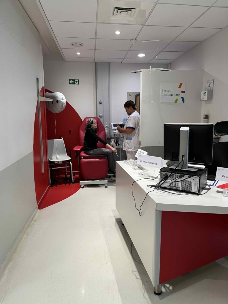 Stipt om half 10 vertrekken we zoals van tevoren met elkaar afgesproken naar het ziekenhuis. Tijd voor ontbijt is er helaas niet. In het ziekenhuis zouden we eerst een gesprek hebben met de diëtiste en daarna met dokter Minard maar het wachten duurt lang. Ondertussen heb ik frequent mail contact met Sassia maar iets over tienen krijg ik te horen dat we zonder paspoort niet mogen vliegen en dat we dus met de trein zullen moeten. Sassia denkt dat het maar een half uur met de taxi naar Gare du Nord is maar onze Google Maps geeft 55 minuten aan. Ze boekt uiteindelijk een taxi die ons om 11:50 uur komt ophalen bij het RMD. Krap krap krap allemaal. In overleg met Anne besluit ik terug te gaan naar het RMD om de financiële afwikkeling te doen zodat we dat gehad hebben en dan probeer ik op tijd terug te zijn voor het gesprek met Dr. Minard. Ik ben echter nog niet bij het RMD of ik krijg een berichtje van Anne dat ze de planning hebben omgegooid en dat dokter Minard net bij Anne was voor het gesprek. Zucht. De dokter gaat nu eerst een ander gesprek aan en dan hebben wij het gesprek. Nog meer haast dus. In het RMD betaal ik de rekening en we besluiten de controle van de kamer te doen nadat we uit het ziekenhuis terugkomen, dat zou in principe zo gepiept moeten zijn. Snel terug naar het ziekenhuis.