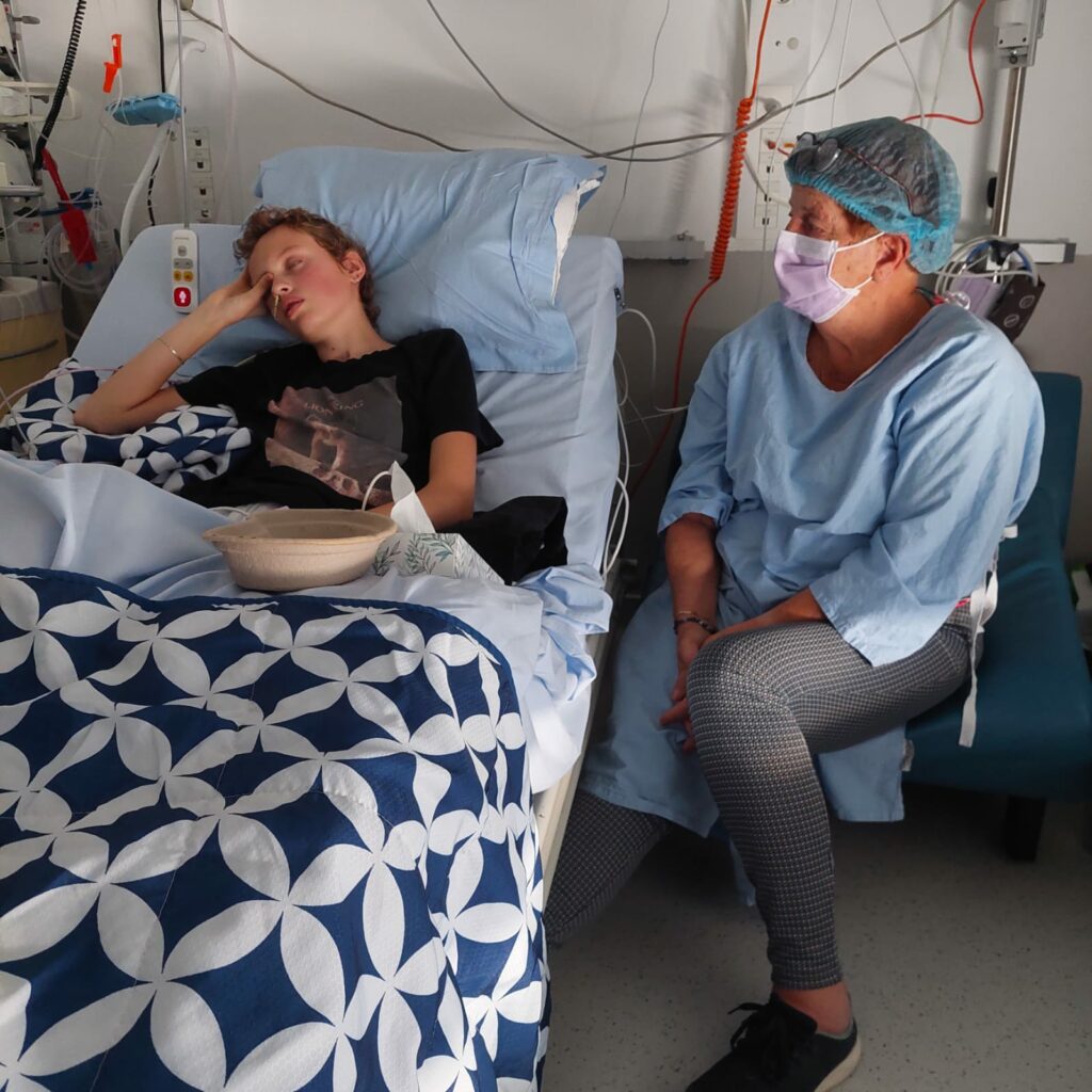 Vanochtend ben ik eerst met Anita naar Anne gegaan. Het was geen geweldige ochtend. De koorts was er nog steeds en was er ook de hele nacht geweest. Gelukkig geen hele hoge koorts en aangezien de bloedwaarden op dit moment okay zijn gaan ze verder niet echt iets doen behalve dan paracetamol geven om de koorts te verlagen. Ook is en blijft ze misselijk. Uiteindelijk heeft Anne vandaag best wel veel overgegeven. Overdag is de sondevoeding opnieuw maar kort aangesloten geweest omdat Anne meteen weer heel erg misselijk werd en/of moest overgeven. De pijn is zeker niet weg maar wel iets beter te verdragen dag gisteren. Uiteindelijk heeft Anne afgelopen nacht ook nog best redelijk geslapen. De controles gaan vandaag ook weer goed. Het douchen doet ze vandaag voor het eerst samen met Anita en dat ging ook prima. Wel was Anne (zoals altijd eigenlijk) na het douchen volledig uitgeput.