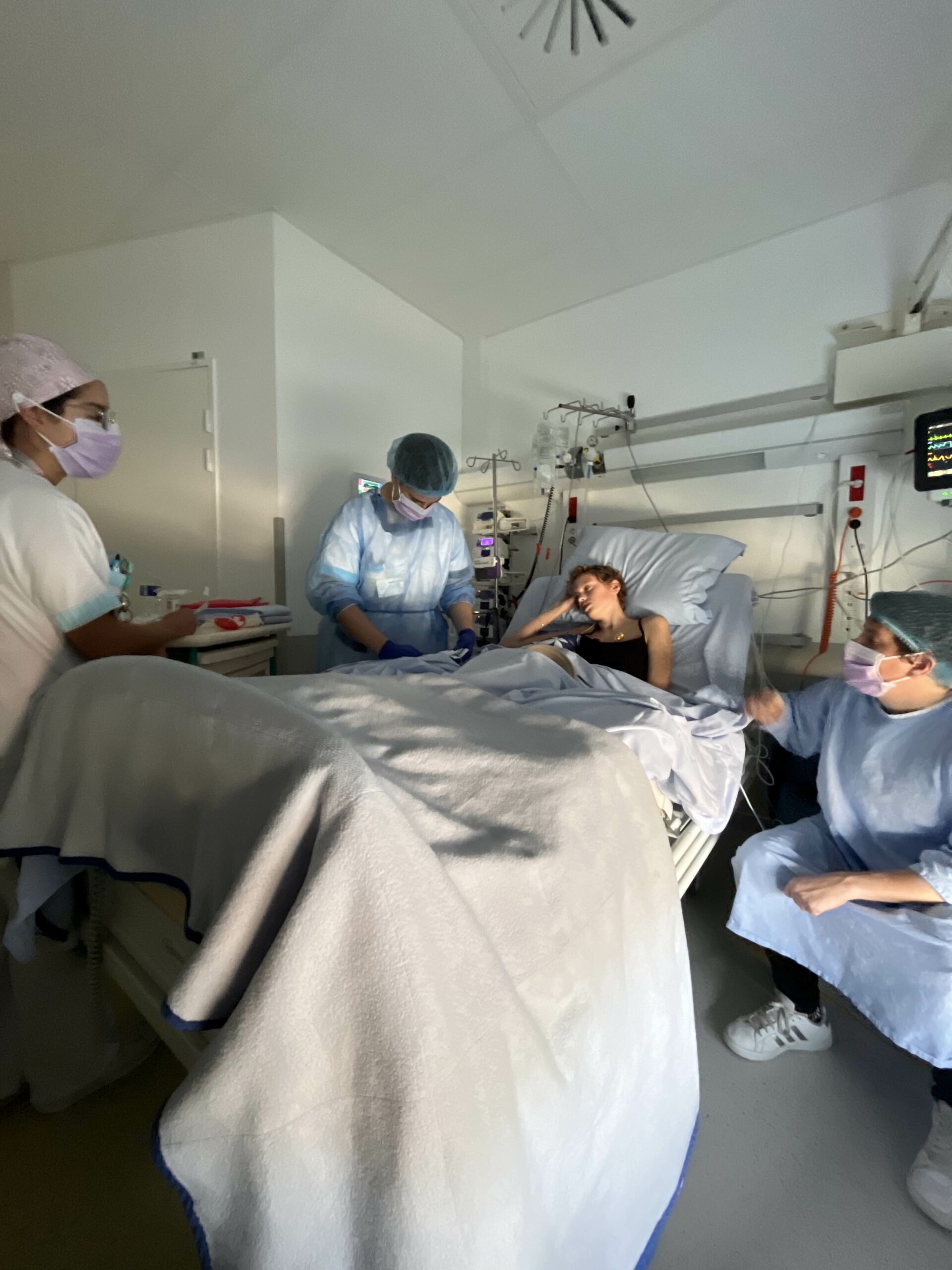 Een zuster kwam de bobbel op haar borst meten, die was wat gegroeid (door de oncoloog is van tevoren al aangegeven dat de tumorcellen door de behandeling eerst kunnen gaan groeien en daarna weer kleiner zouden moeten worden). De zuster luisterde daarna nog even naar haar longen.