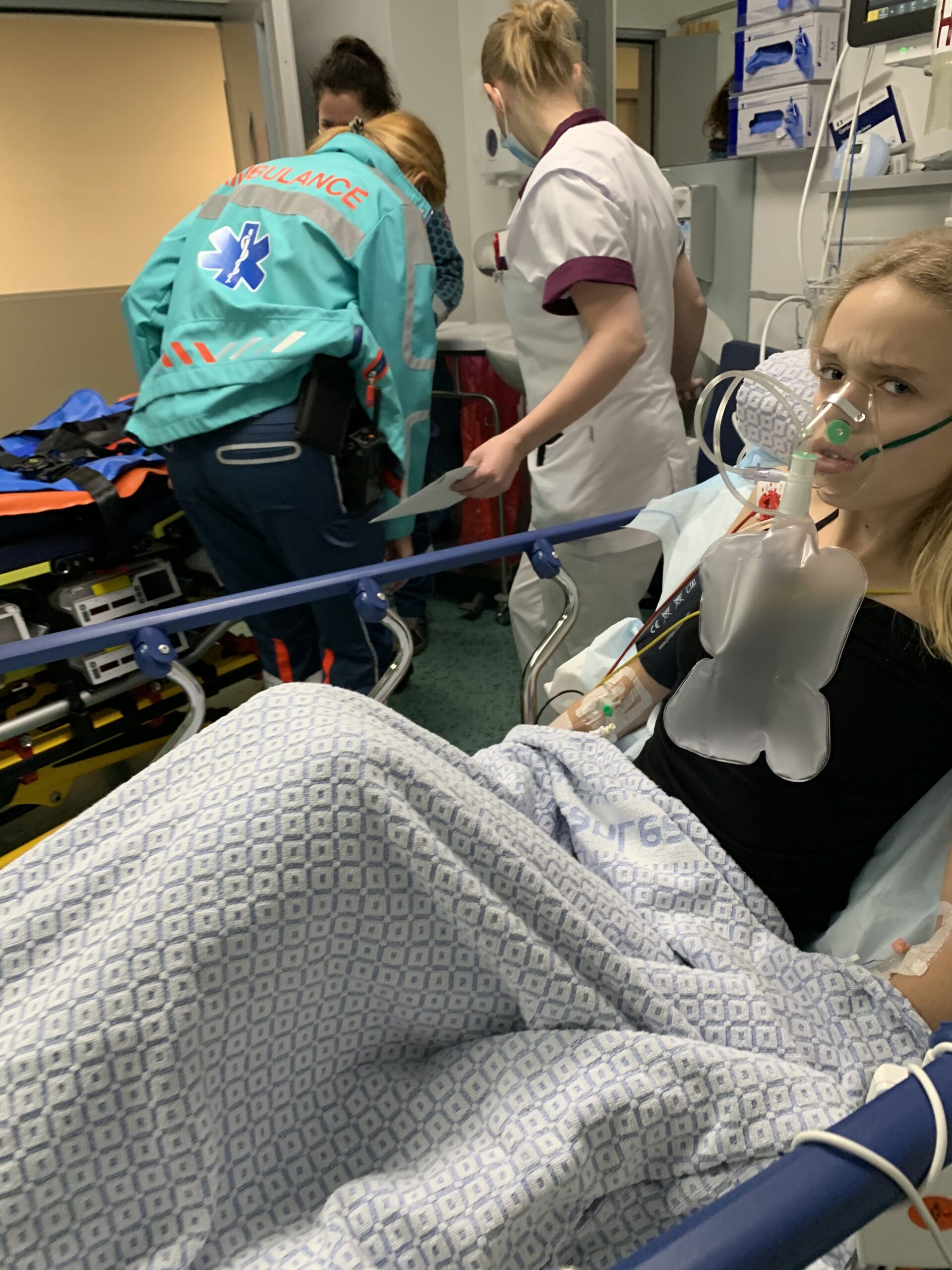 Ondertussen wordt er druk overlegd maar we hebben in eerste instantie eigenlijk geen idee waarover maar het blijkt dat ze aan het uitzoeken zijn in welk ziekenhuis Anne het best geholpen kan worden. Ze denken eerst aan Rotterdam maar al snel kiezen ze voor Utrecht. Ambulancepersoneel komen binnen met een brancard en is het een bedrijvigheid van jewelste. Anne wordt op de brancard gelegd en samen lopen we naar de ruimte waar de ambulance staat. In de ambulance krijgt Anne een aapje als knuffel en die zal (zo blijkt later) een dierbare herinnering zijn gedurende haar verblijf in het ziekenhuis. Terwijl we nog bezig zijn komt Anita er net aan rijden. Gelukkig!