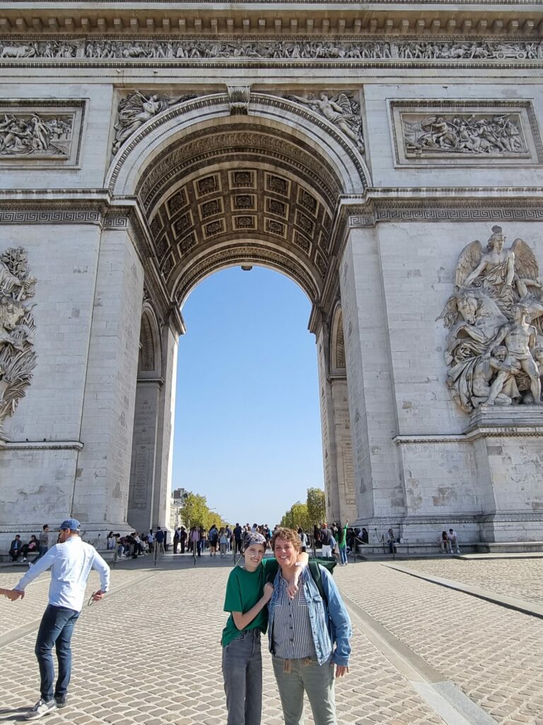 Anne wilde er graag tussenuit. Bert een taxi opgezocht die we konden nemen en niet zo duur was. Het is eigenlijk maar 30 minuten van Villejuif naar centrum Parijs maar we deden er 50 minuten over. Een hele aardige taxibestuurder zette ons af bij de Arc de Triomphe. Daar mocht hij helemaal niet staan, maar vlug, vlug eruit. De Arc de Triumph maakte wel indruk op Anne en we bezochten het graf van de onbekende soldaat met de eeuwigdurende vlam. We keken rond en dachten hoe komen we aan de overkant. Ja via de trap naar beneden maar dat is niet handig met een rolstoel. Er kwamen twee heel erg vriendelijke politieagenten en vroegen of ze konden helpen. Ze hebben voor ons het verkeer stilgezet zodat wij de rotonde konden oversteken. Best handig want bij de trap was het heel druk en ik denk niet dat er veel mensen zijn die kunnen zeggen dat ze die rotonde hebben overgestoken.