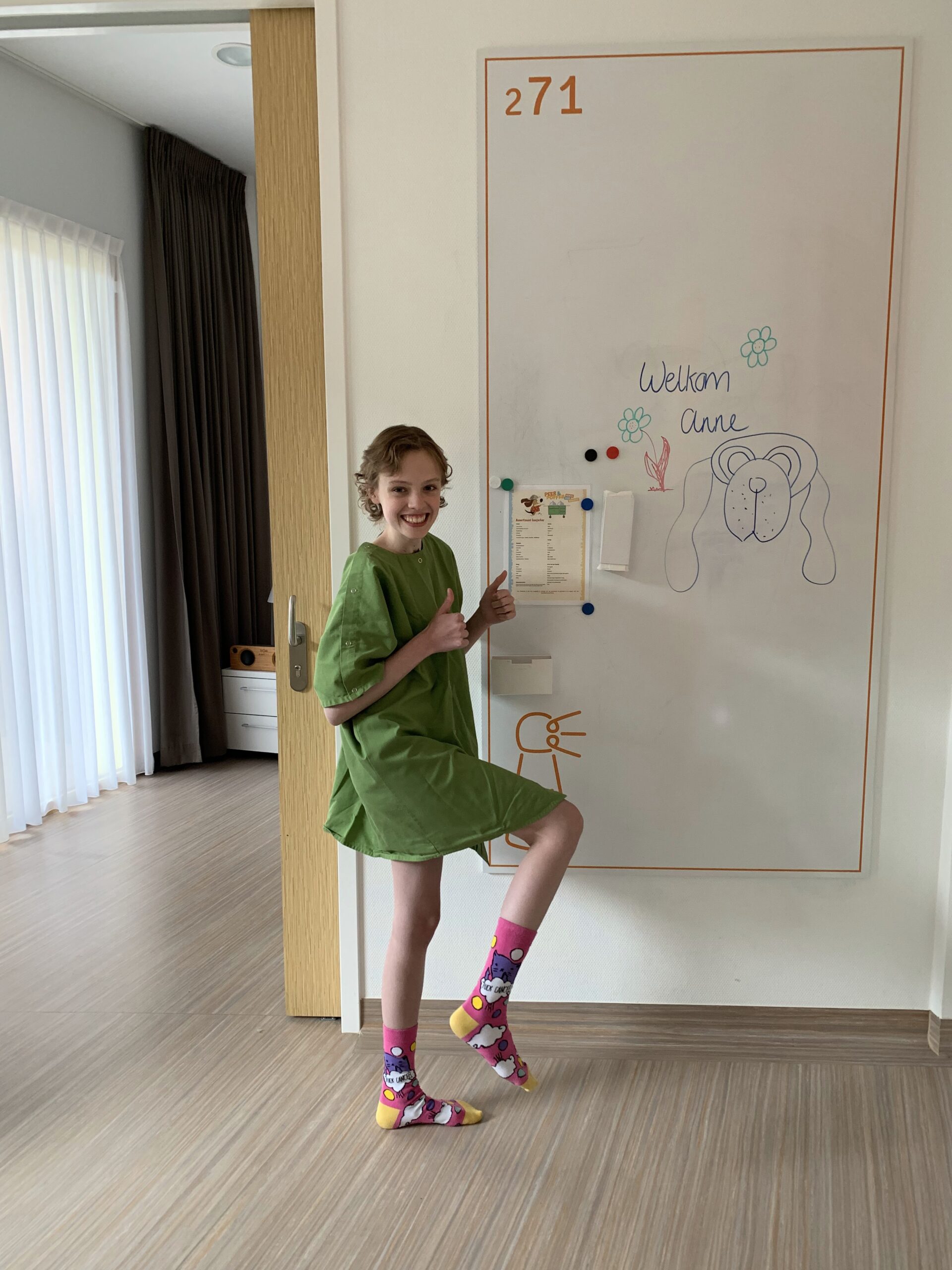 Vanochtend om kwart voor 7 al met Anne naar het PMC vertrokken. Vroeg! Anita bleef nog even bij Stan totdat hij naar school gaat en dan komt zij ook naar het ziekenhuis. In het PMC krijgt Anne meteen een kamer (271) op afdeling Vuurtoren. Dat was de enige afdeling waar ze nog niet was geweest dus ook wel weer leuk. Dokter van de Ven (chirurg) komt langs om uitleg te geven over de opties die Anne heeft voor het semipermanente infuus. Het wordt of een Hickman katheter of een Port-a-Cath. Anne heeft in het ziekenhuis al een aantal keren een Hickman gehad maar die moest er steeds uit vanwege een infectie. De Port-a-Cath is nieuw voor Anne en daar is ze dan ook een beetje bang voor. Een kastje onder je huid klinkt eng maar dokter van de Ven gaf aan dat hij denkt dat de PAC het fijnst is voor Anne. Je ziet er eigenlijk niets van, minder kans op infecties en je mag ermee zwemmen. Anne kiest daarom voor de PAC. Daarna heeft Anne nog even gezellig gekletst met dokter van de Ven. Ze geeft aan dat ze haar haar paars gaat verven. Vond hij een goede keuze en toen hij de kamer verliet zei hij dat hij Anne morgen zou komen uitzwaaien en dat dan misschien ook maar met paars haar moest komen doen. Deal! Dokter van de Ven is echt de aardigste en liefste dokter, prachtige kerel en een fantastische klik tussen hem en Anne (en ons).