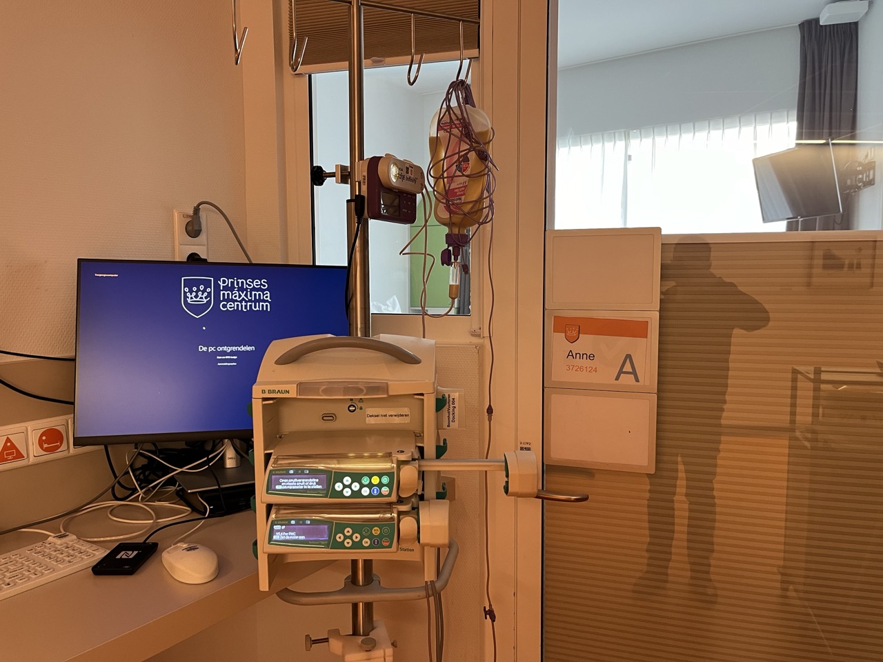 Om 13:00 uur gaat het echt niet goed, de noodbel wordt door de verpleegkundige ingedrukt en in no time staat de hele kamer vol. Dokter Merks is er, pijndokter Burggraaf, meerdere verpleegkundigen en het is duidelijk dat het helemaal foute boel is. Ik app Anita waar ze blijft. Ze was er bijna gelukkig. Er wordt driftig overlegd en in razend tempo een infuus aangelegd wat in 1x goed gaat. Via dit infuus wordt handmatig morfine toegediend. Dokter Merks geeft aan dat nu de eerste en eigenlijk enige prioriteit is Anne comfortabel te krijgen. Ondertussen wordt er driftig berekend hoeveel morfine gegeven moet worden via een pomp. Anne valt in een diepe slaap, haar lichaam werkt nog steeds enorm hard om zuurstof binnen te krijgen. Dokter Merks luistert even naar de longen en geeft aan dat er bijna niets te horen is, dat ze nauwelijks zuurstof binnenkrijgt. Dokter Merks blijft rustig en legt heel duidelijk uit wat er allemaal gebeurd maar tegelijkertijd zie je dat iedereen heel erg geraakt is door wat zich in een paar minuten heeft afgespeeld. Anita komt nu ook binnen en dat is enorm schrikken voor Anita omdat zij nog denkt dat ze ons komt ophalen om naar huis te gaan maar het is meteen duidelijk dat het ineens allemaal anders is. Dokter Merks legt uit dat het voor ons omstanders heel naar is om te zien hoe Anne naar adem snakt maar dat Anne daar niets van merkt en rustig is. Wel geeft dokter Merks toe dat ook hij het even moeilijk heeft met wat hij ziet.