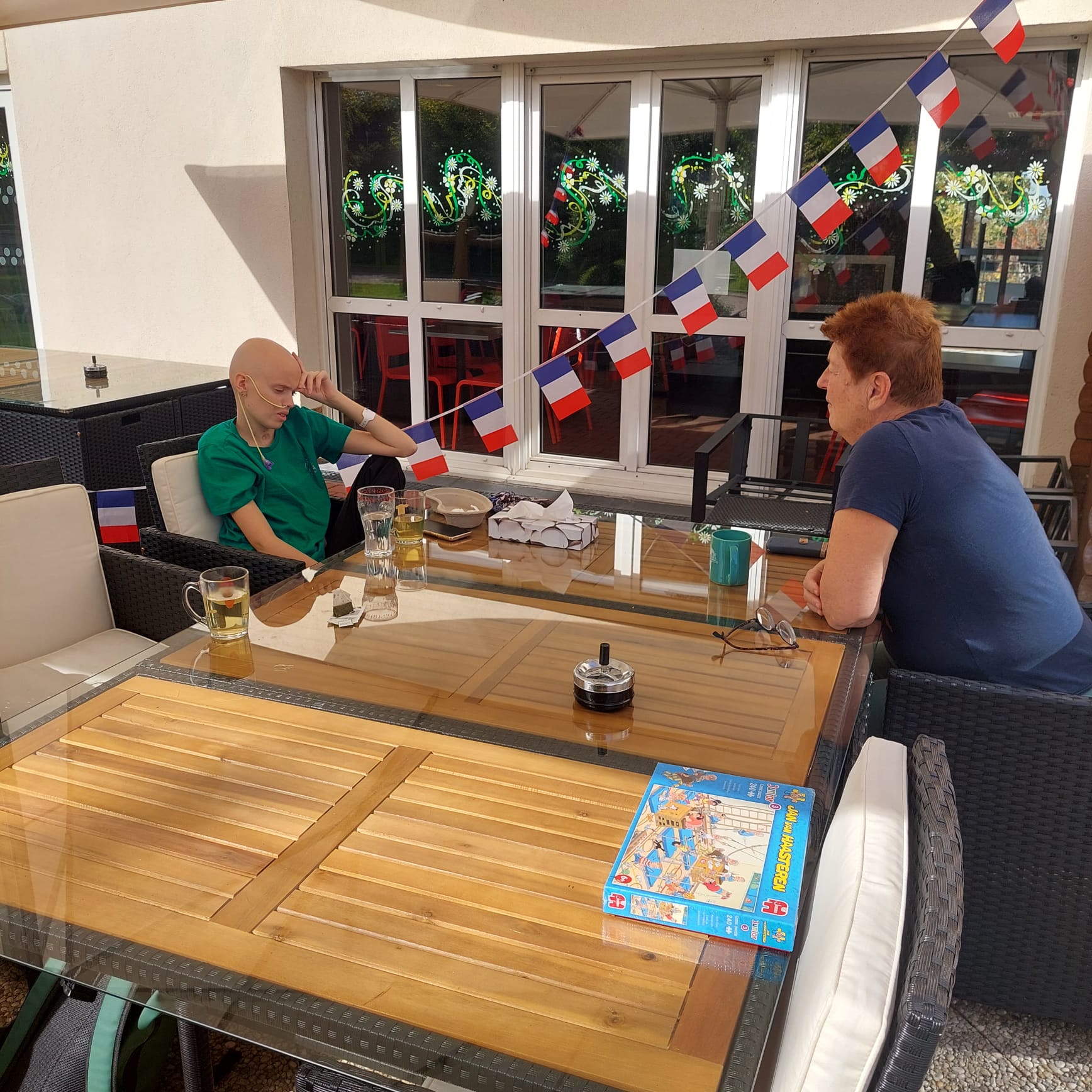 Na de gezellige dag van gisteren moest Anne het vandaag bezuren. Ze was de hele dag niet lekker, overgeven en ontzettend moe. Ze sliep vanochtend uit, maar werd vervelend wakker. Het lukte vandaag allemaal niet. Het weer is hier prachtig dus wel even in de tuin gezeten, maar ook dat was van korte duur, Anne ging liever naar de bibliotheek waar een heerlijke bank staat. Anne deed nog even een dutje en Anita en ik maakte de legpuzzel van Jan van Haasteren. Deze puzzel heeft maar 240 stukjes, kinderachtig volgens Anne, maar we zijn er best een tijdje mee bezig geweest en ook Anne hielp op het laatst mee.